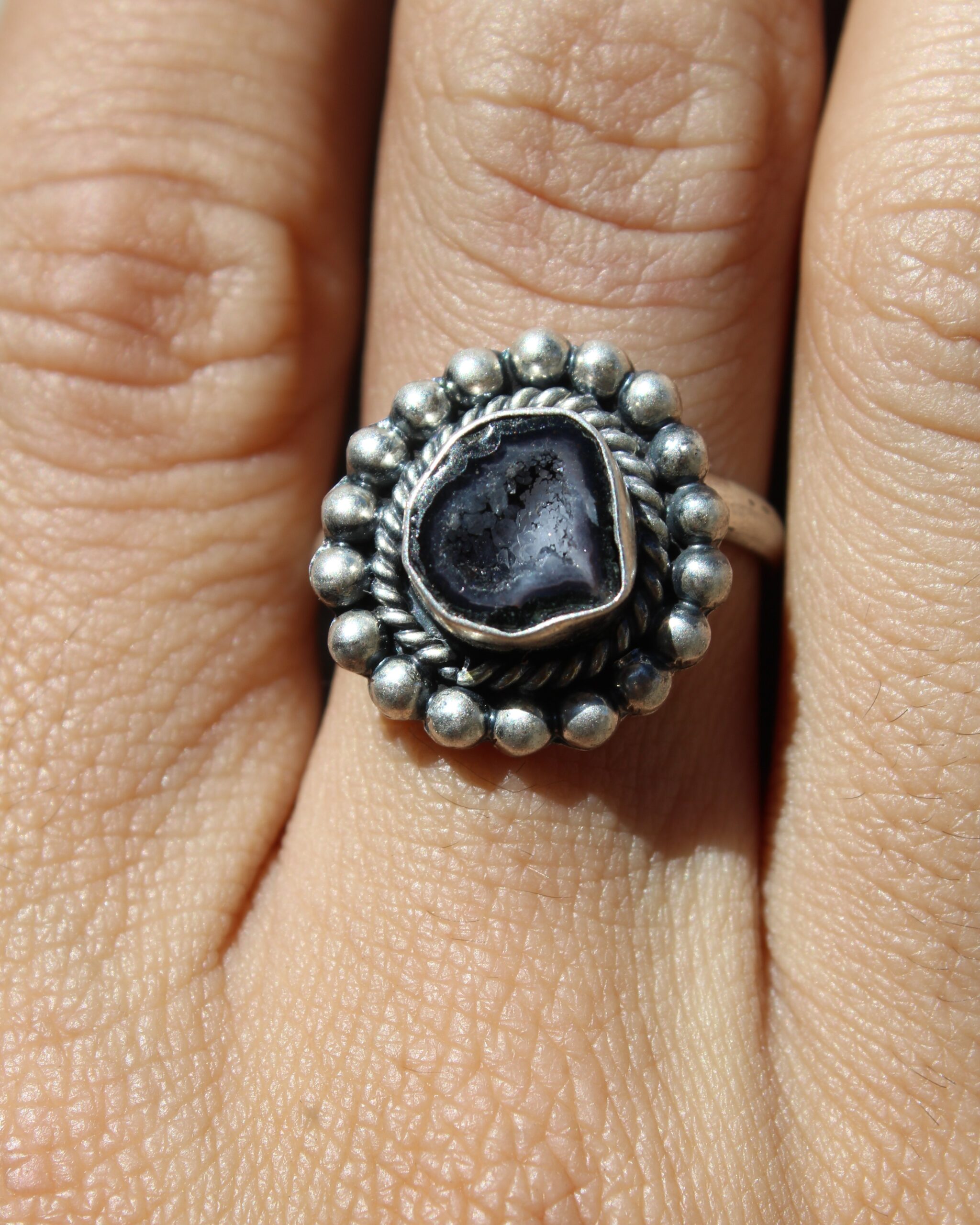 Anillo ajustable de plata .925, con geodita circular, realzada por un diseño tipo cuerda que aporta textura y un aire artesanal.