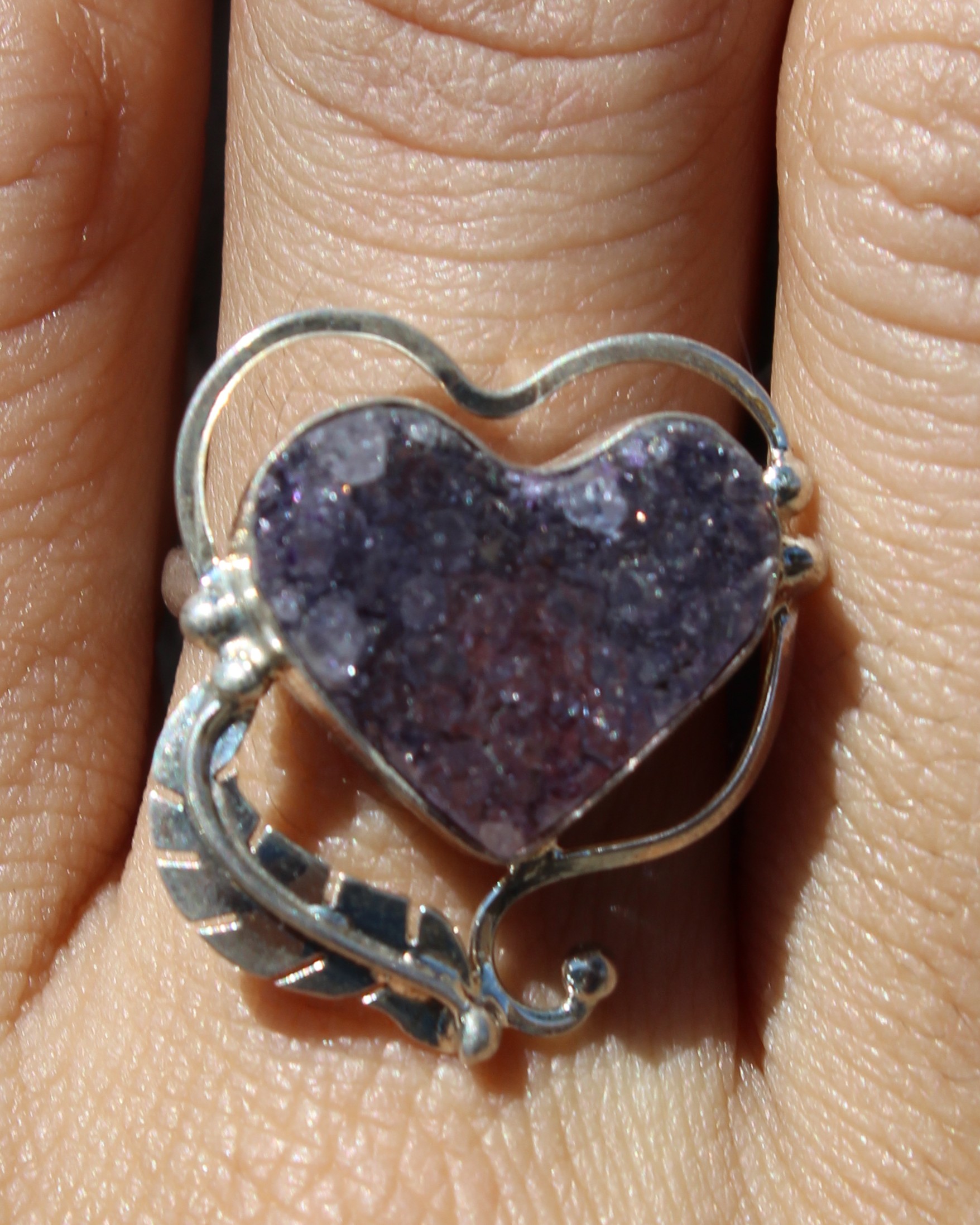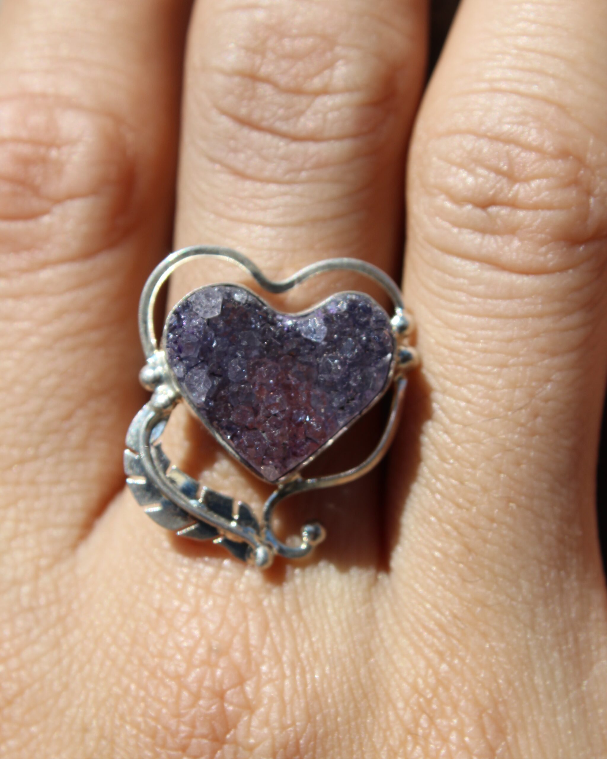 Resalta tu estilo con este anillo ajustable de plata .925, diseñado con geodita de amatista en forma de corazón.
