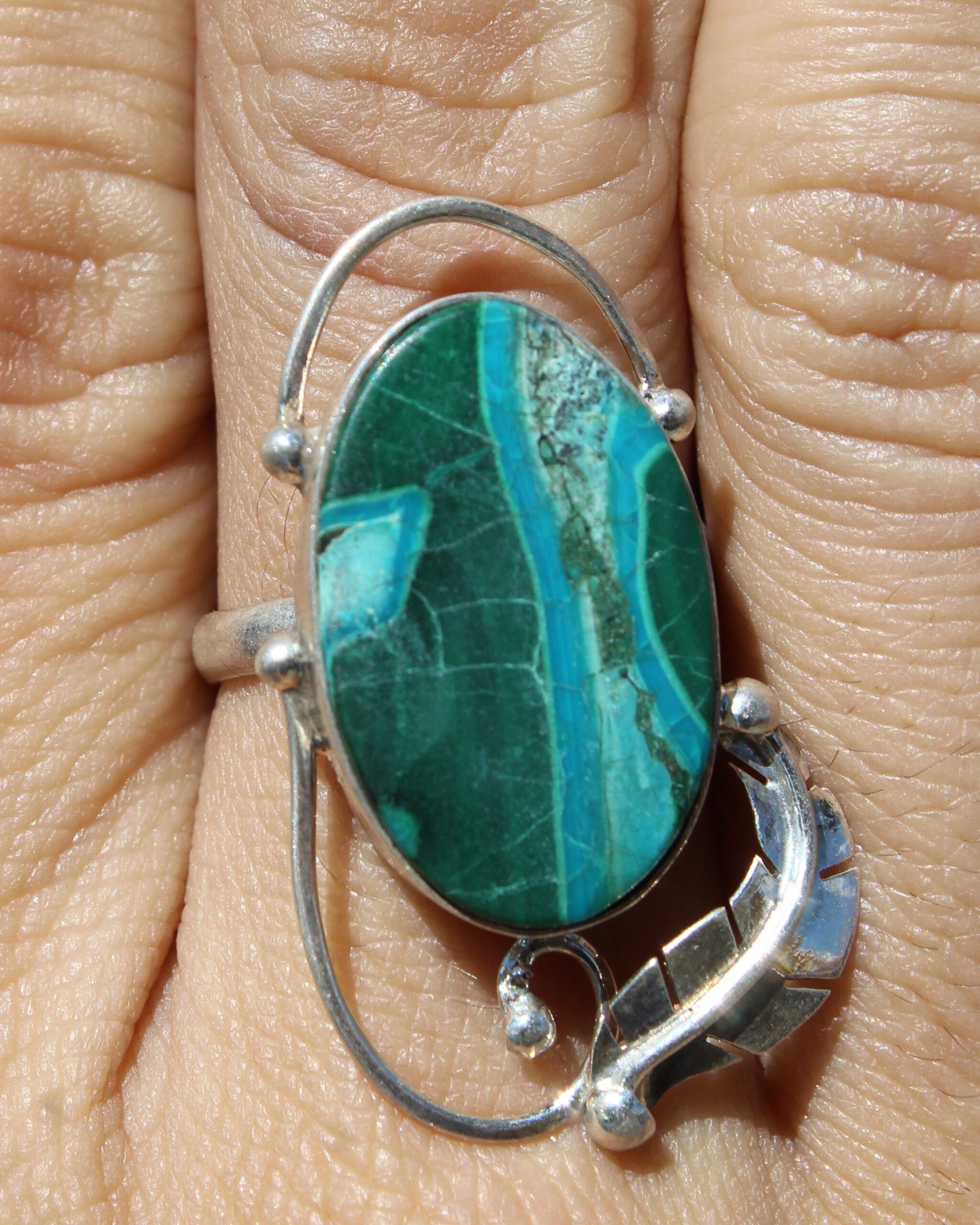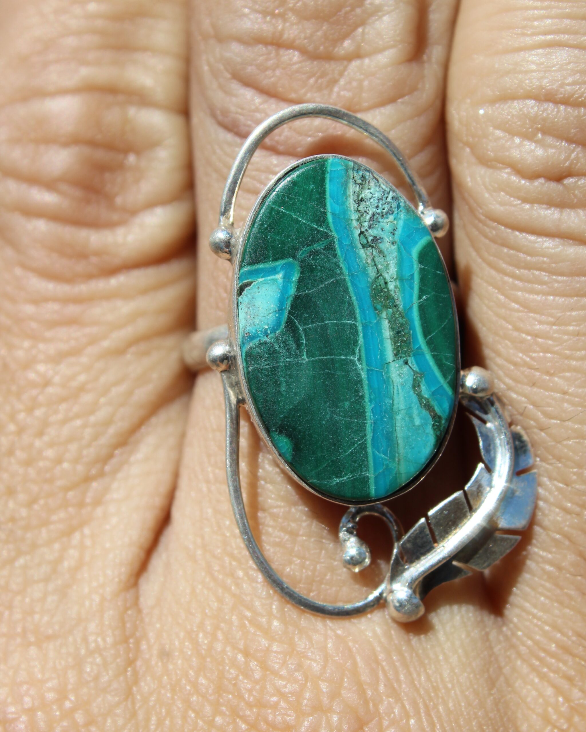 Anillo ajustable de plata .925, con malaquita de forma ovalada, adornado con un detalle de pluma que aporta un aire natural.