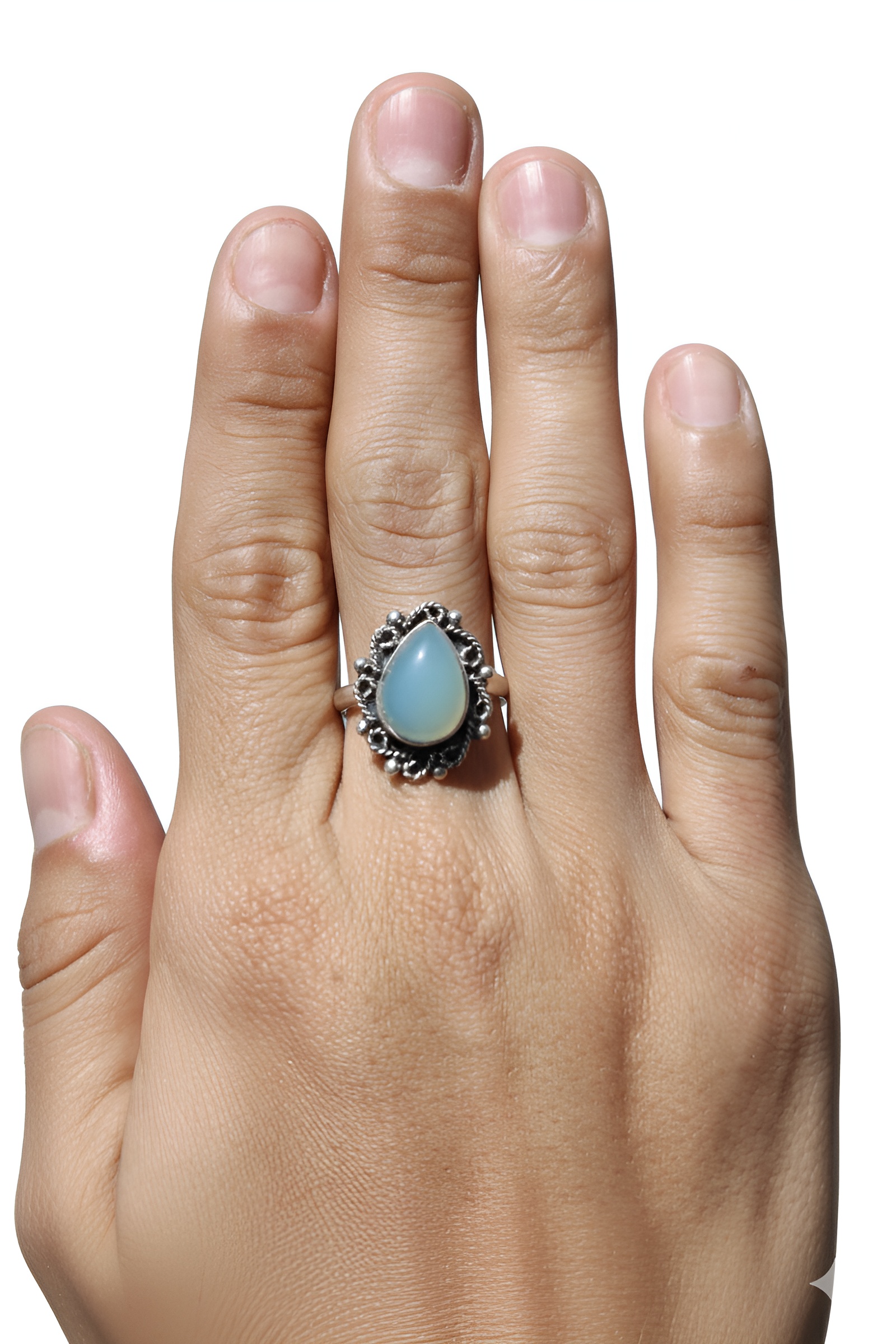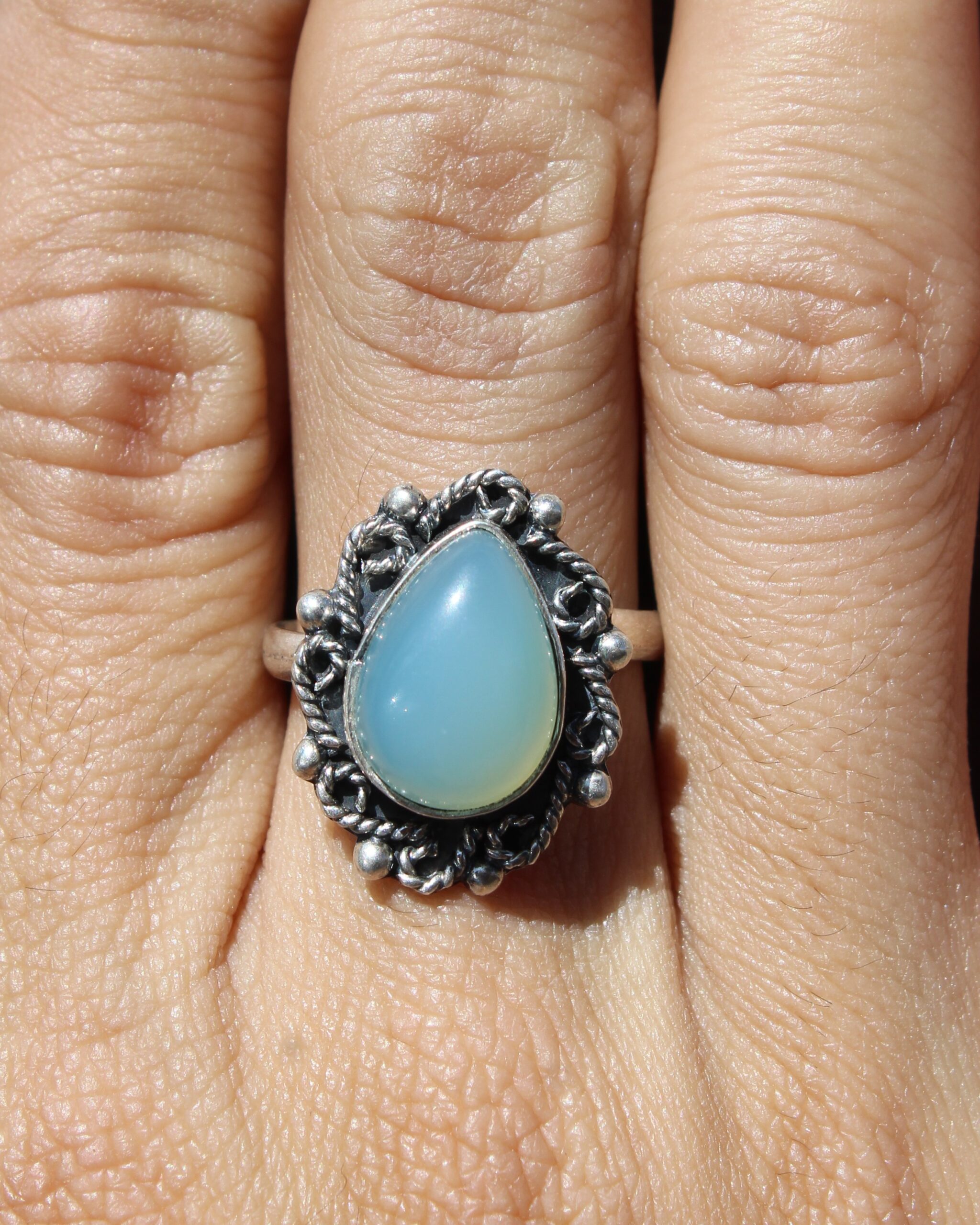 Anillo ajustable de plata .925, aguamarina en forma de gota, que resalta por su color claro.