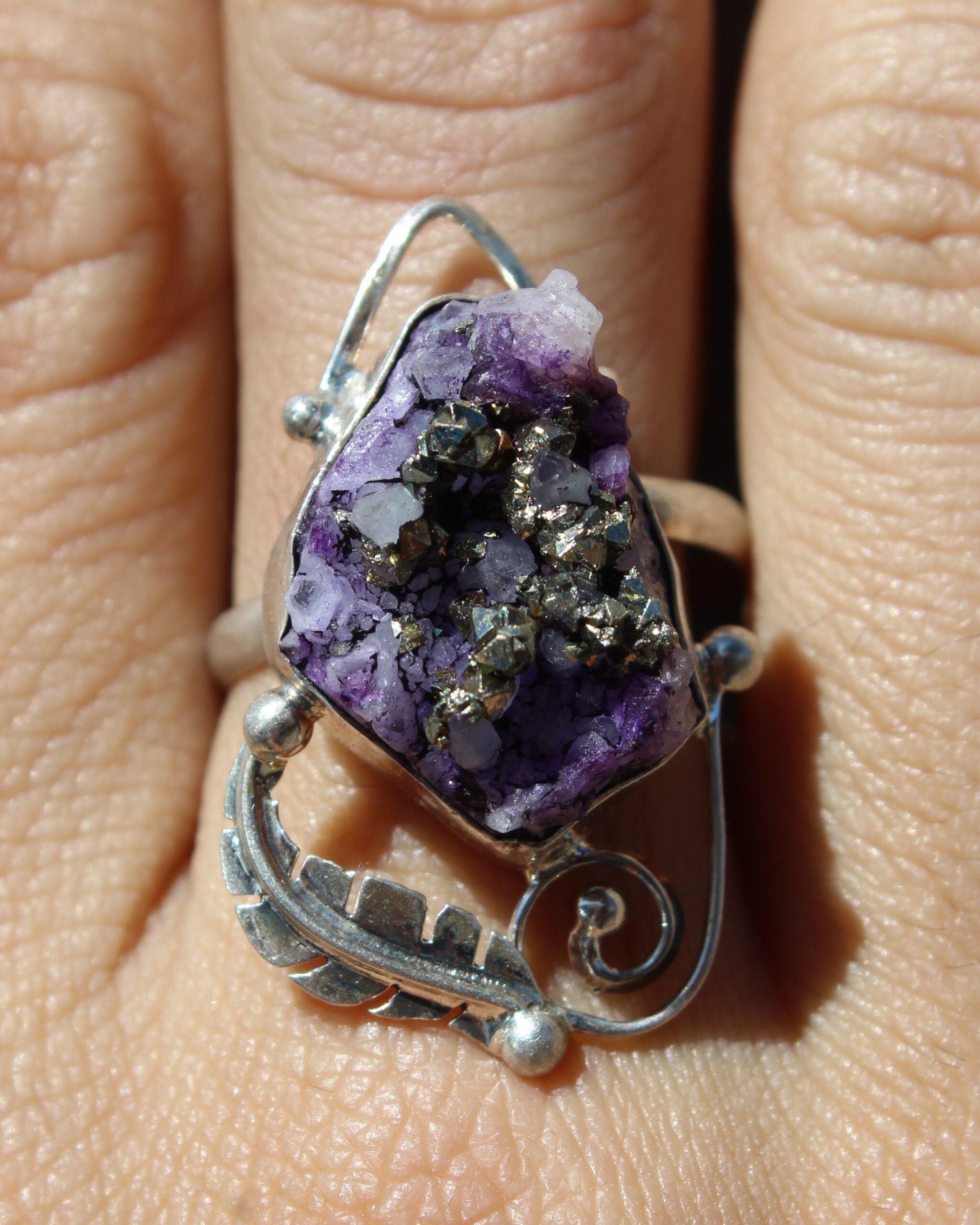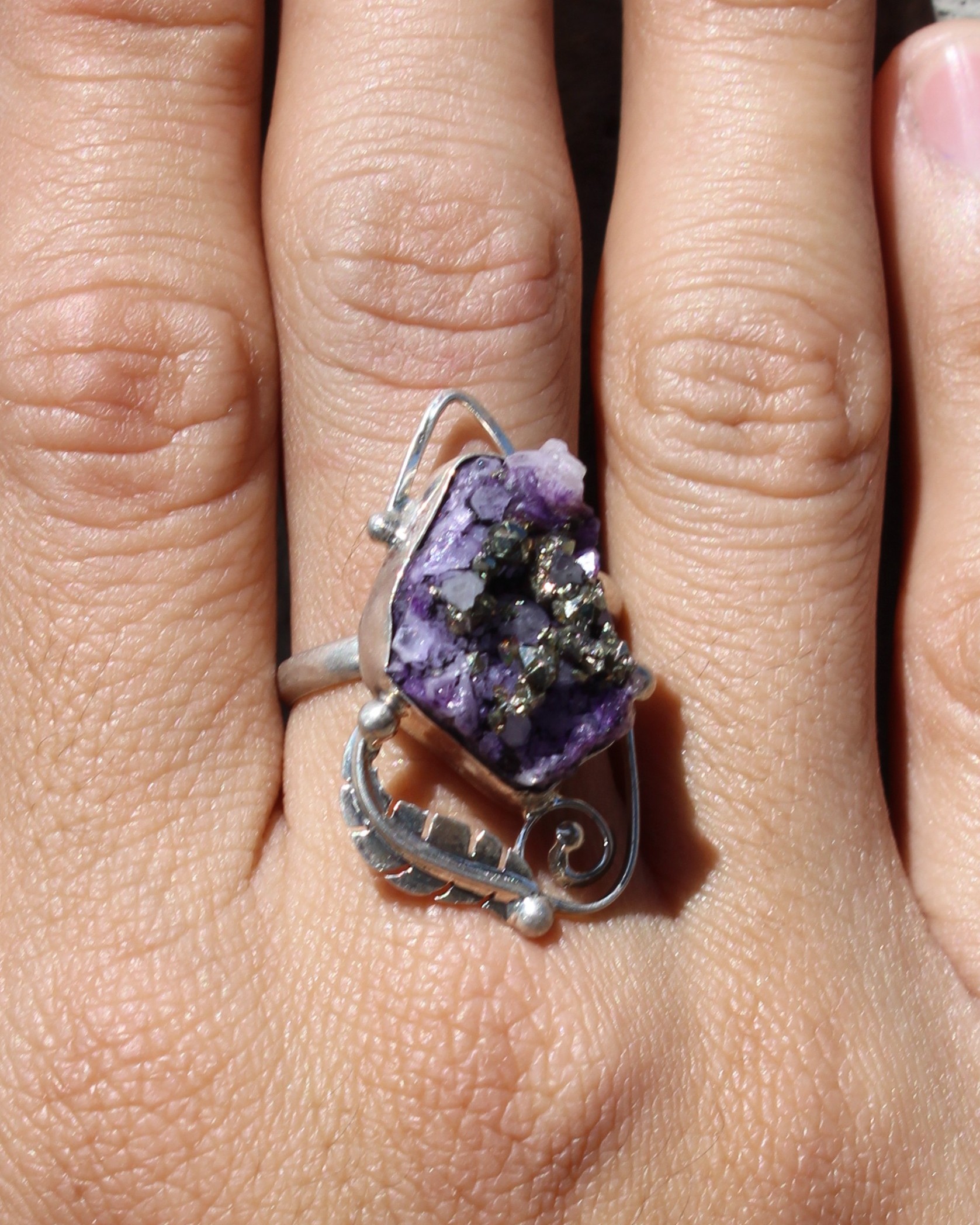 Completa tu look con este accesorio perfecto: anillo ajustable de plata .925, engarzado con geodita de amatista y detalles de pirita, en una elegante forma ovalada.