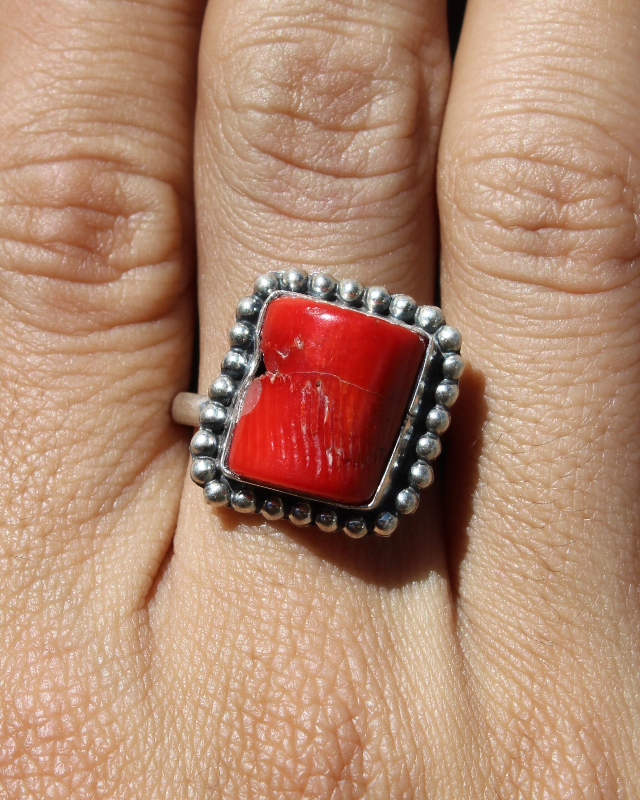 Anillo ajustable de plata .925, color coral de forma cuadrada, realzado con bolitas decorativas Una pieza vibrante y con personalidad propia.
