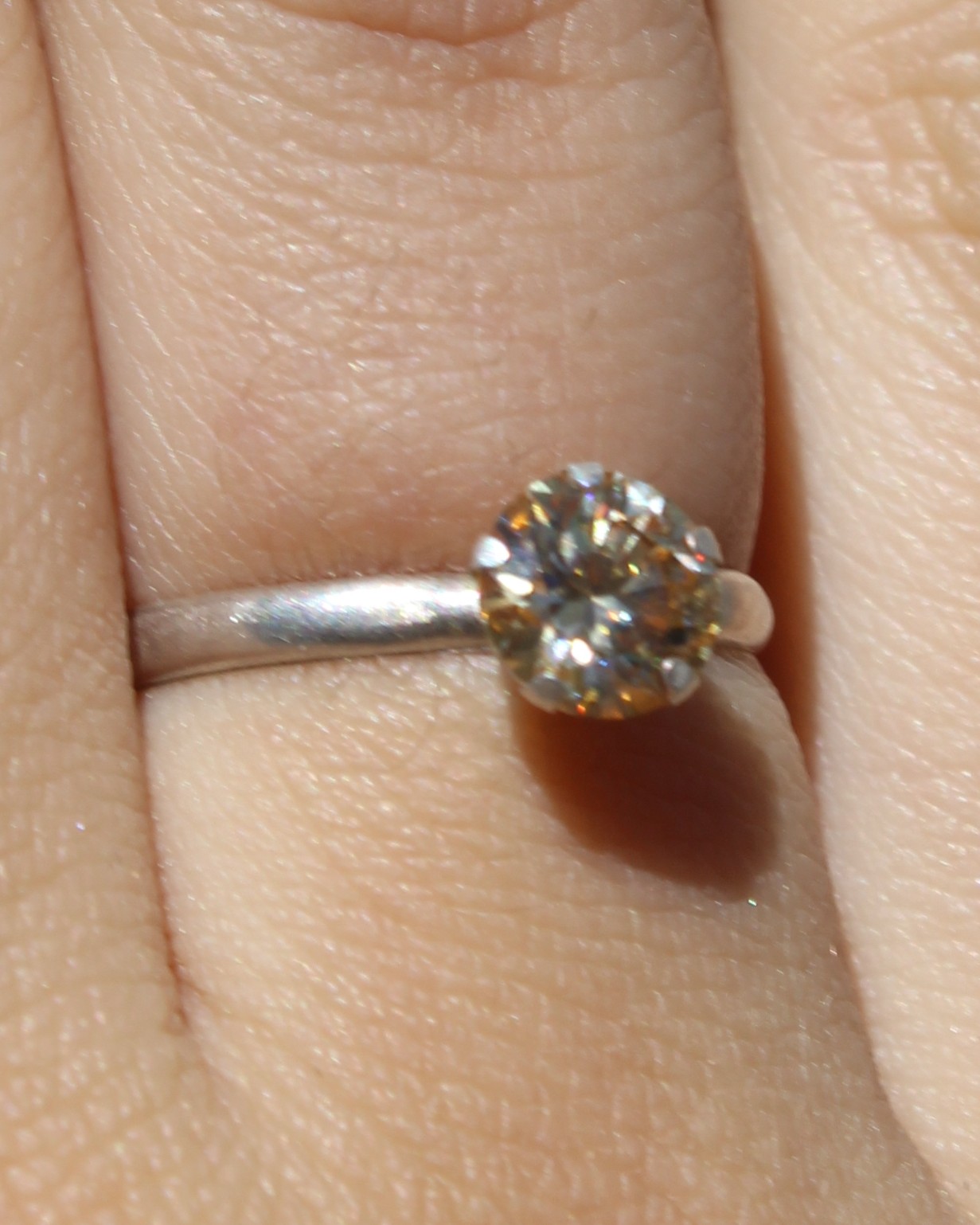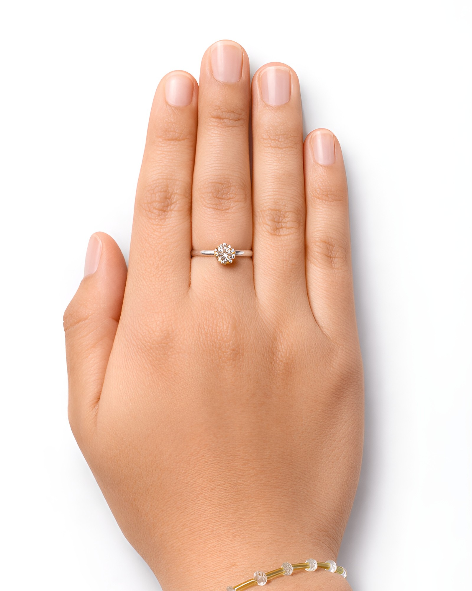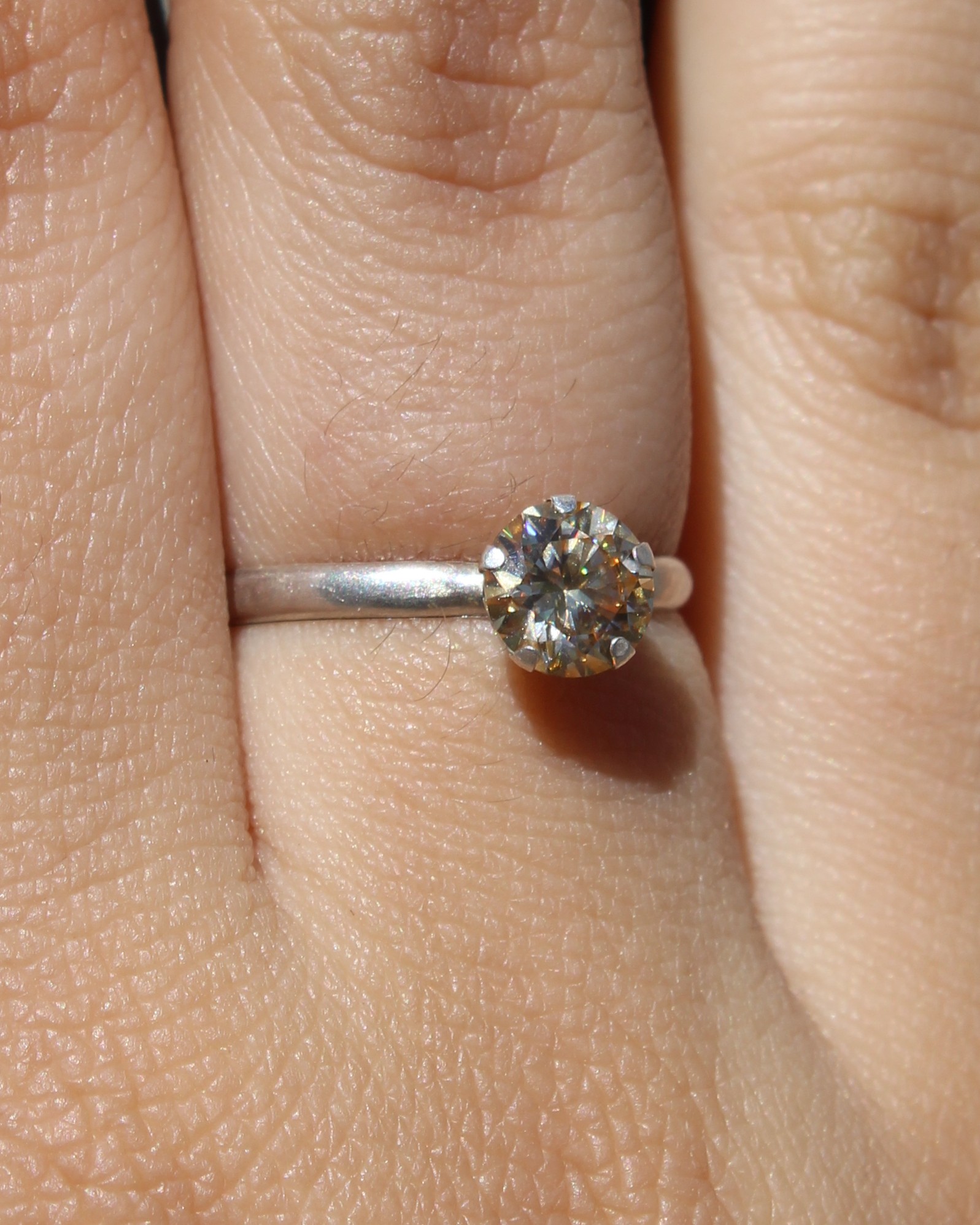 Anillo de plata .925, de diseño delgado, con moissanita, en talla número 6.5. Una pieza fina y luminosa.
