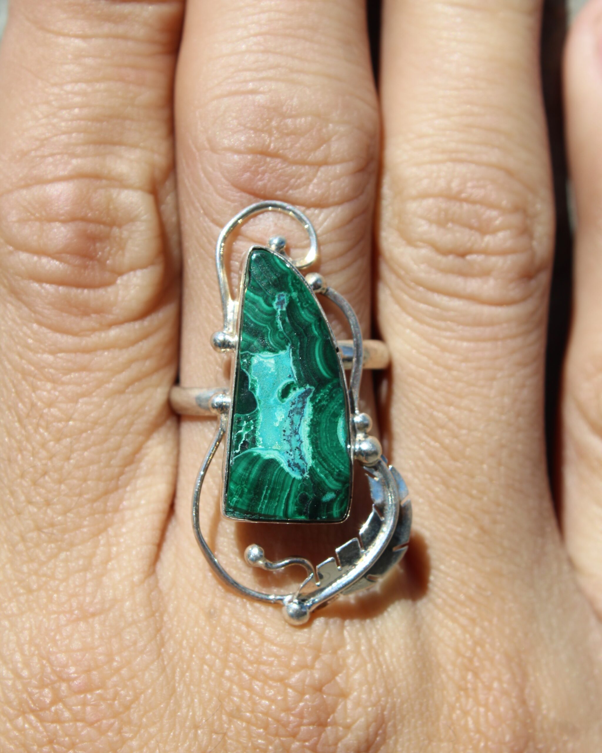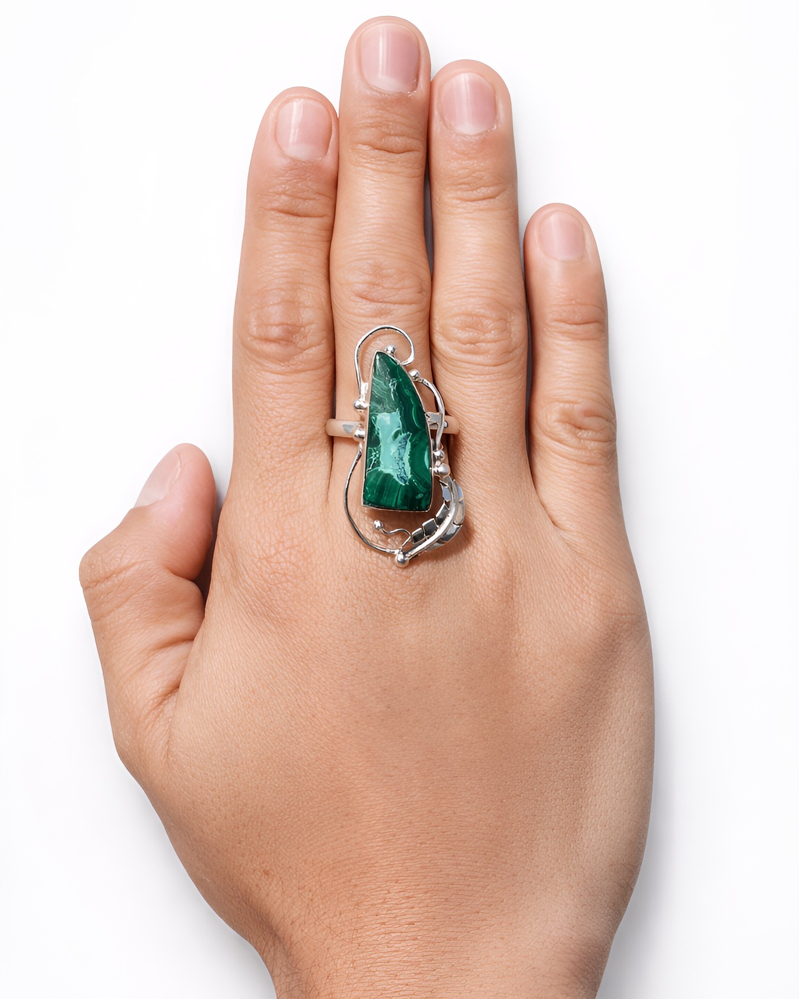 Anillo ajustable de plata .925, con malaquita en forma de colmillo, que resalta por sus vetas verdes y su diseño audaz.