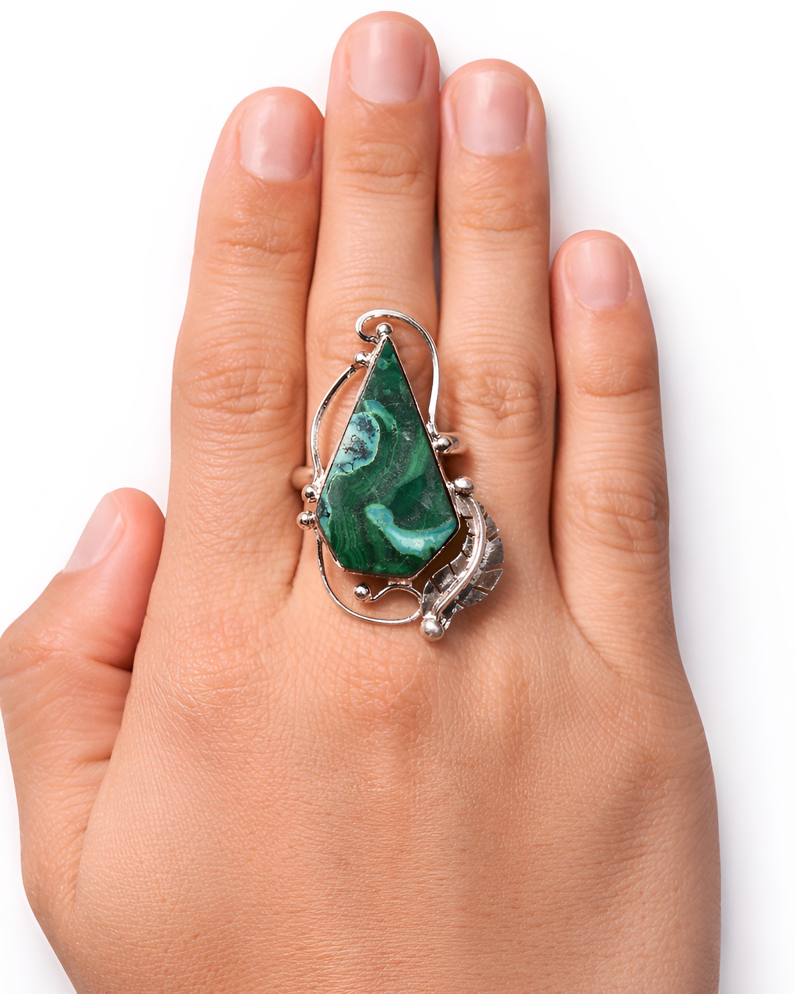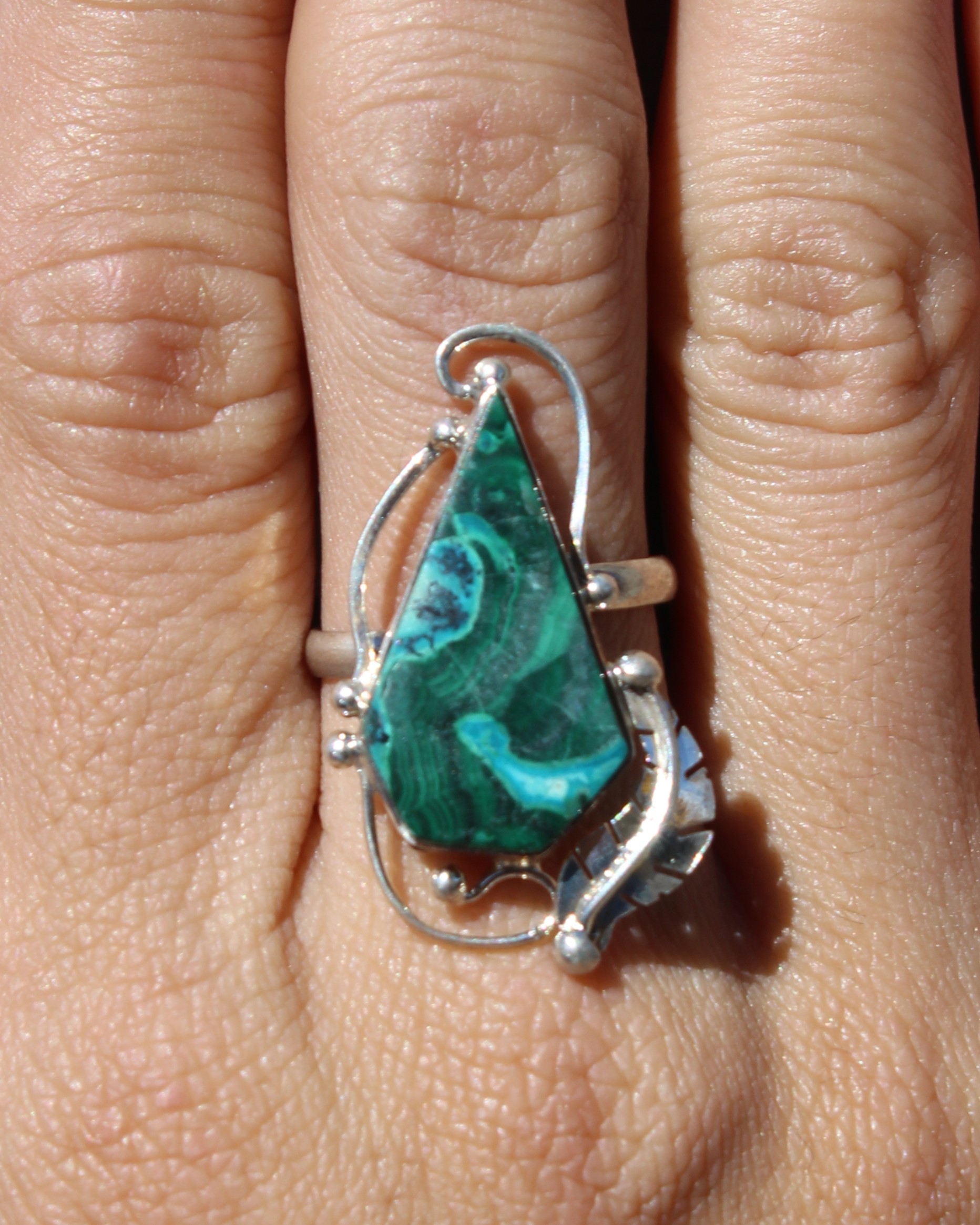 Anillo ajustable de plata .925, con malaquita en forma de gota, acompañado de un detalle de pluma que aporta equilibrio fuerza y ligereza.
