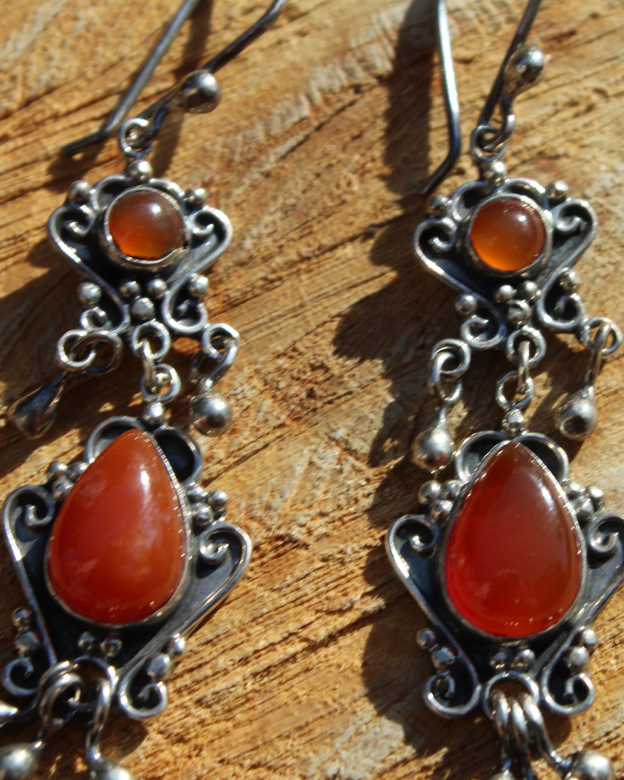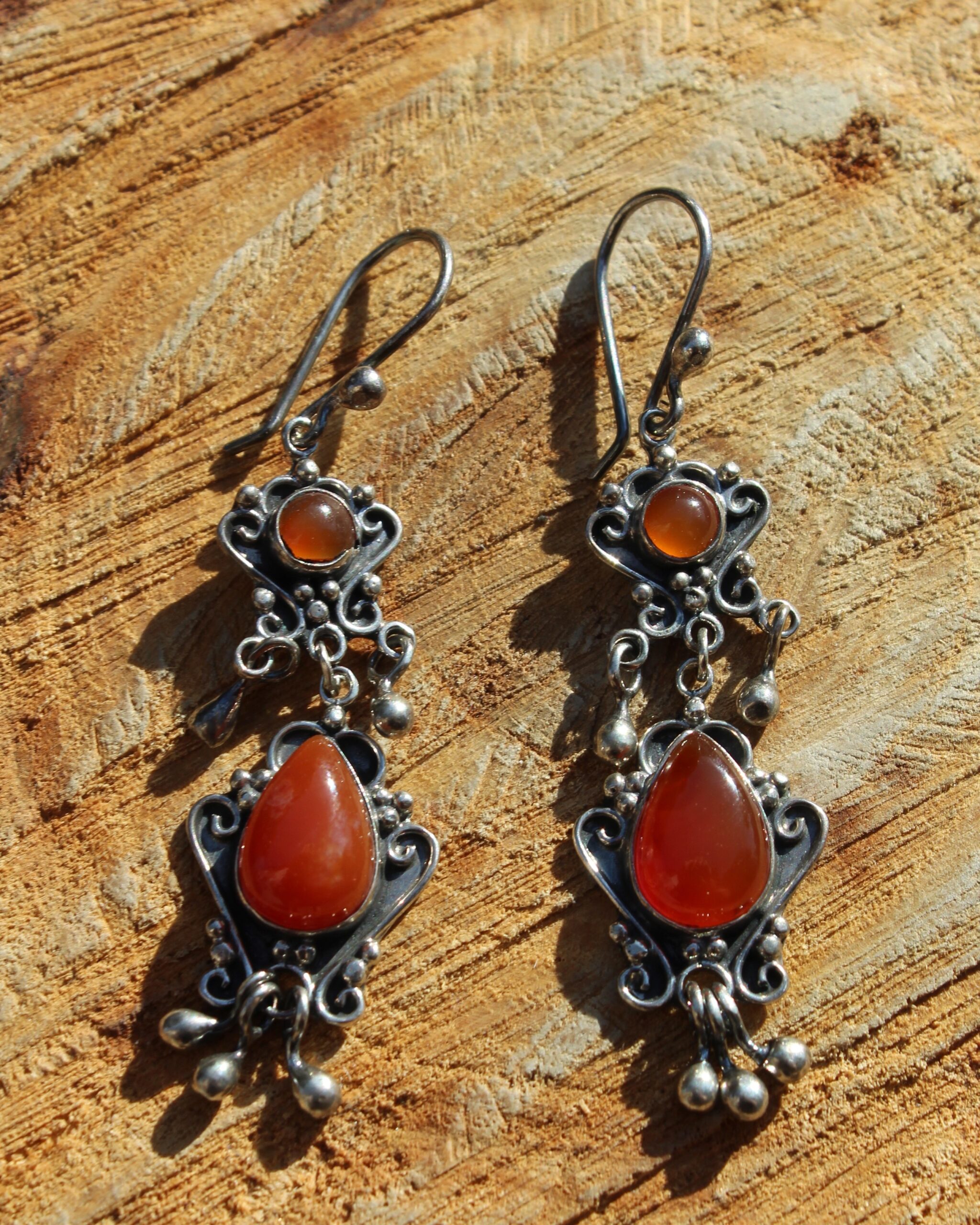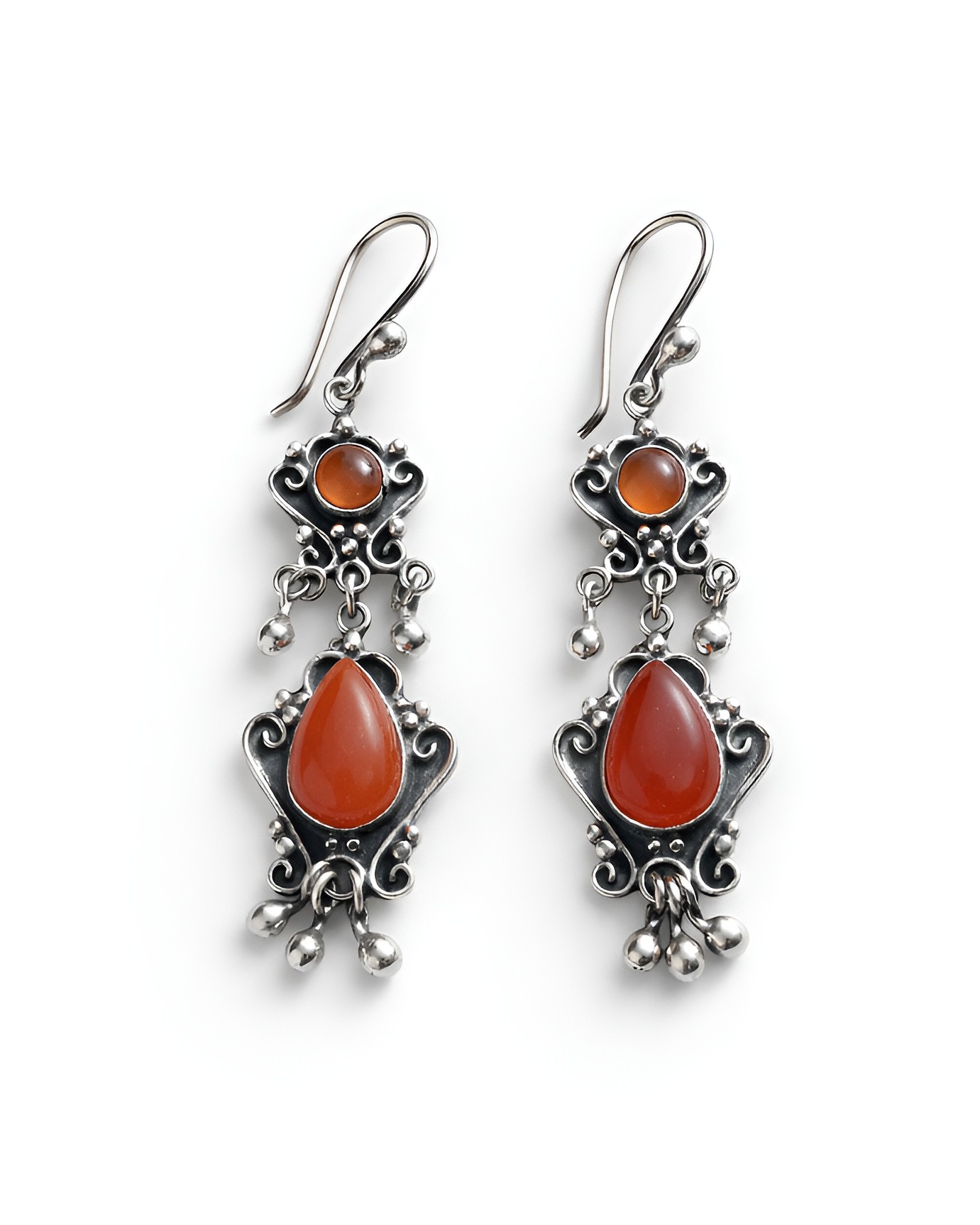 Aretes de plata, con diseño de dos niveles y cornalina, que aportan un tono cálido y vibrante.