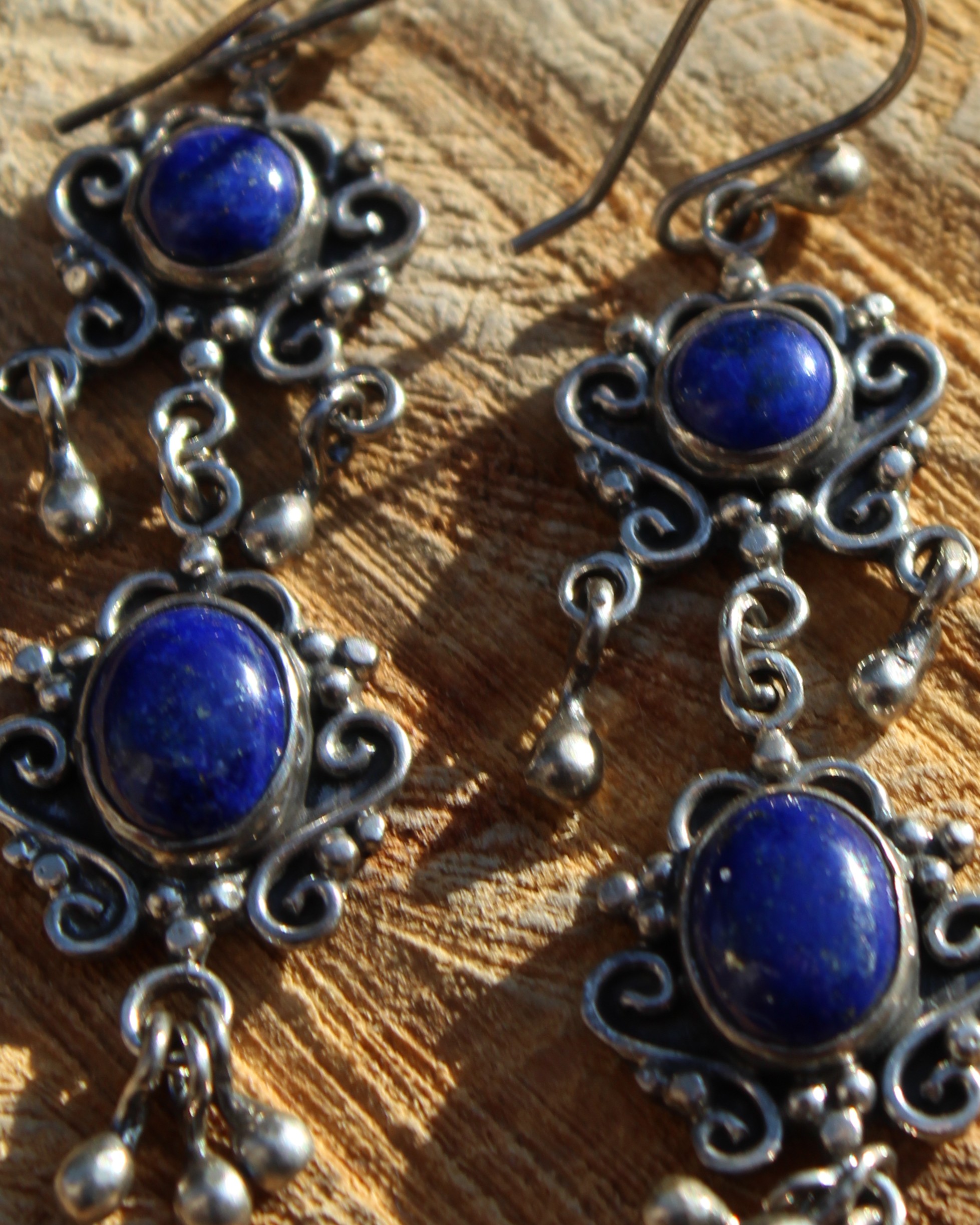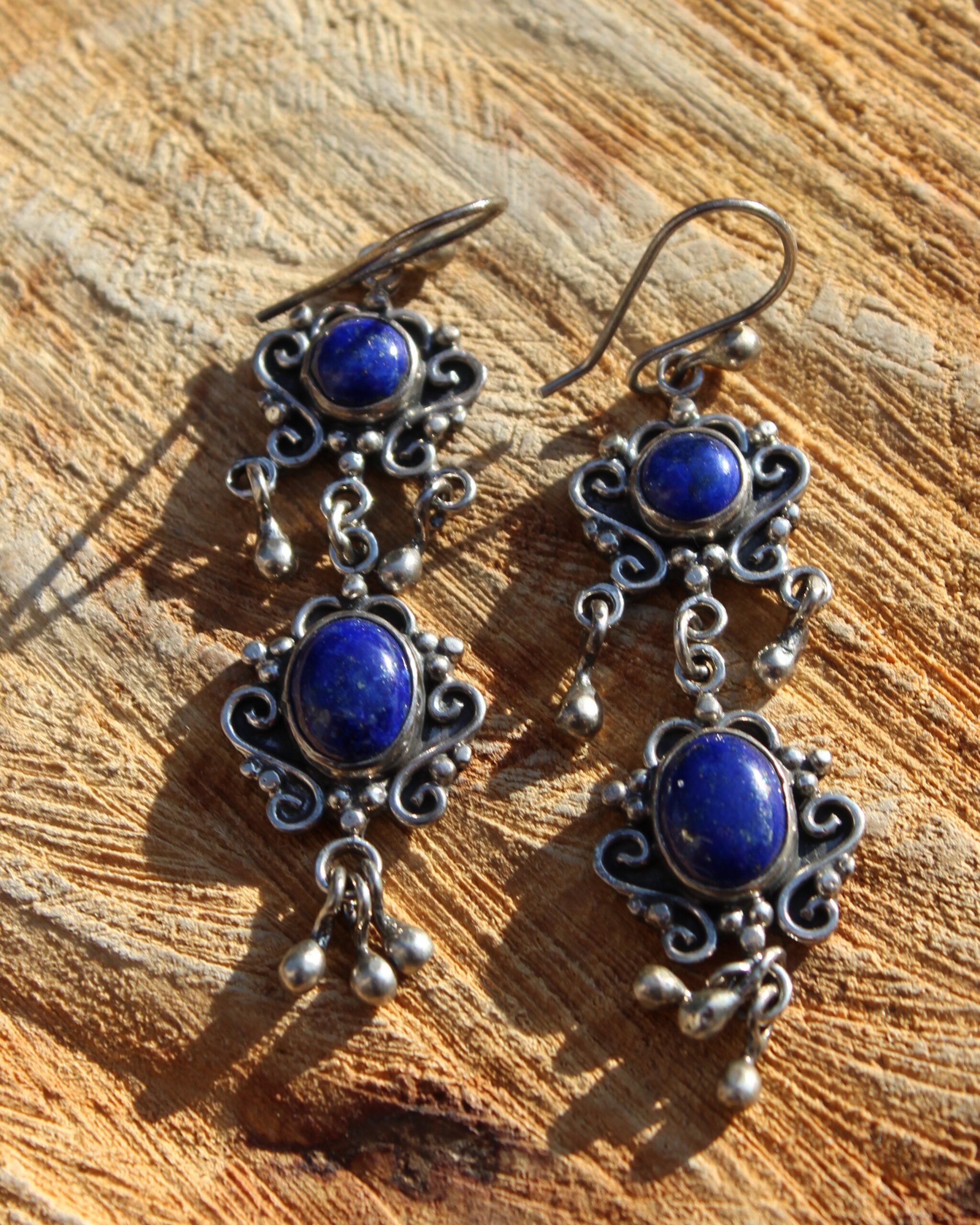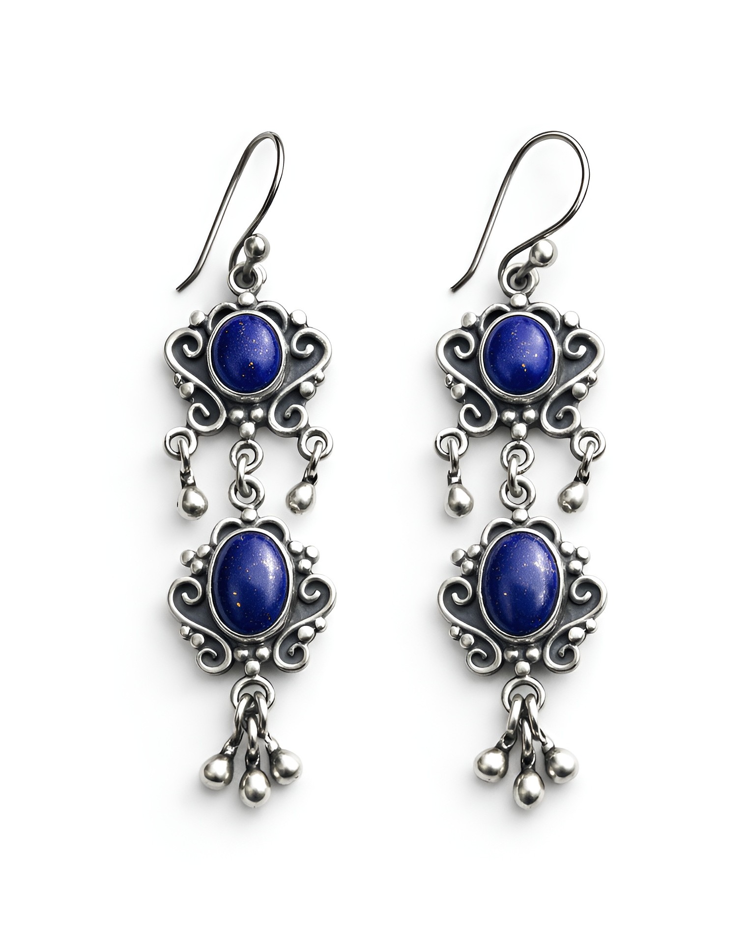 Aretes de plata, con diseño de dos niveles y lapislázuli, que resaltan por su profundo tono azul y vetas naturales. Una pieza artesanal.