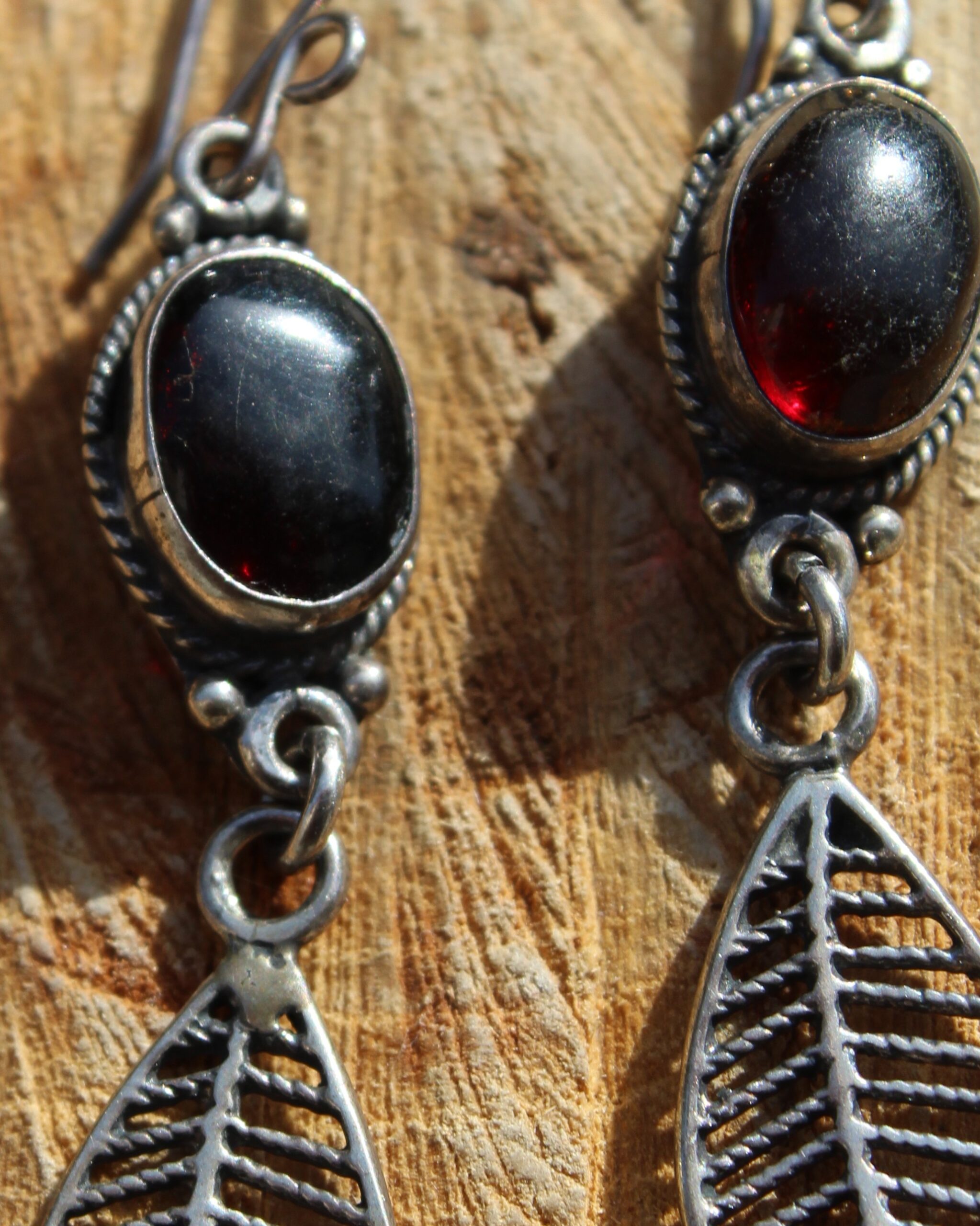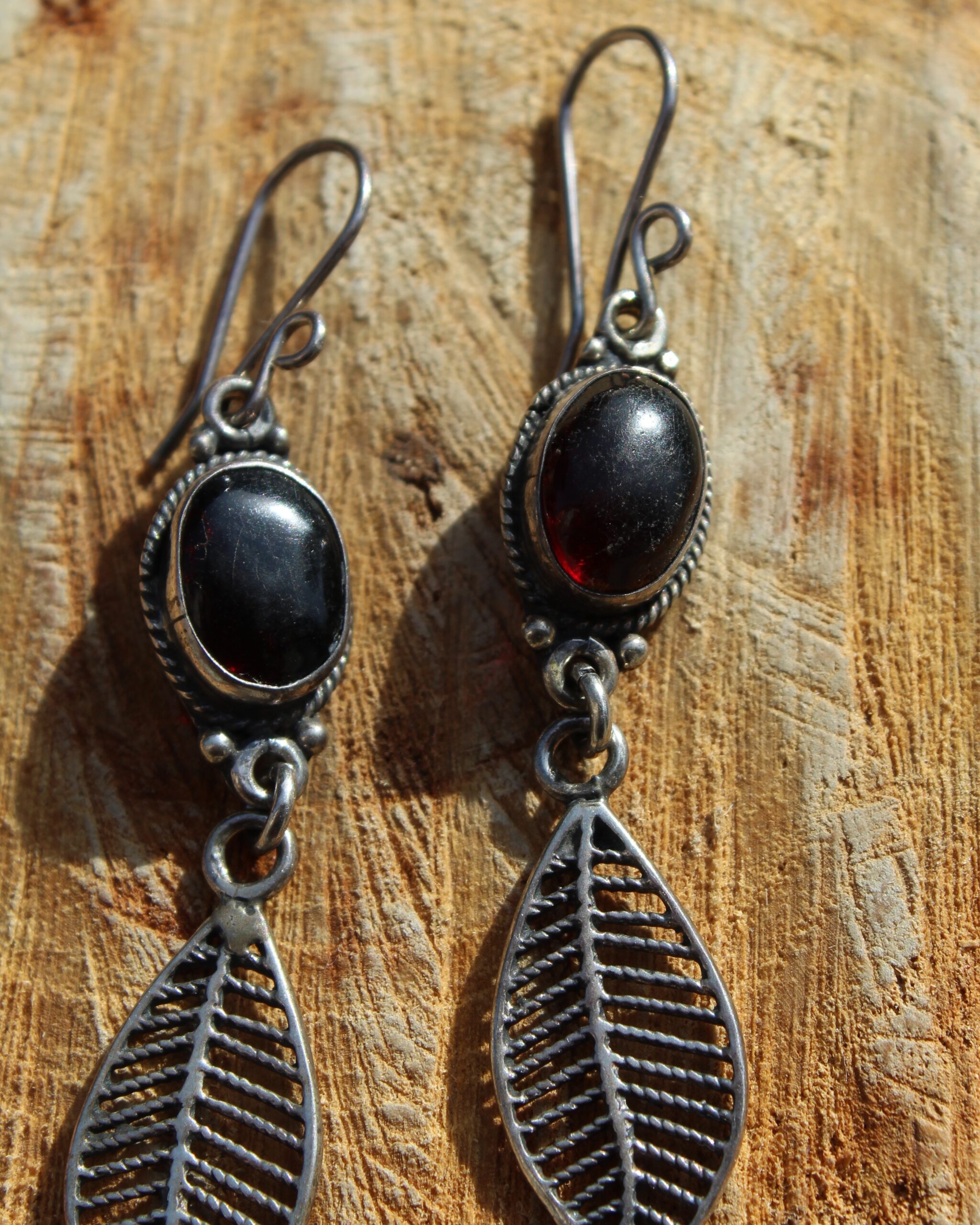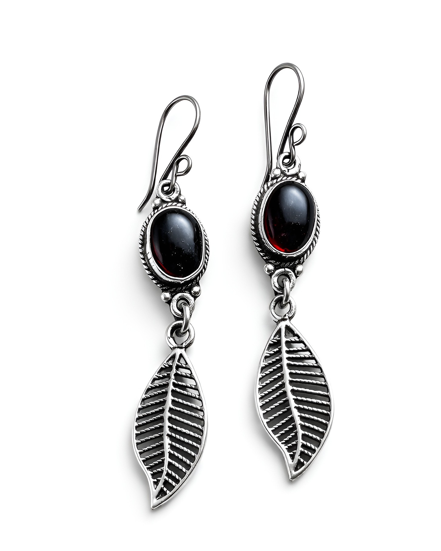 Aretes de plata, con diseño de dos niveles, obsidiana y delicados detalles de hojitas que aportan un estilo natural.