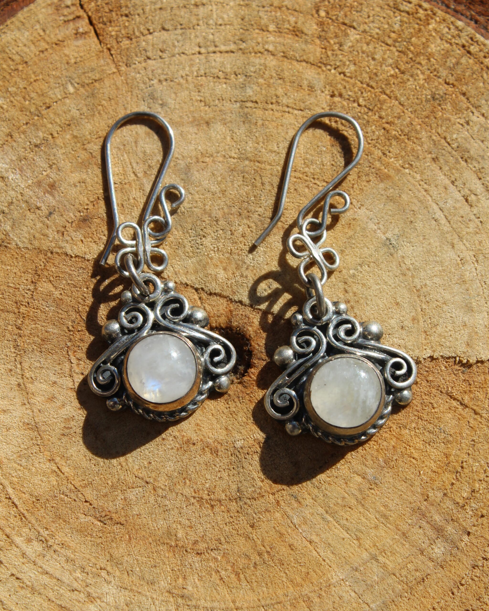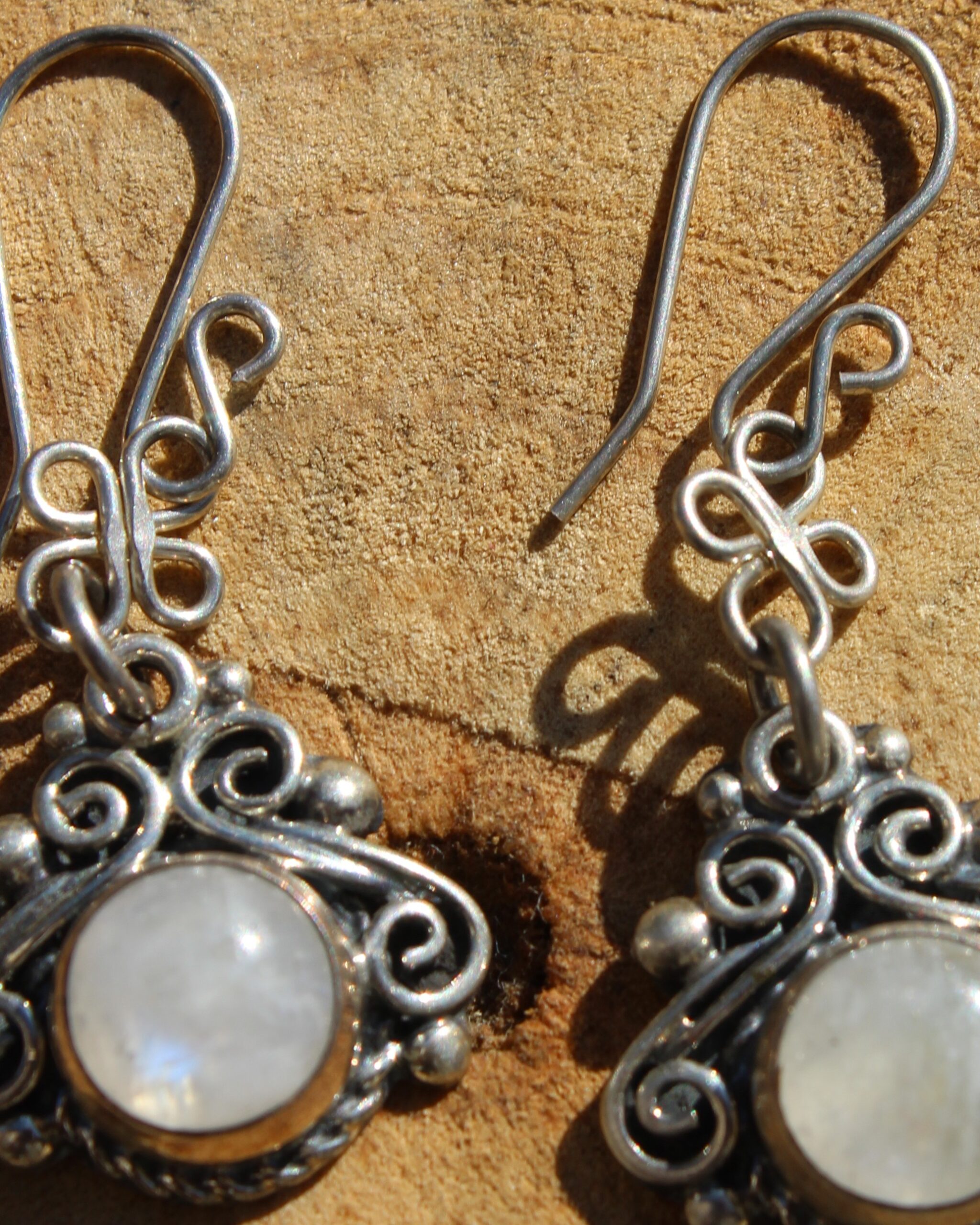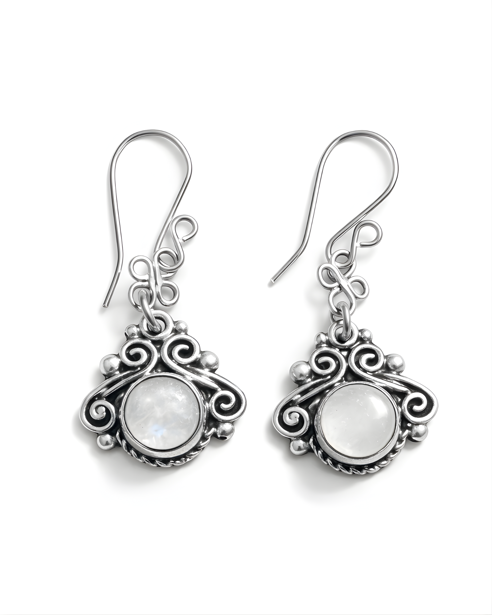 Aretes de plata, con diseño de un solo nivel y piedra luna, que destacan por su brillo suave.