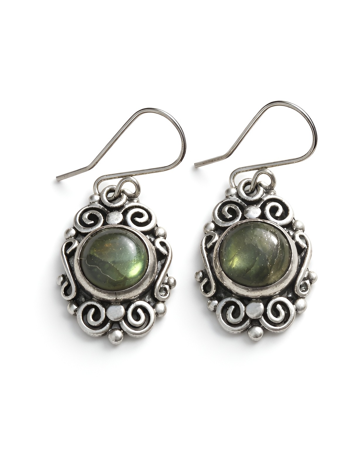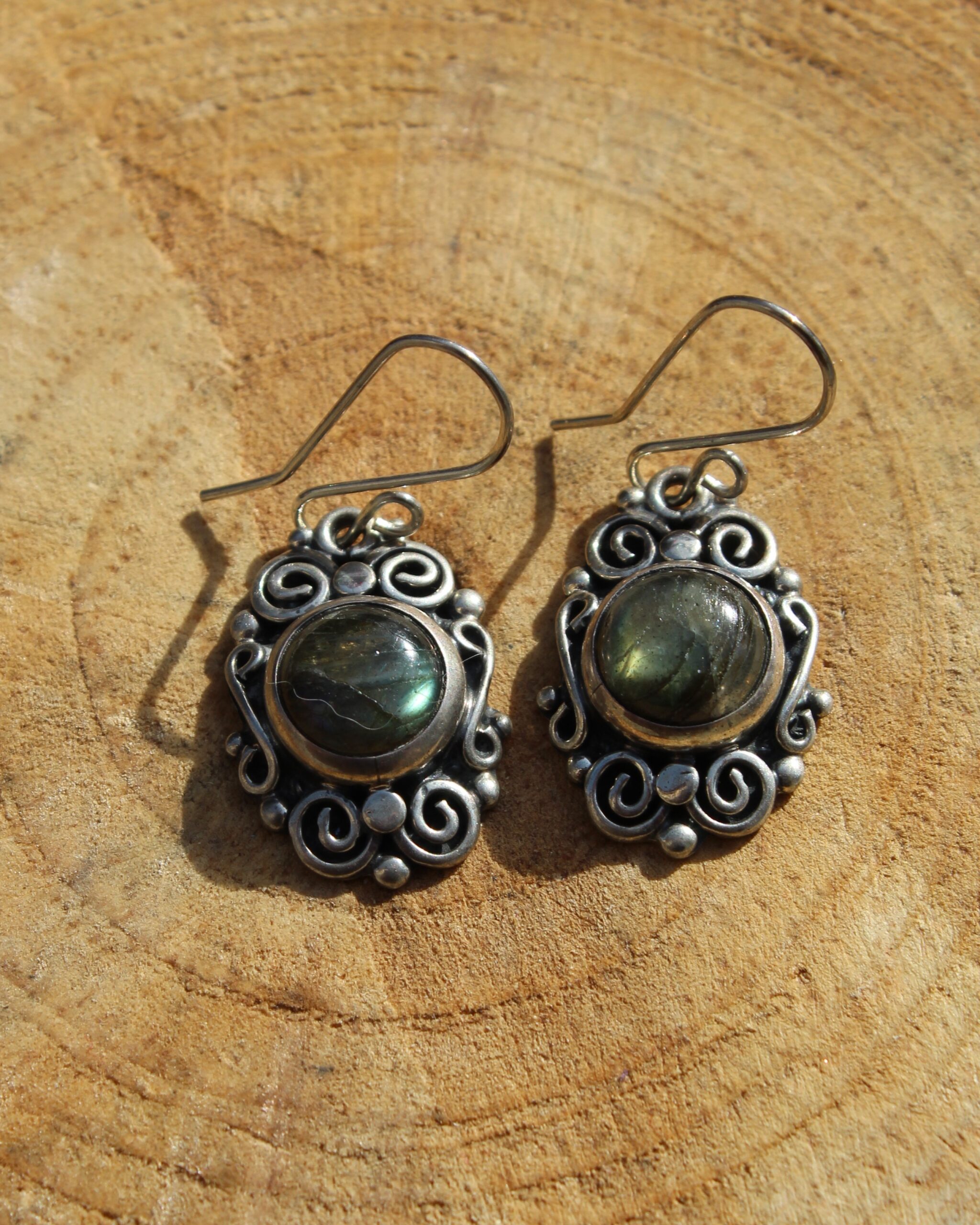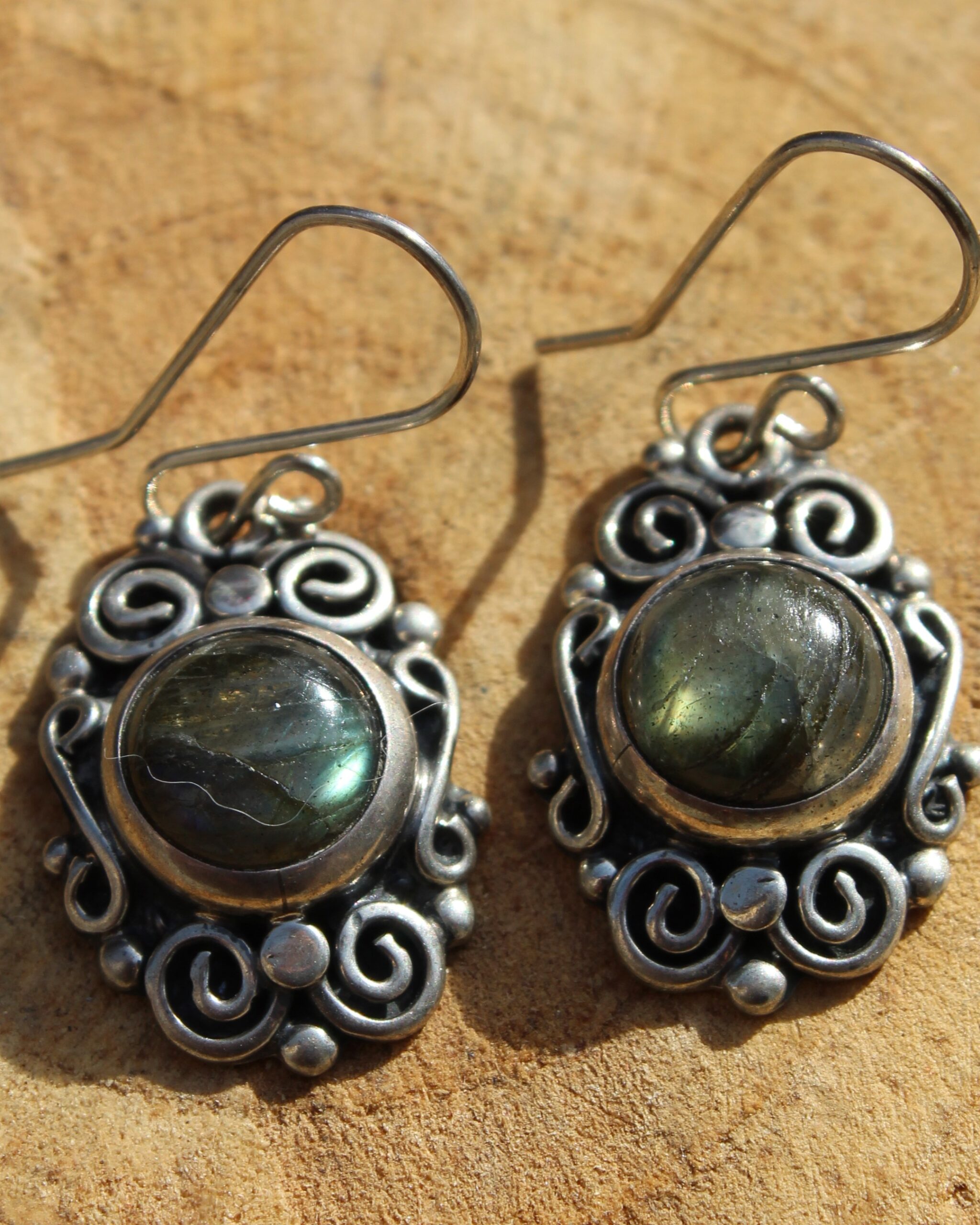 Aretes de plata, con diseño de un solo nivel, labradorita y detalles de espirales, que resaltan por sus destellos y su estilo dinámico.