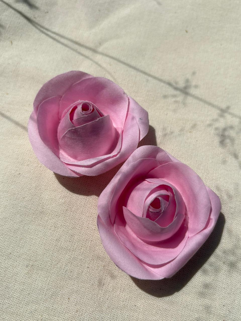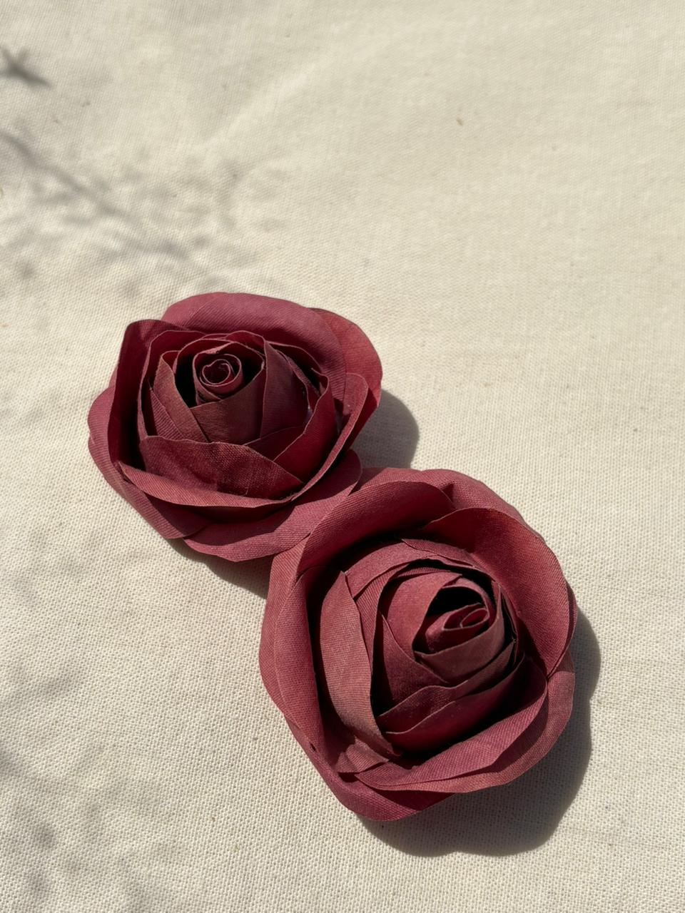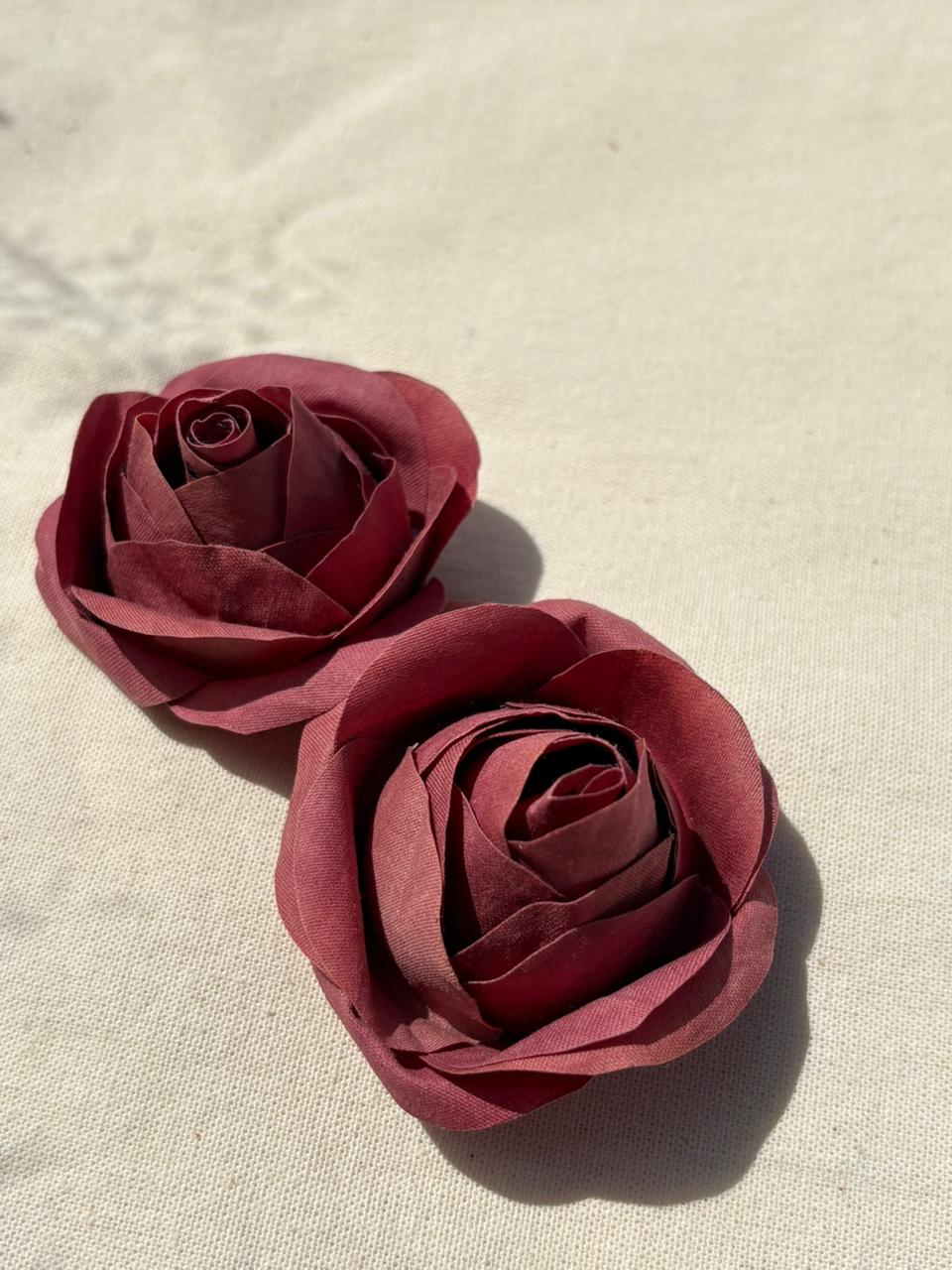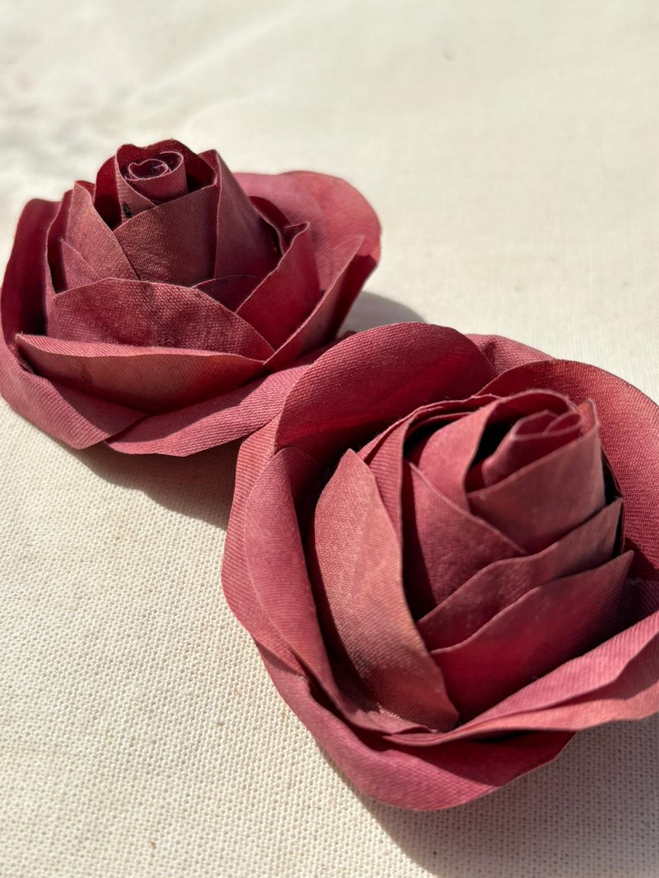 Completa tu look con estos bonitos aretes con forma de rosas hechos con tela de algodón almidonada y teñido con tintes naturales.