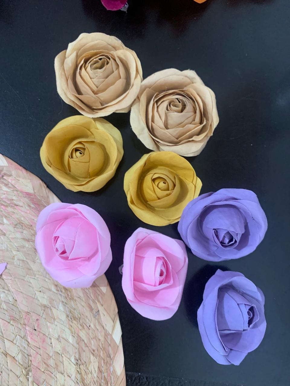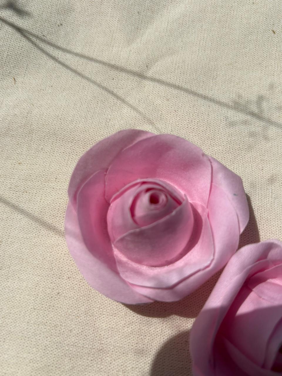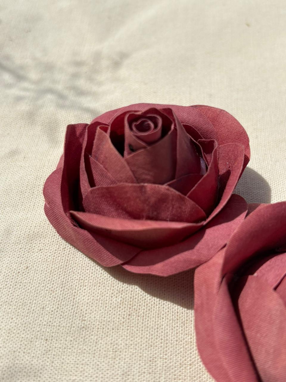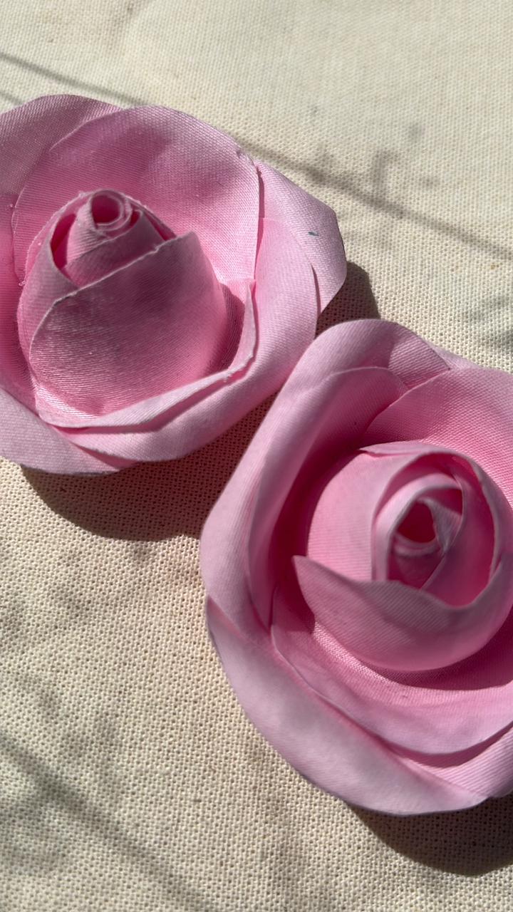 Completa tu look con estos bonitos aretes con forma de rosas hechos con tela de algodón almidonada y teñido con tintes naturales.