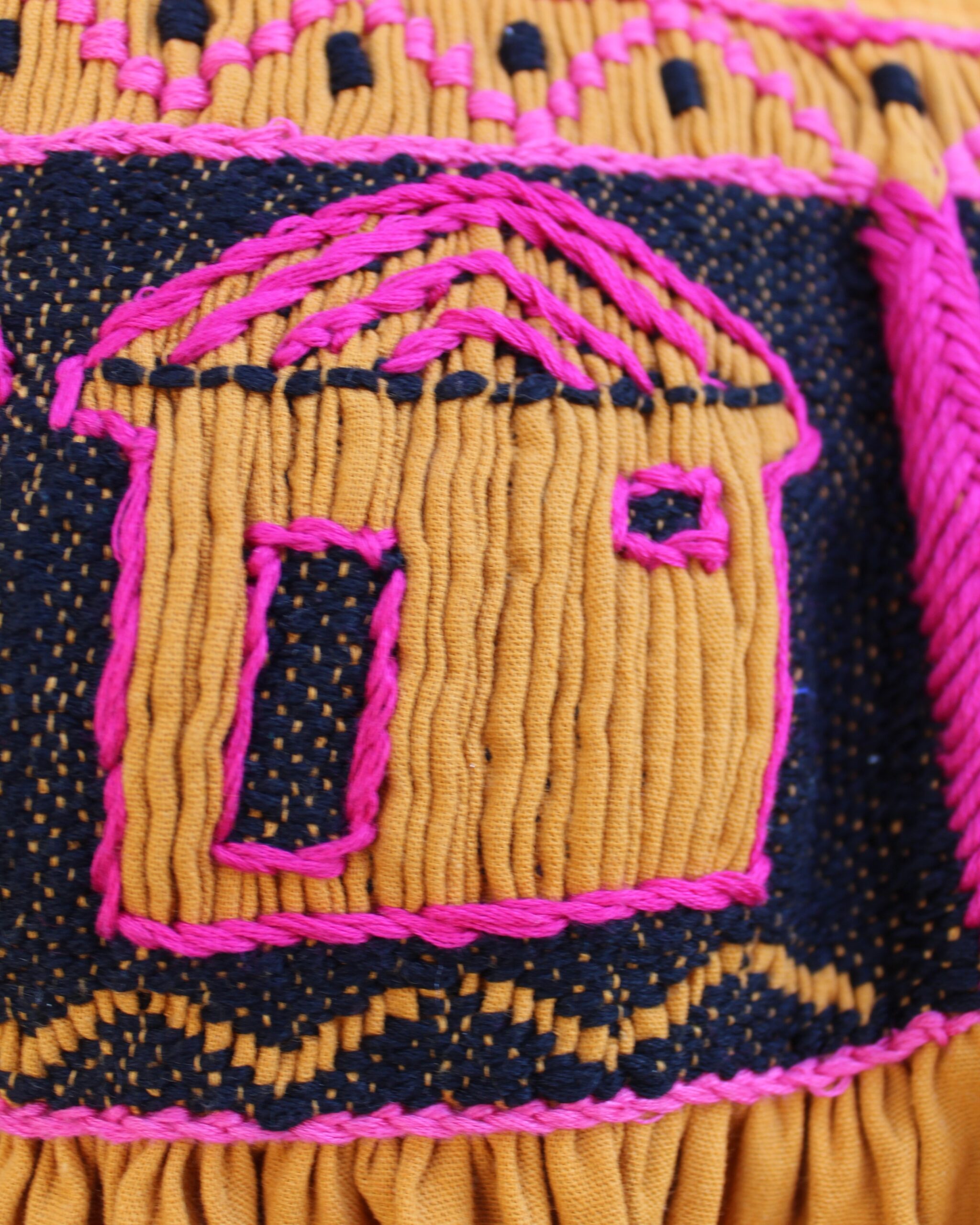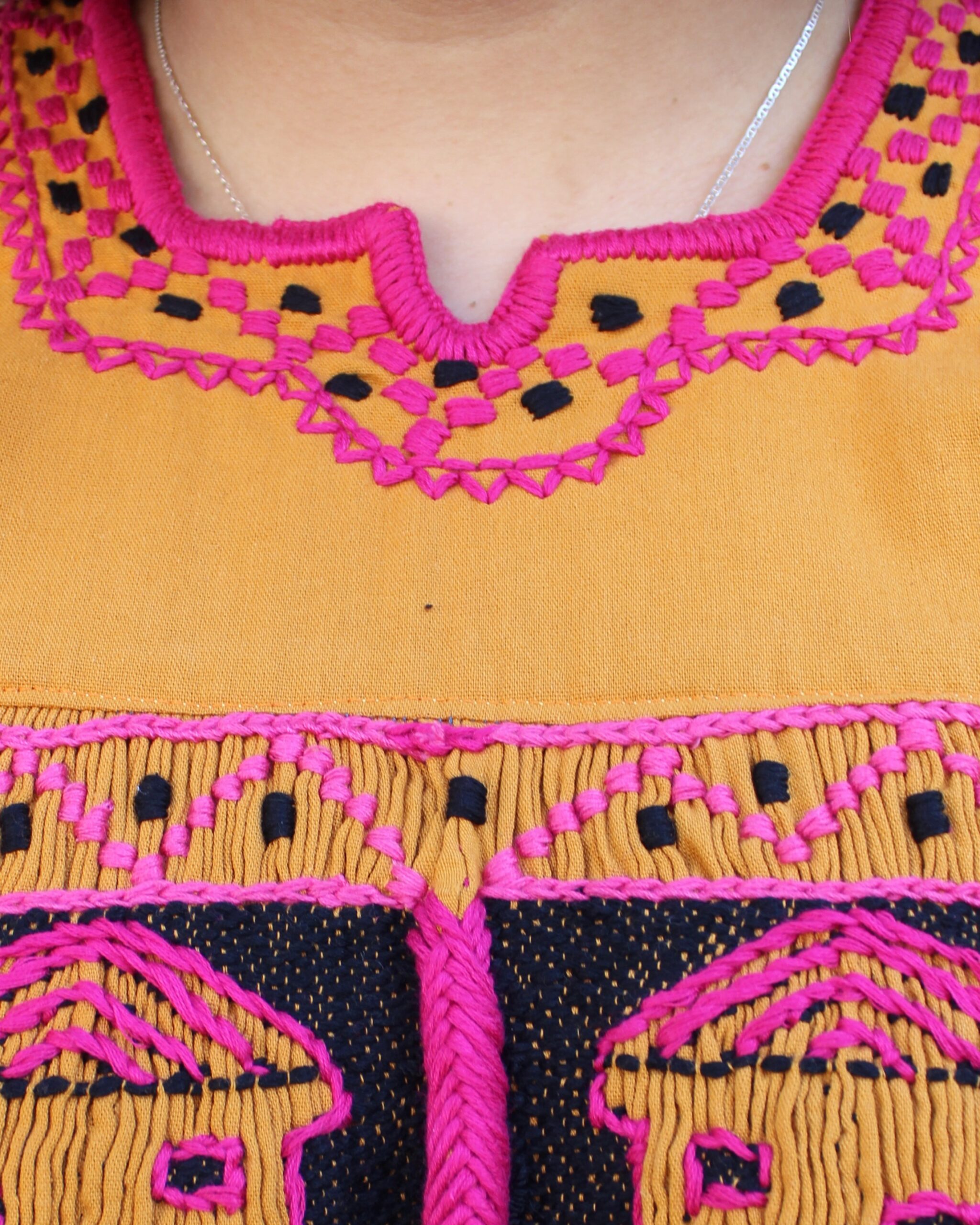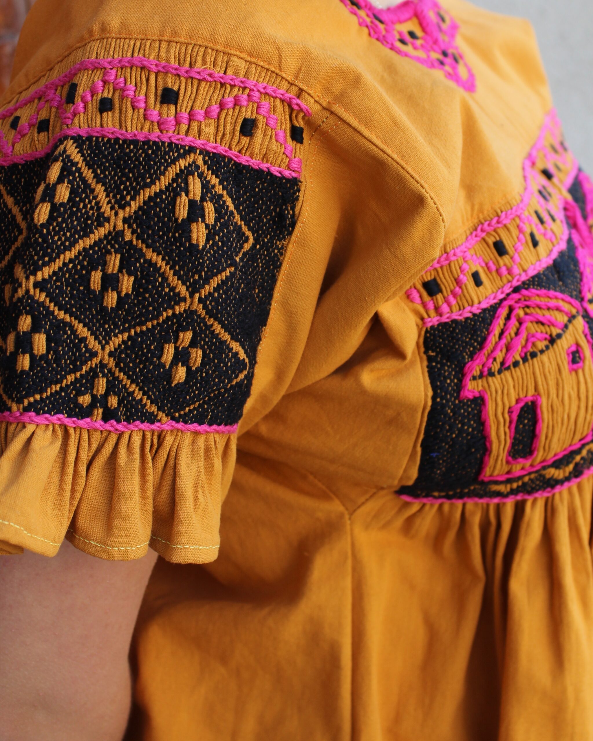 Blusa amarilla, con bordado de casitas en color negro, elaborada en técnica de pepenado fruncido, que destaca por sus detalles artesanales y diseño tradicional.