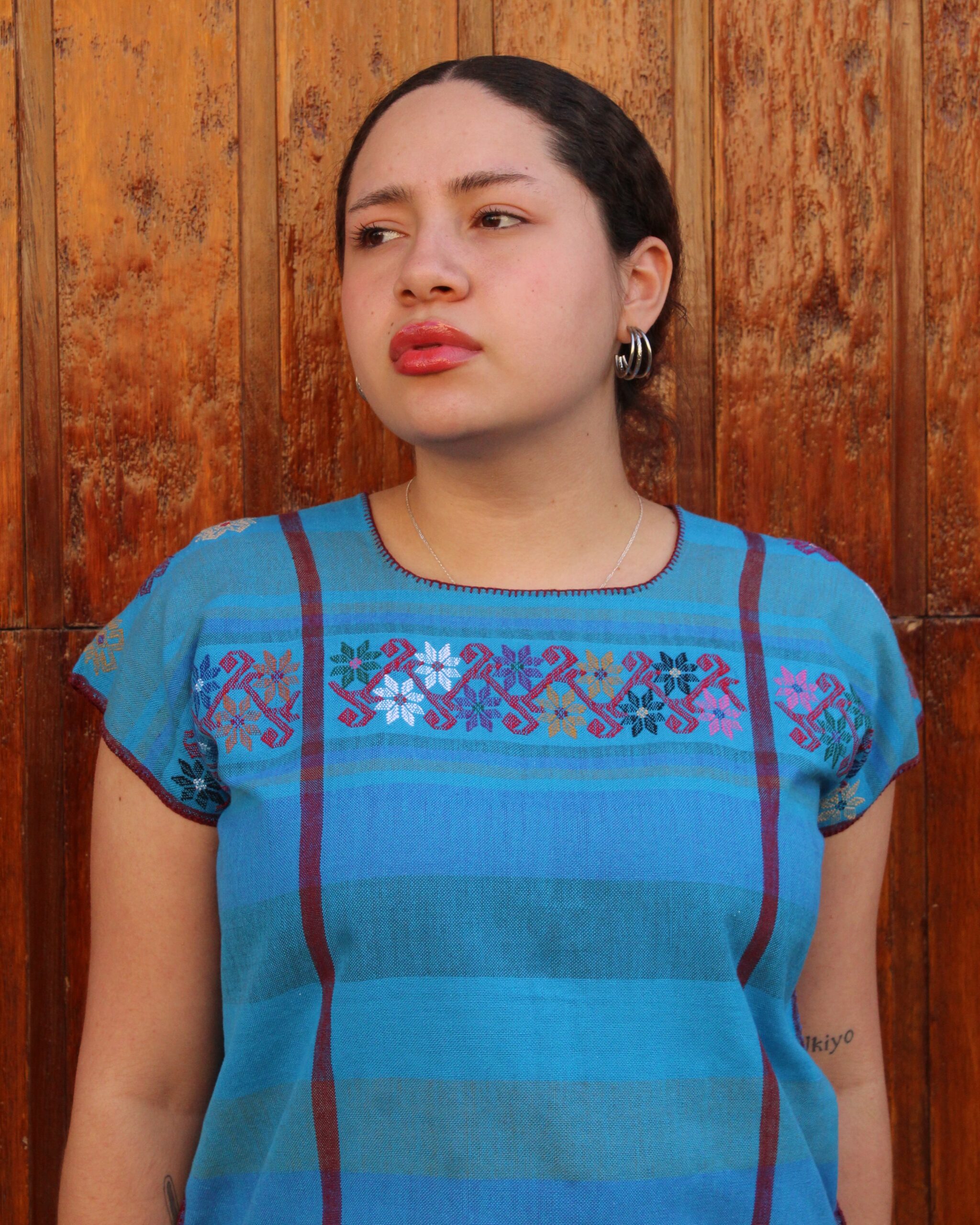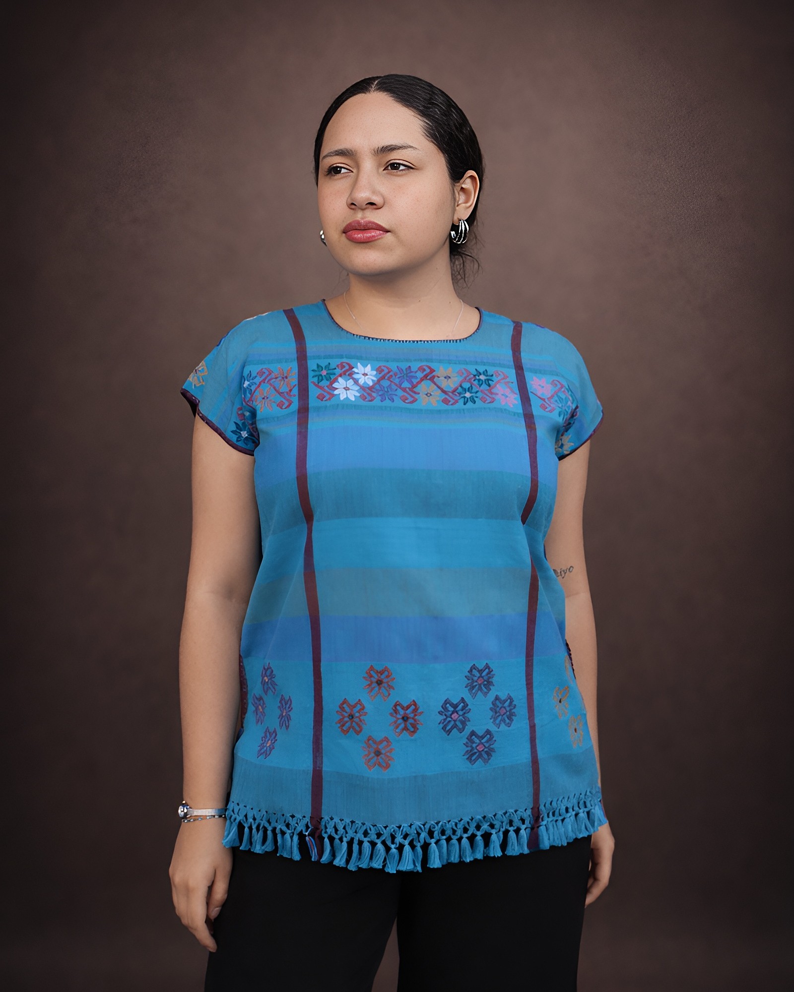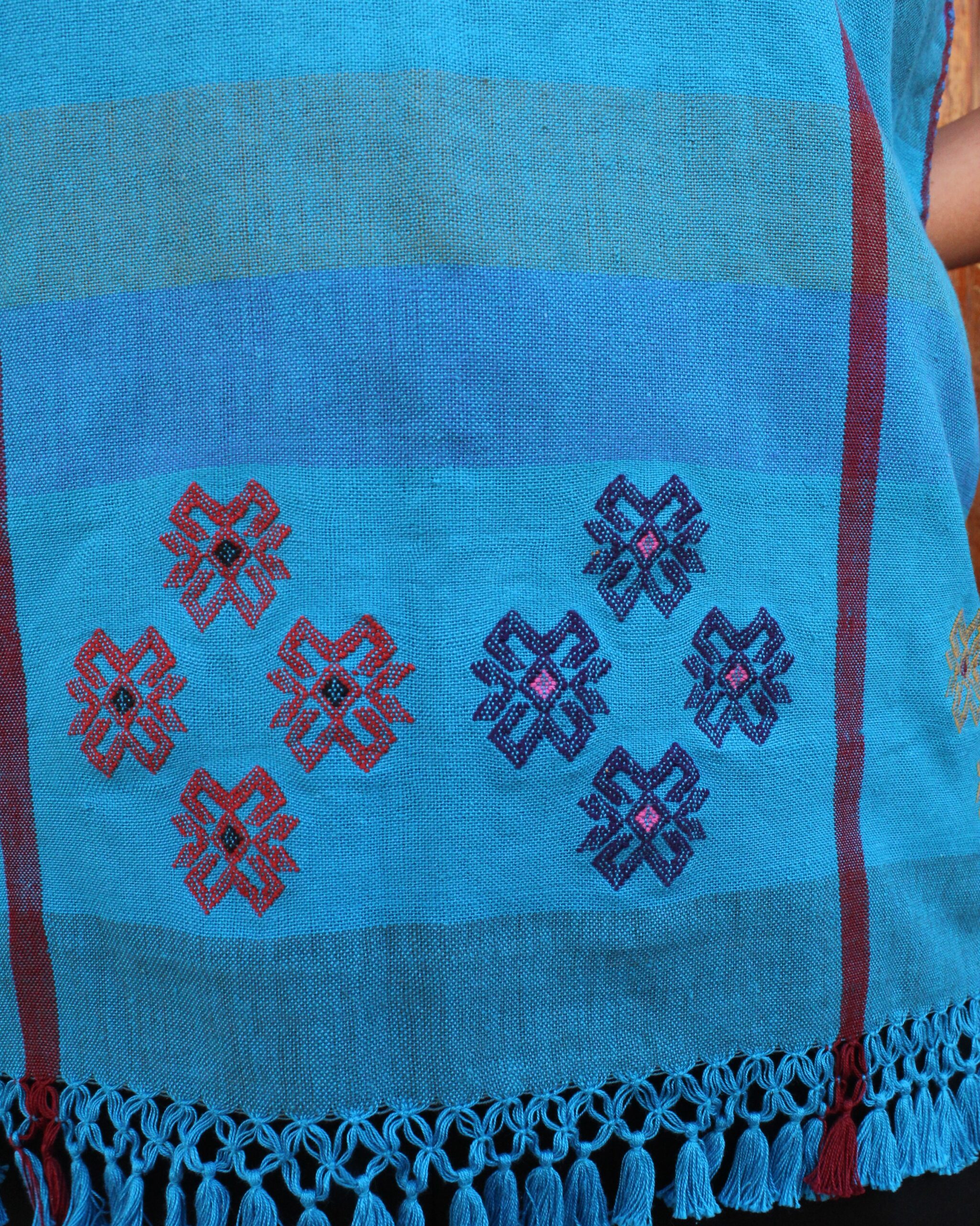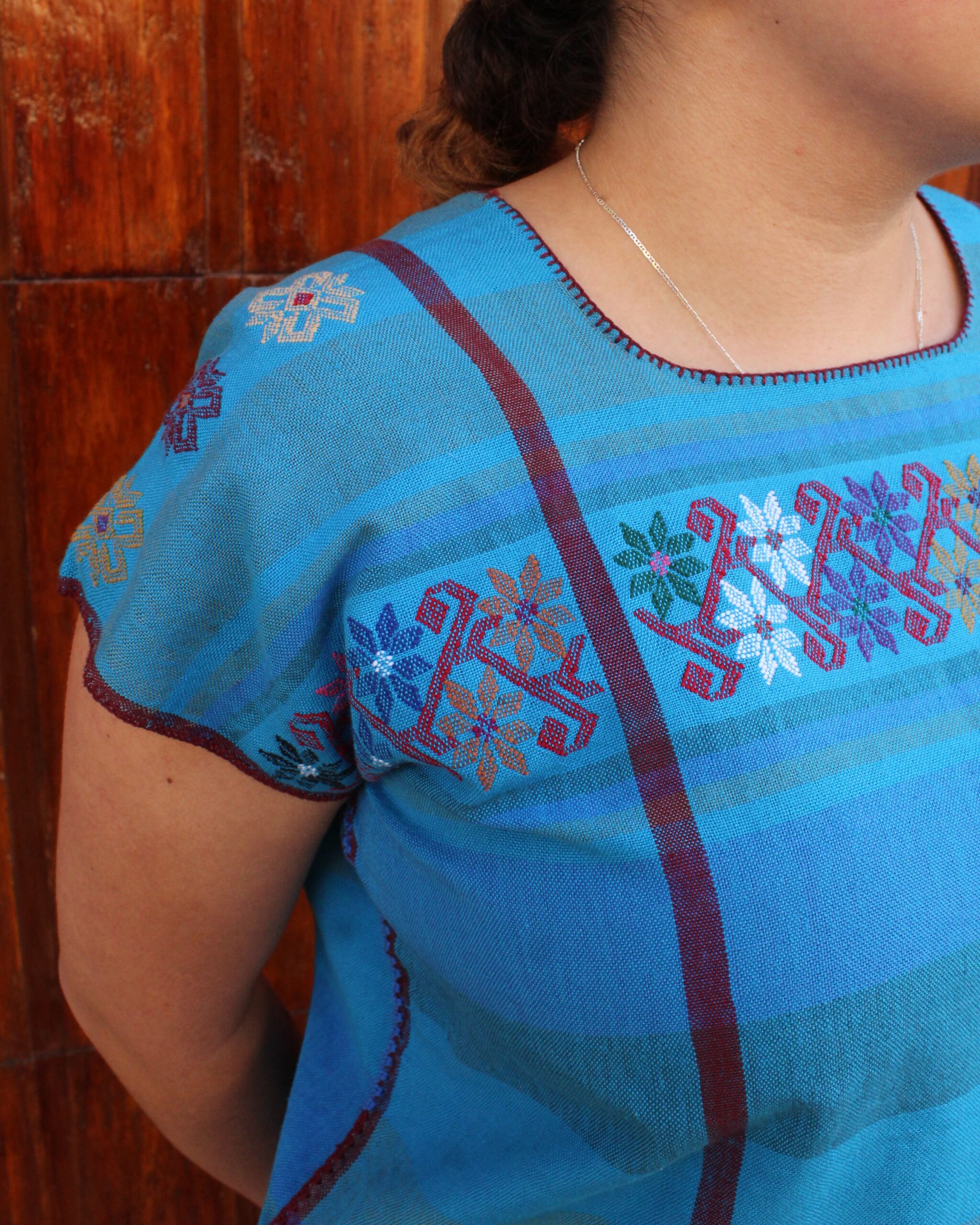 Blusa de estilo clásico en tono azul, adornada con delicados brocados que aportan un toque elegante y tradicional.
