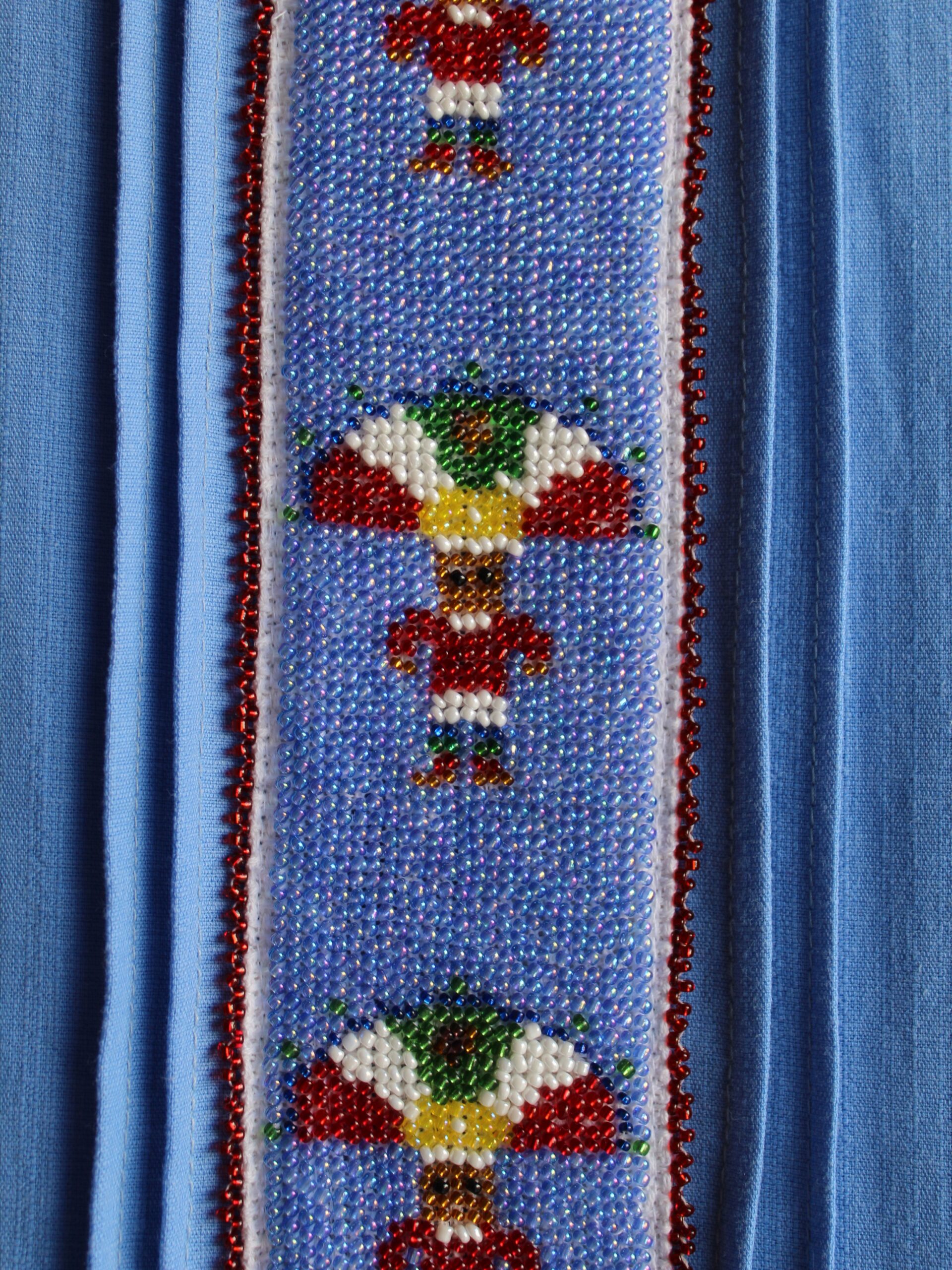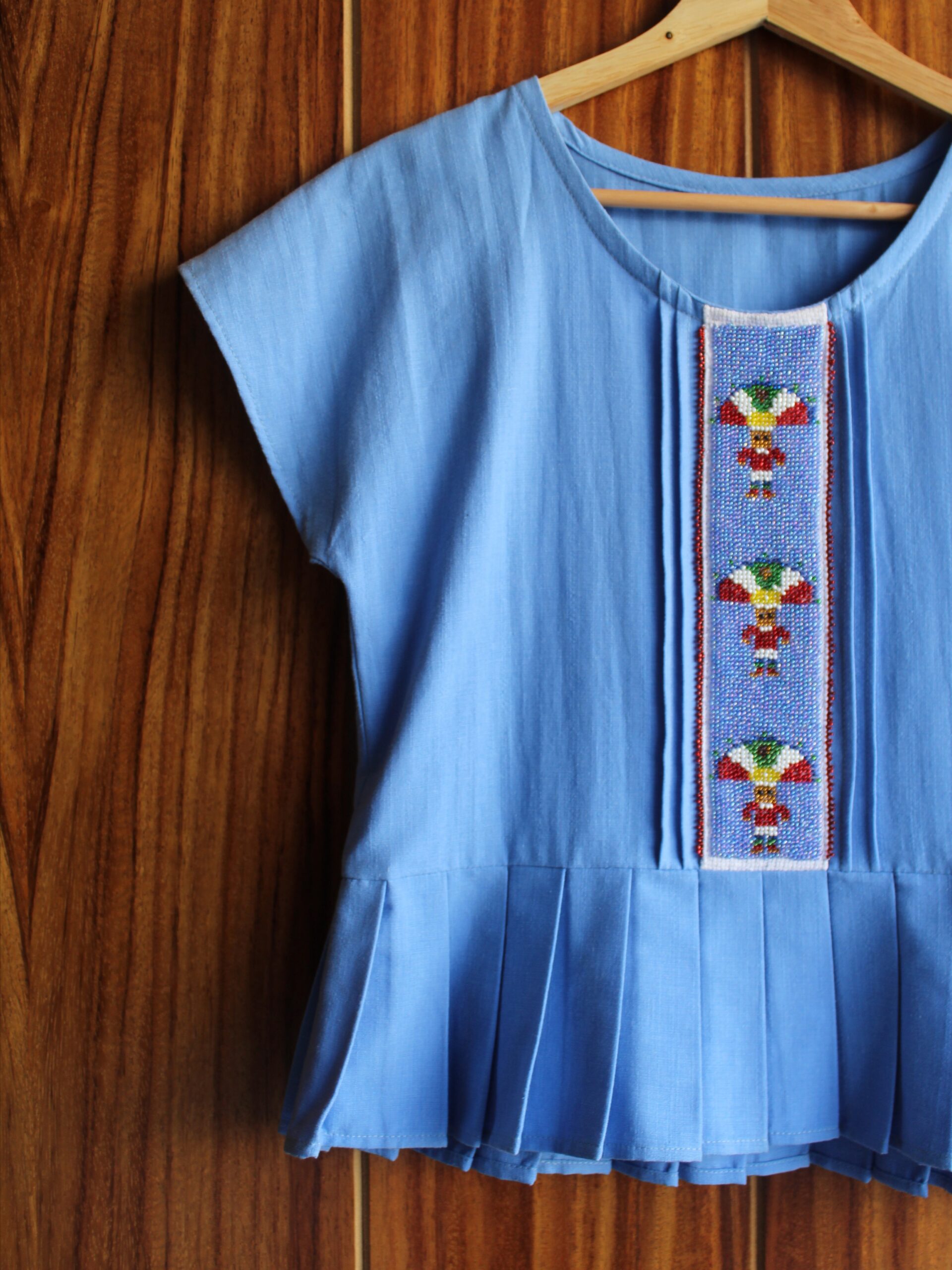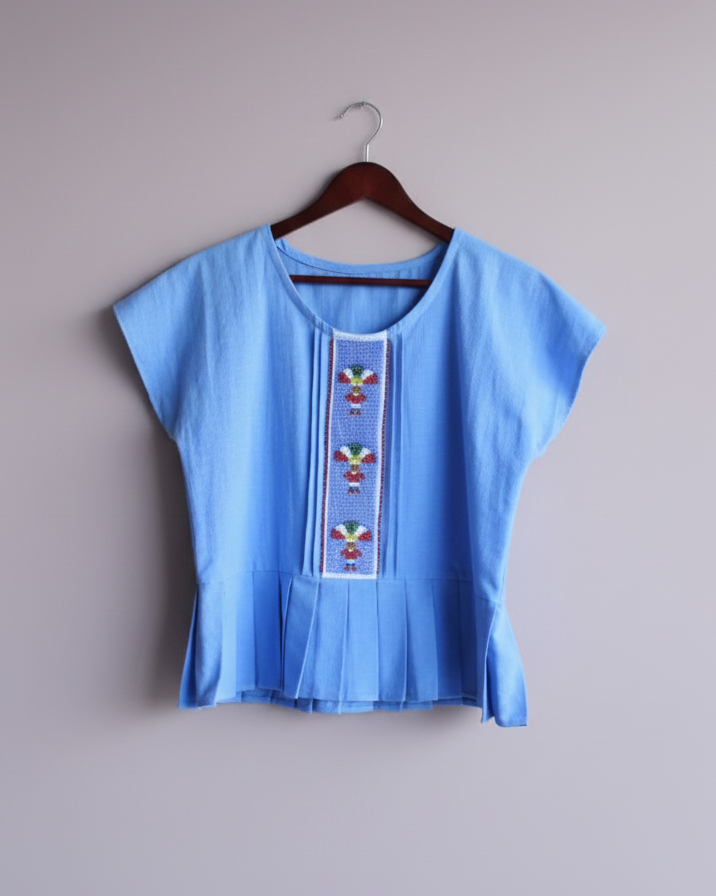 Lleva contigo una pieza de arte textil. Esta blusa con un tono azul cielo destaca por su pechera bordada a mano, inspirada en los emblemáticos danzantes de la pluma, con un diseño de corte contemporáneo, cuello redondo y un delicado detalle de tablones en la cintura, esta prenda redefine el estilo artesanal para la mujer moderna.