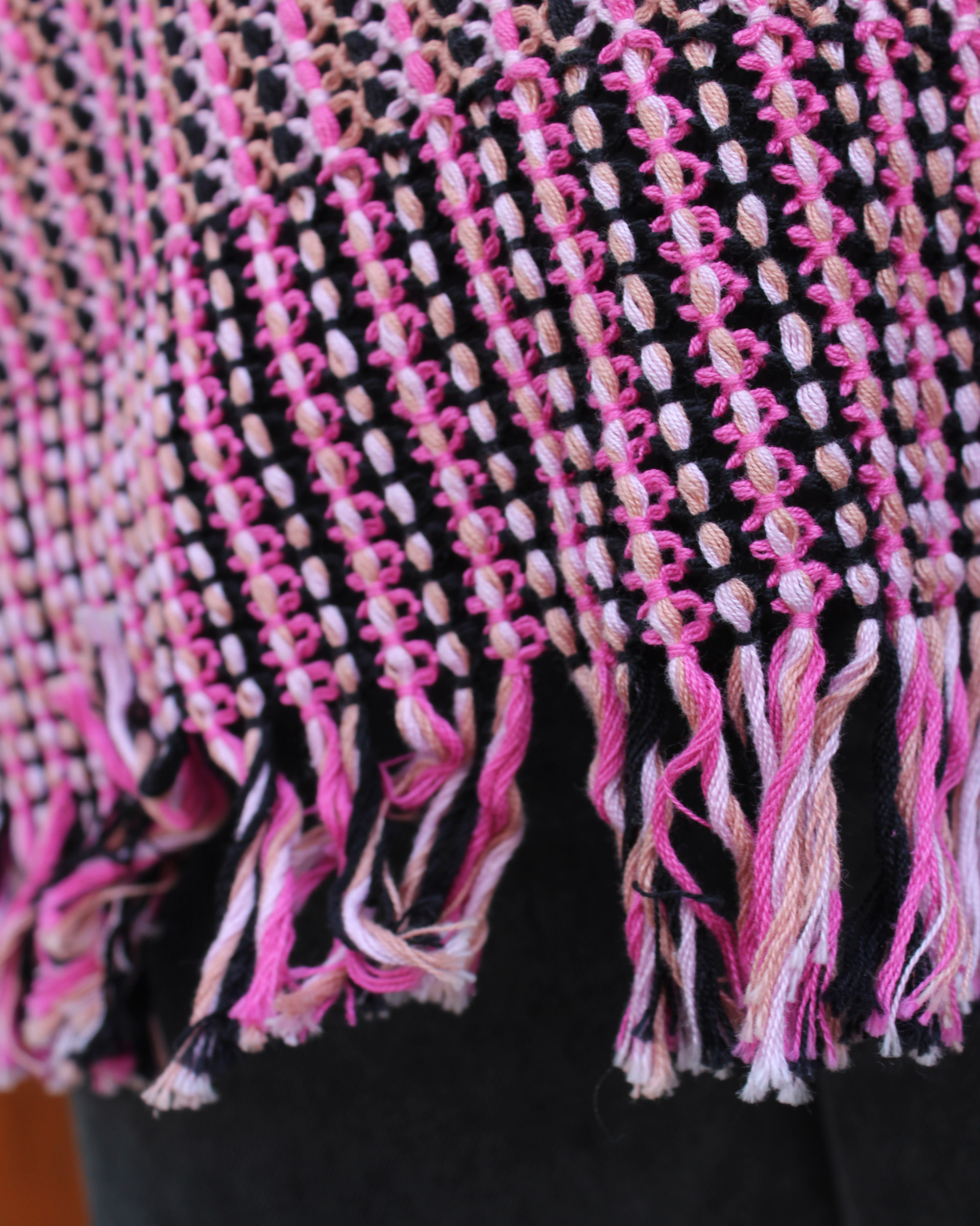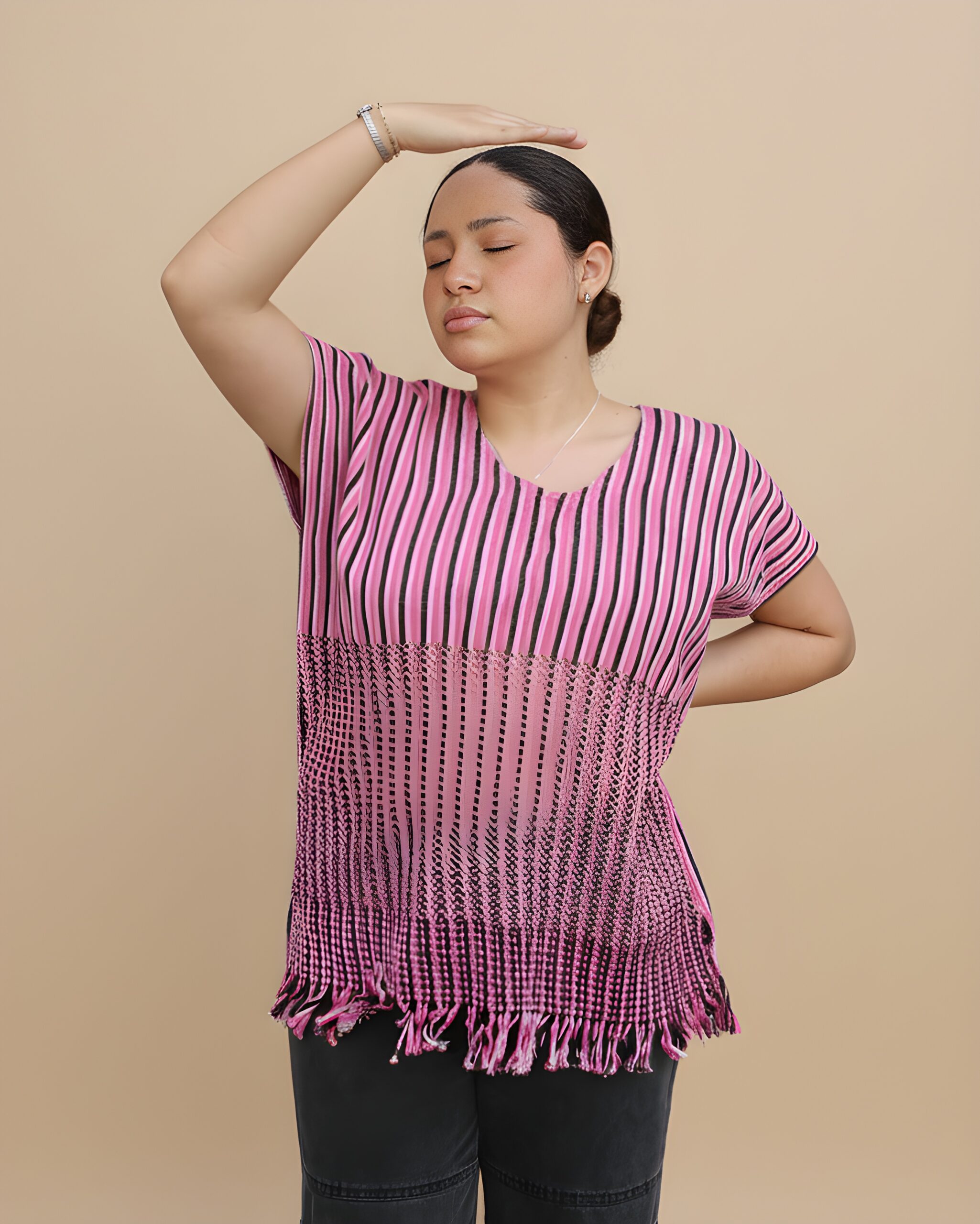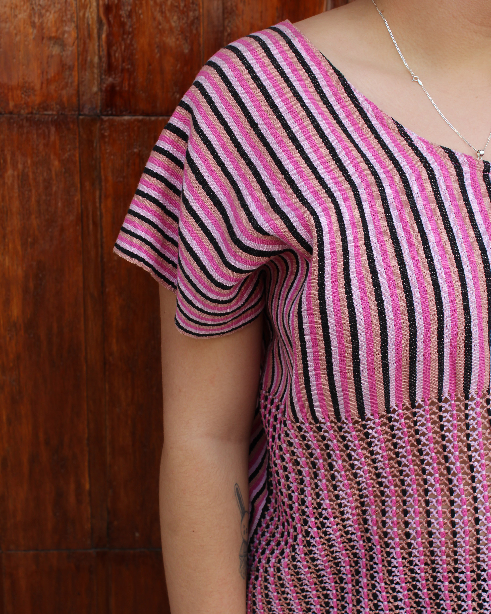Blusa tejida a mano en telar de cintura, con delicadas puntadas de insecto palo en tonos rosa y negro, como un susurro de naturaleza en cada hilo