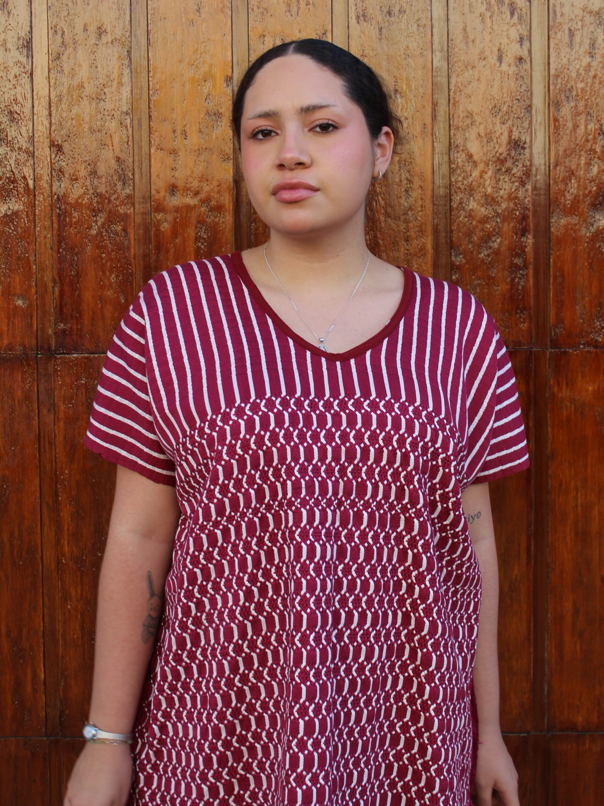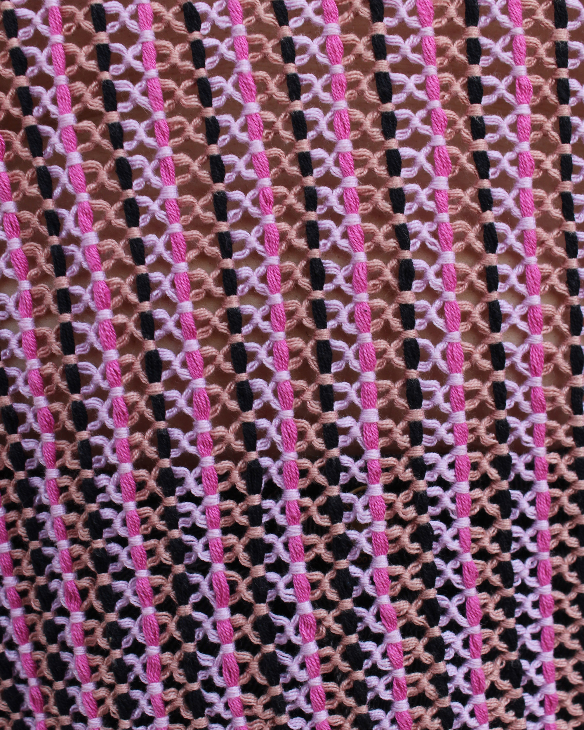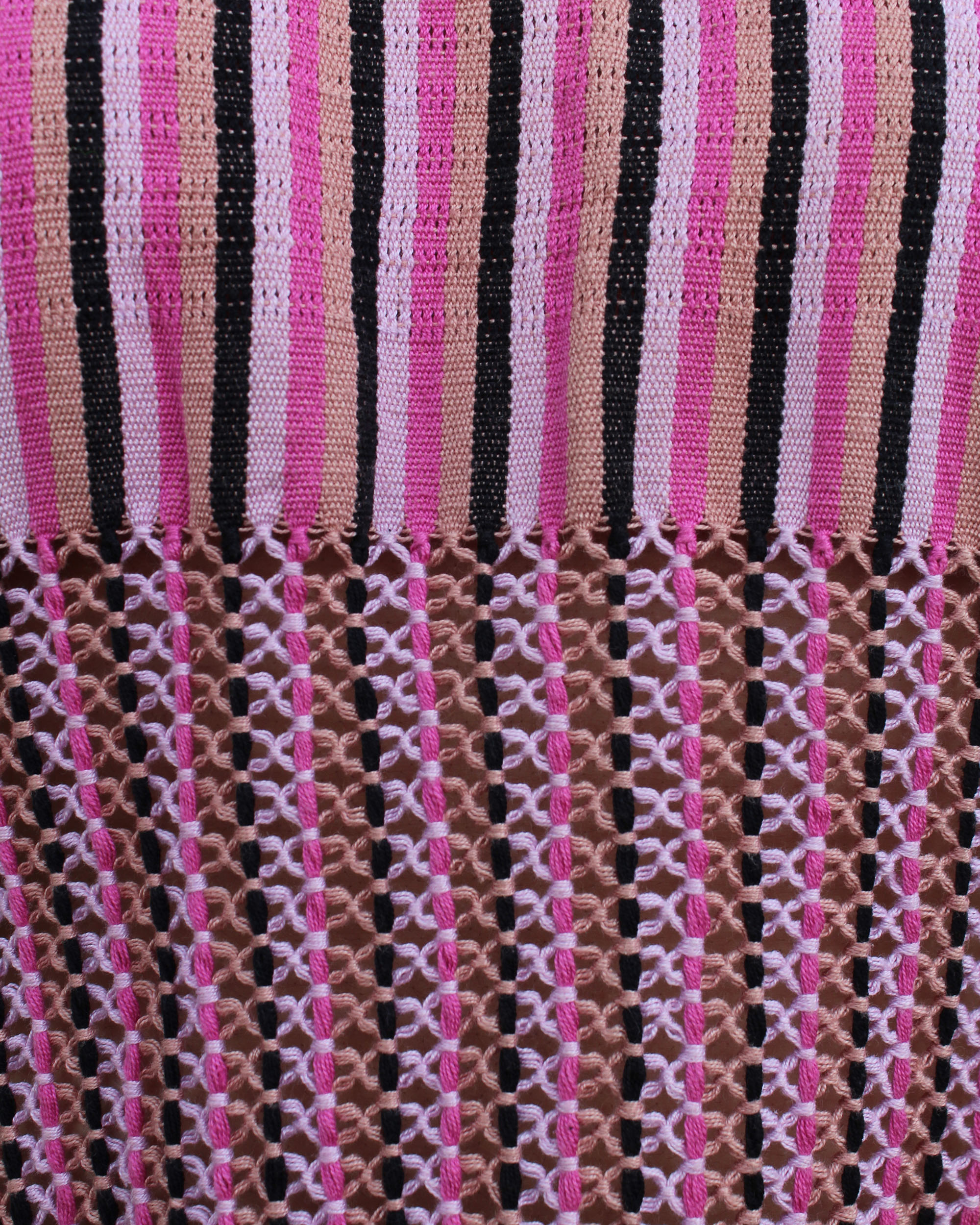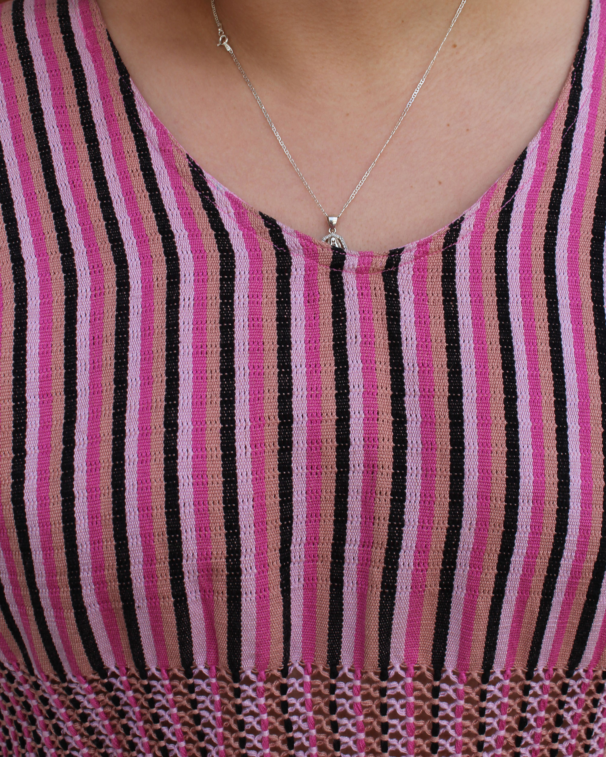 Blusa tejida a mano en telar de cintura, con delicadas puntadas de insecto palo en tonos rosa y negro, como un susurro de naturaleza en cada hilo