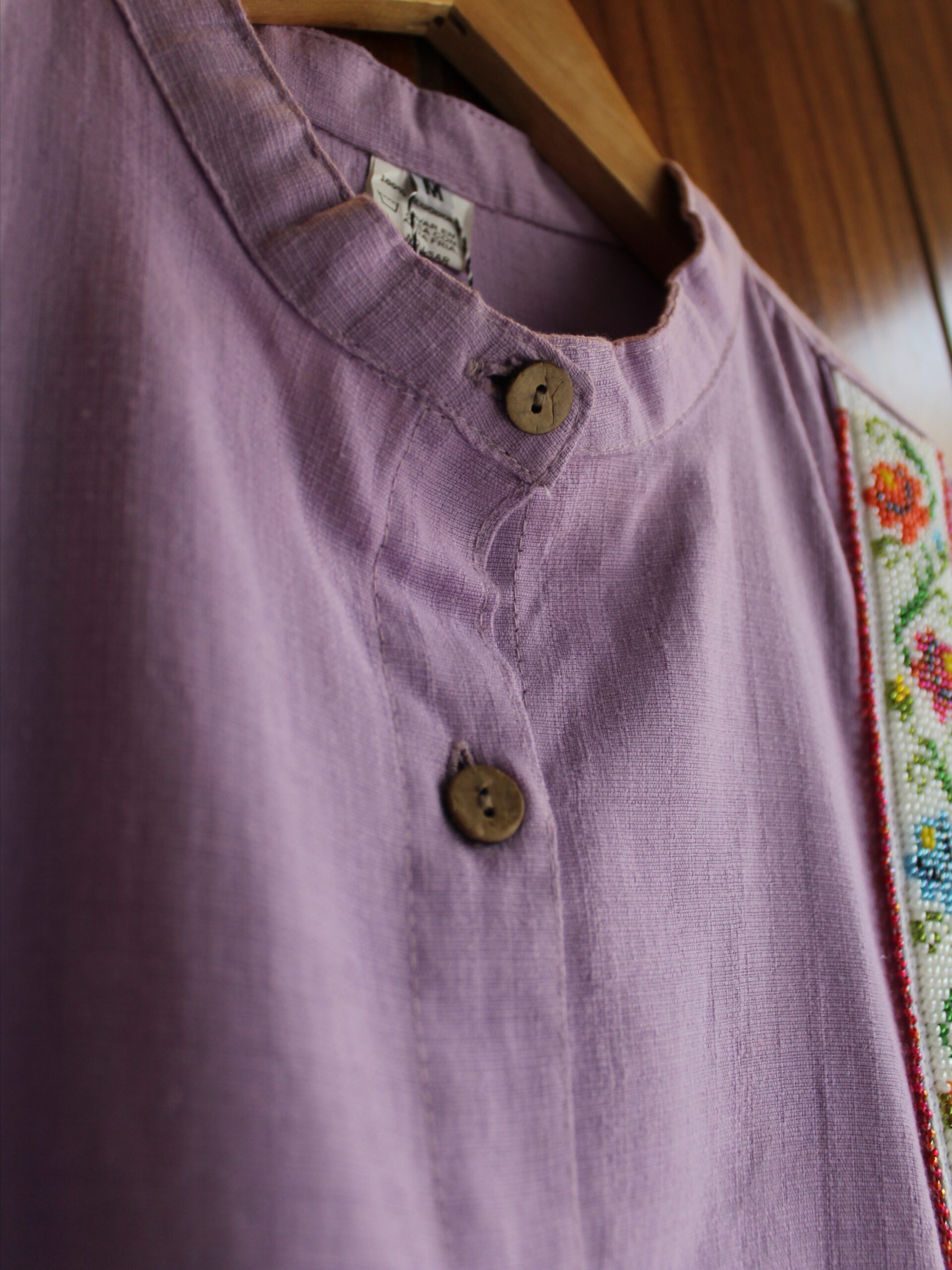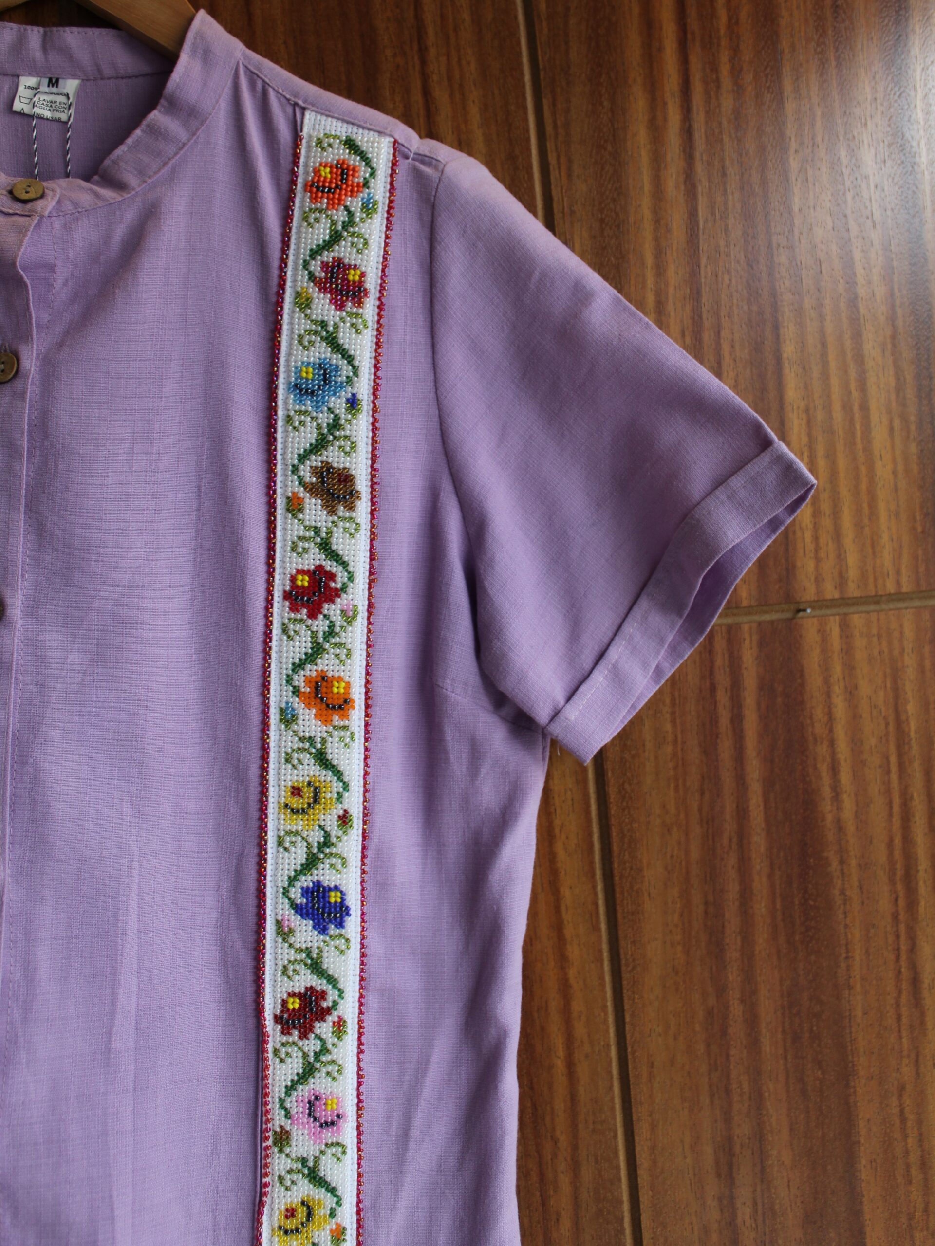 Atrévete a lucir esta blusa tipo guayabera qué mantiene un diseño cómodo, fresco y con un bordado precioso hecho exclusivamente a mano con pequeñas chaquiras que dan vida a una fila de rosas.