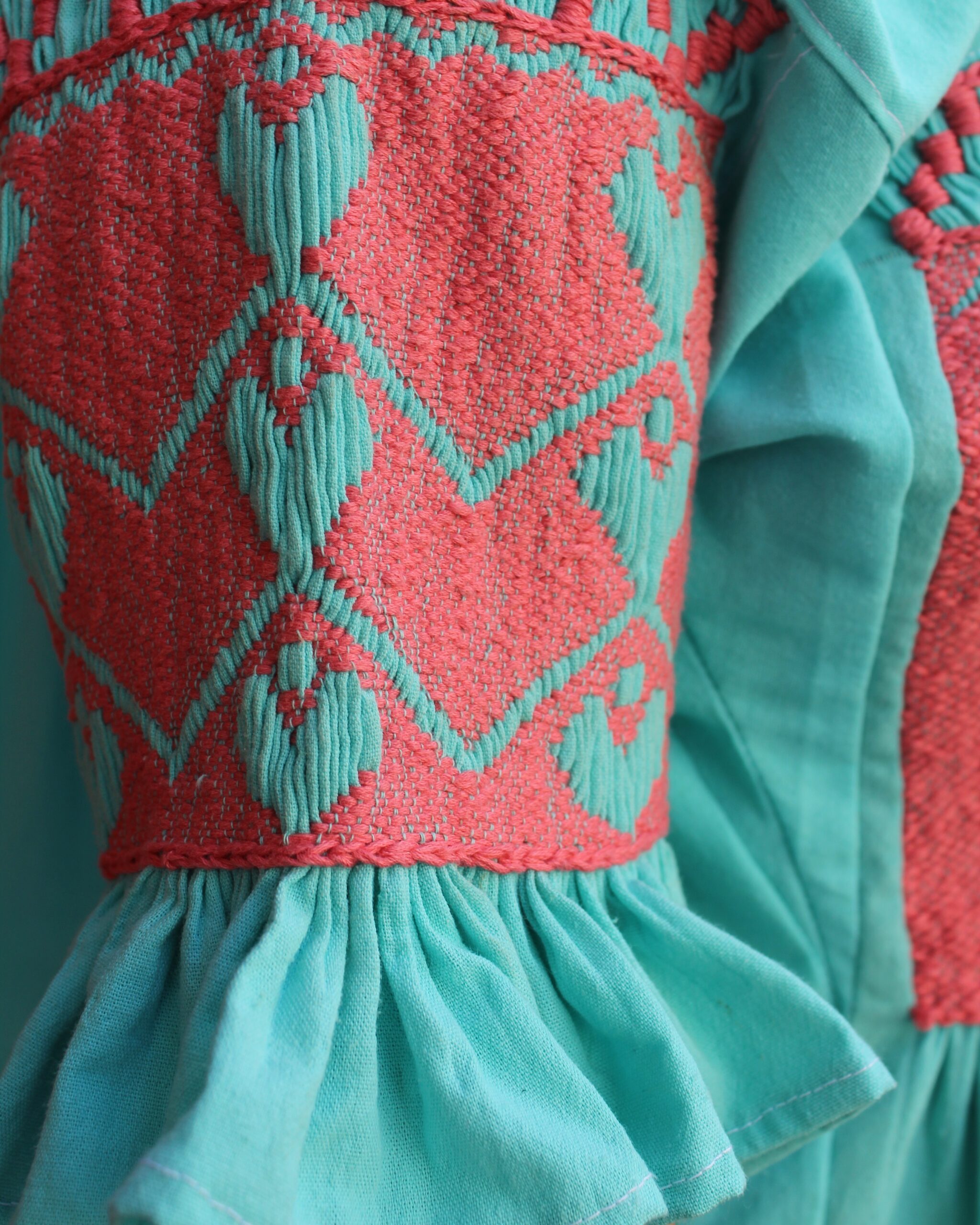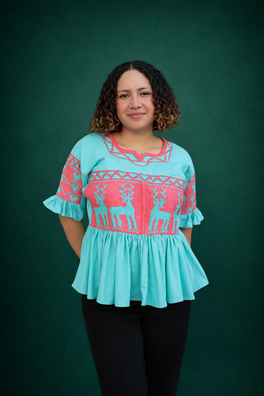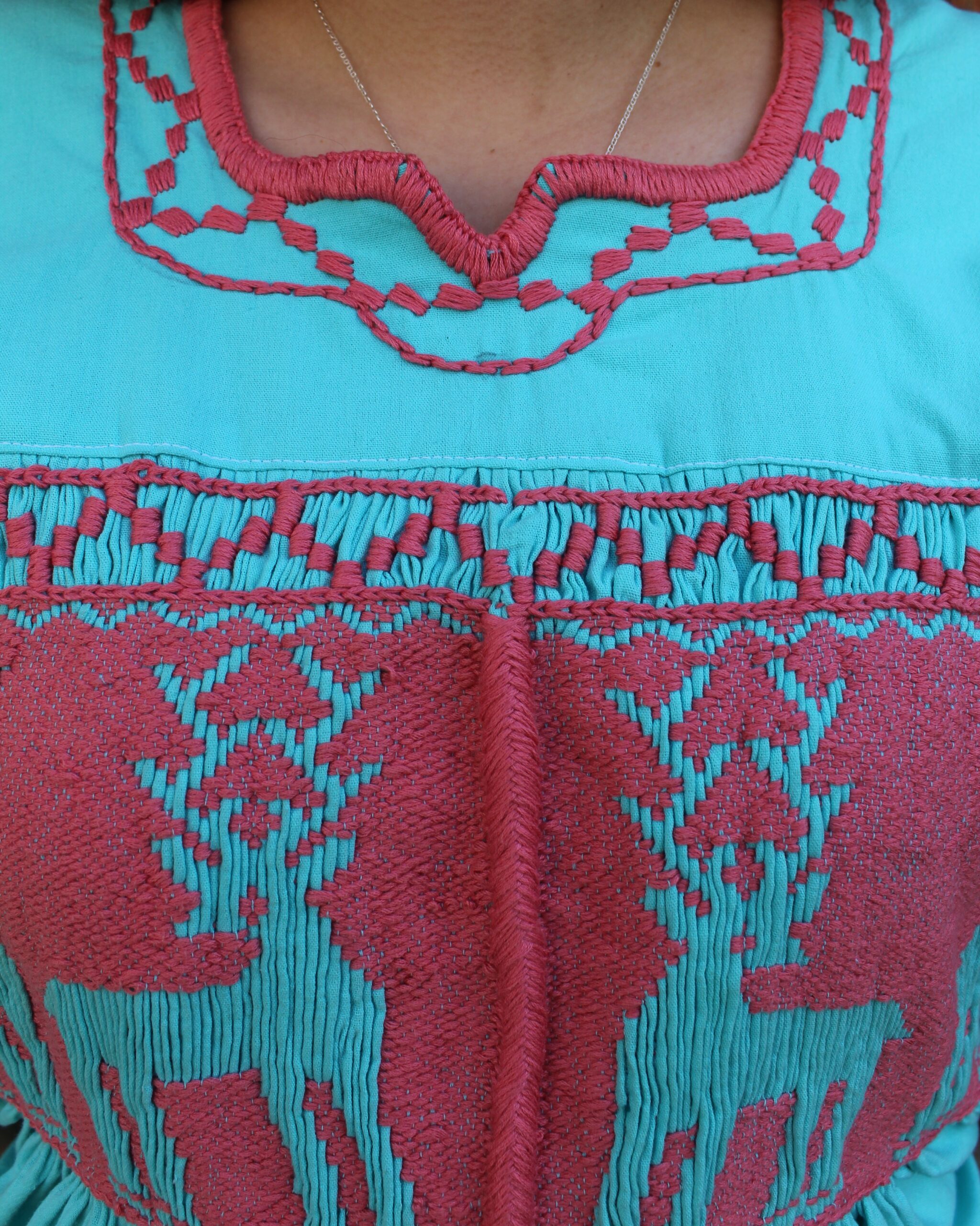 Blusa color jade, con venados bordados en color rosa, elaborada en técnica de pepenado fruncido, que destaca por sus detalles artesanales y hermosa combinación de colores.