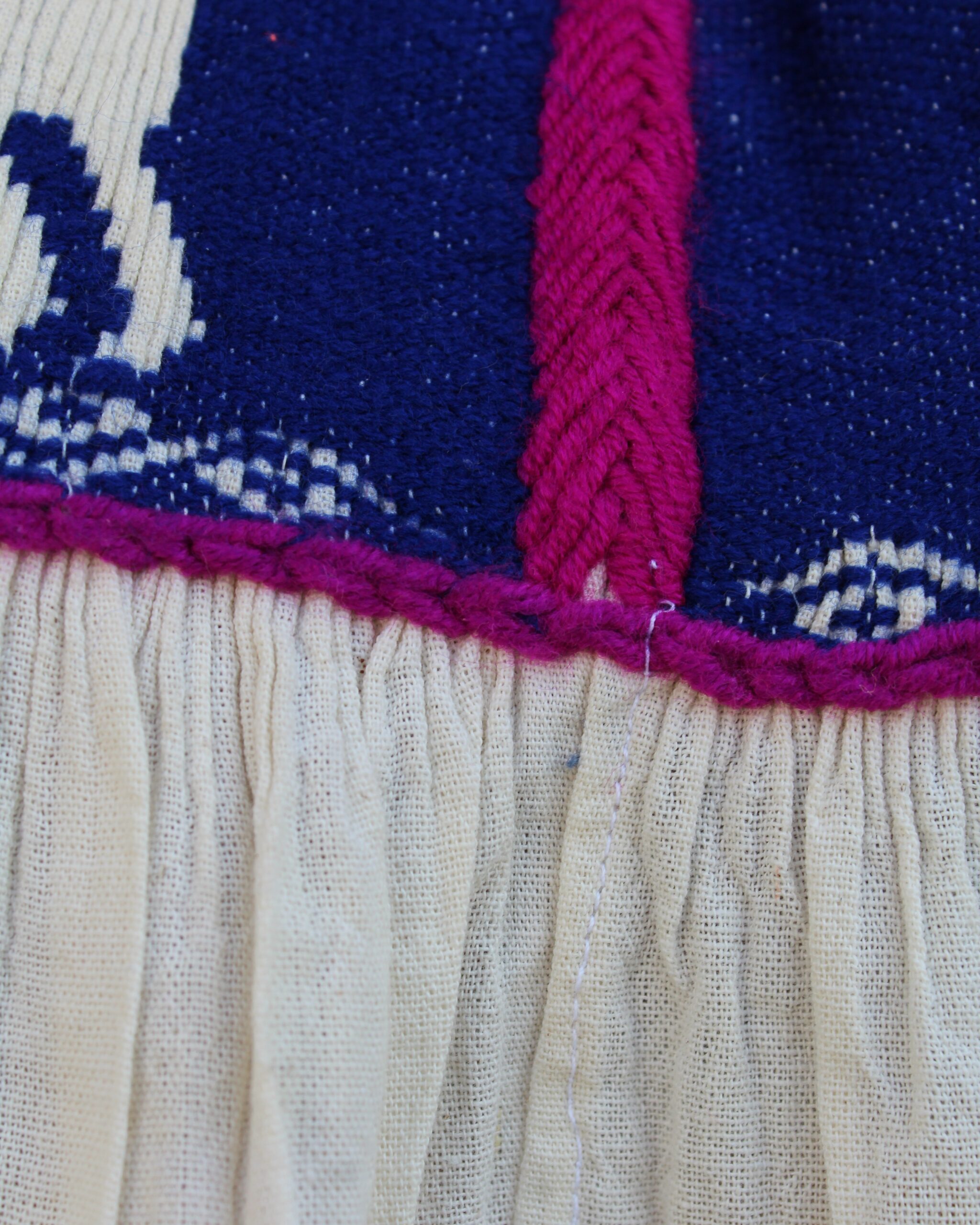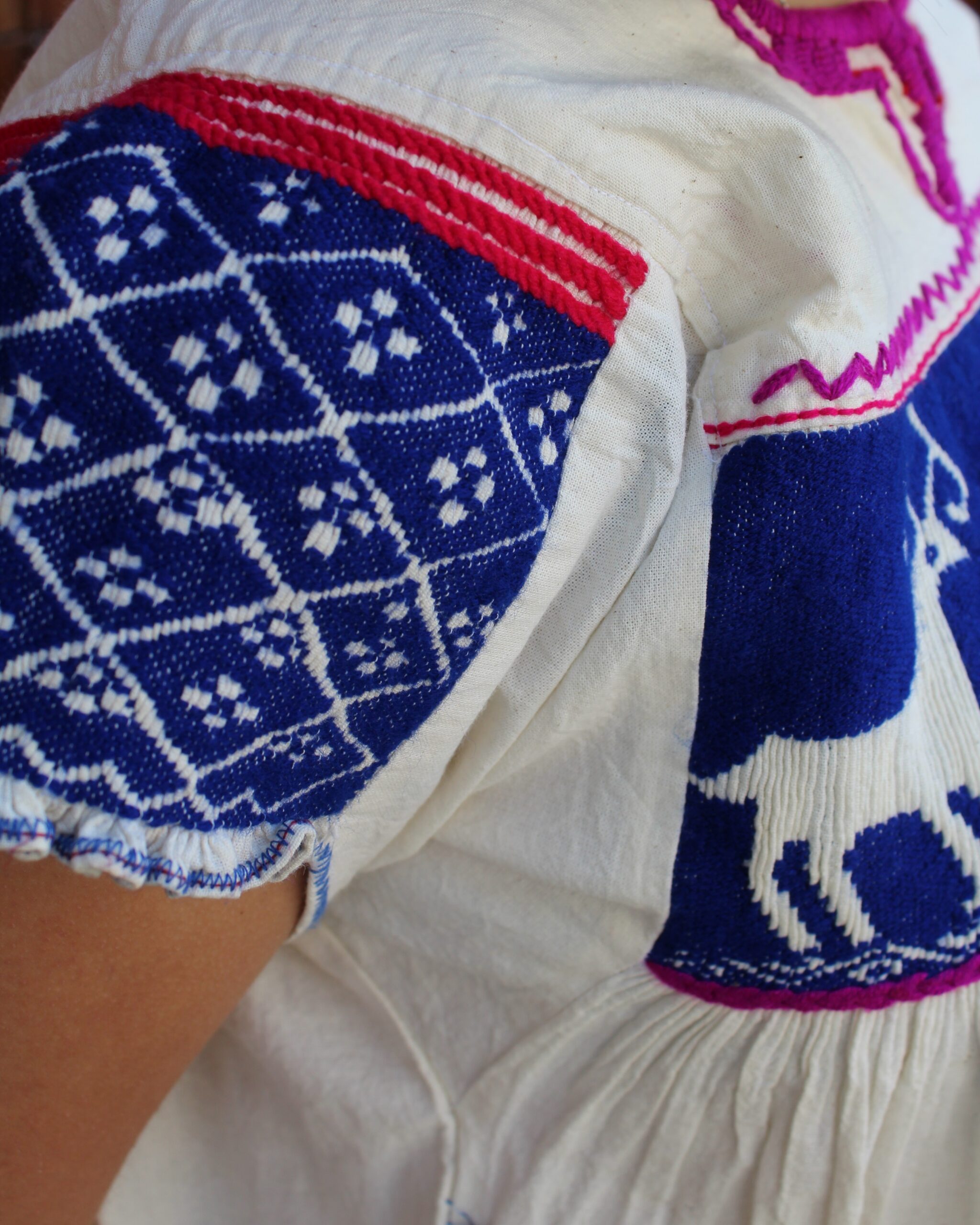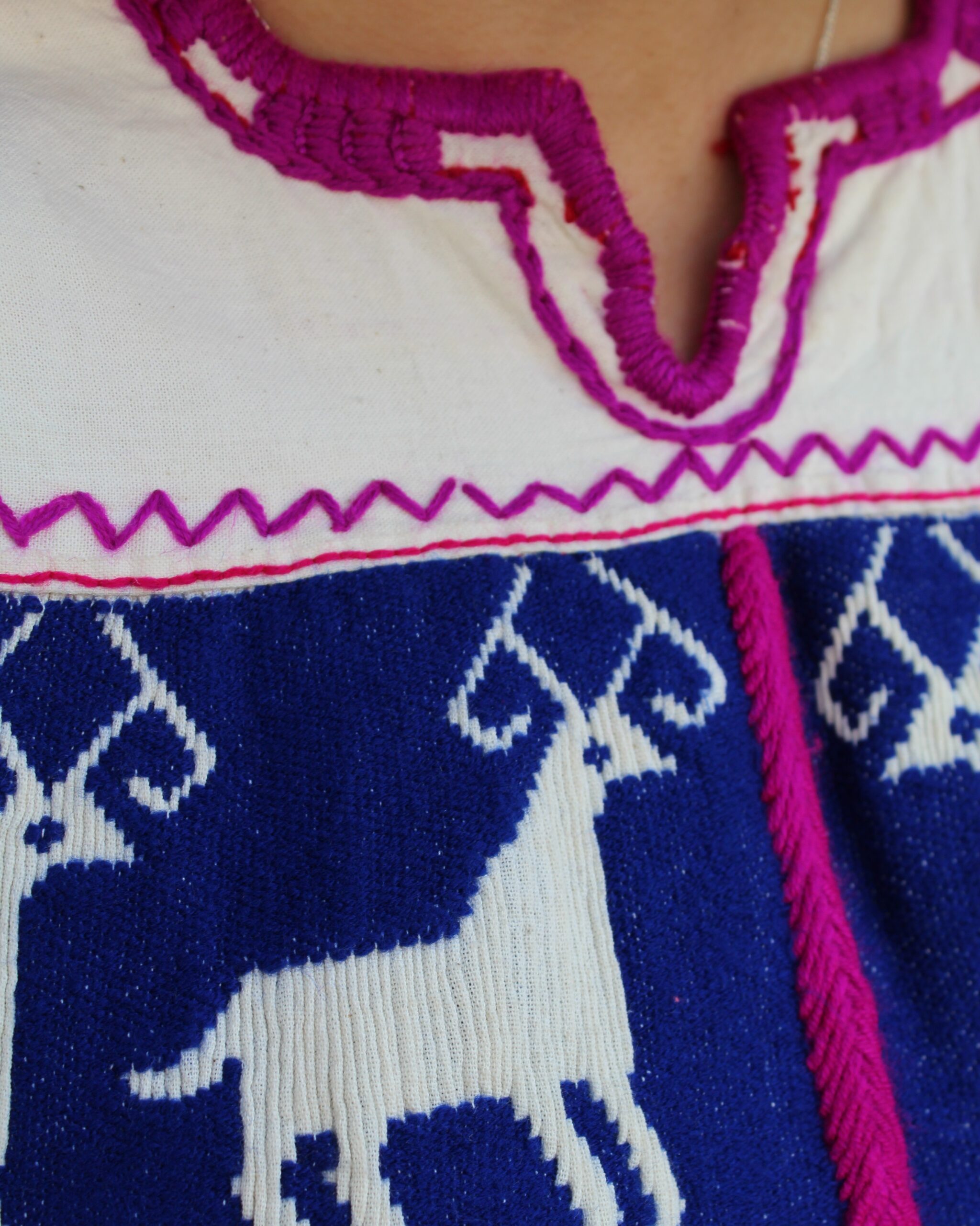 Blusa color natural, con venado bordado en color azul, elaborada en técnica de pepenado fruncido, que destaca por sus finos detalles artesanales.