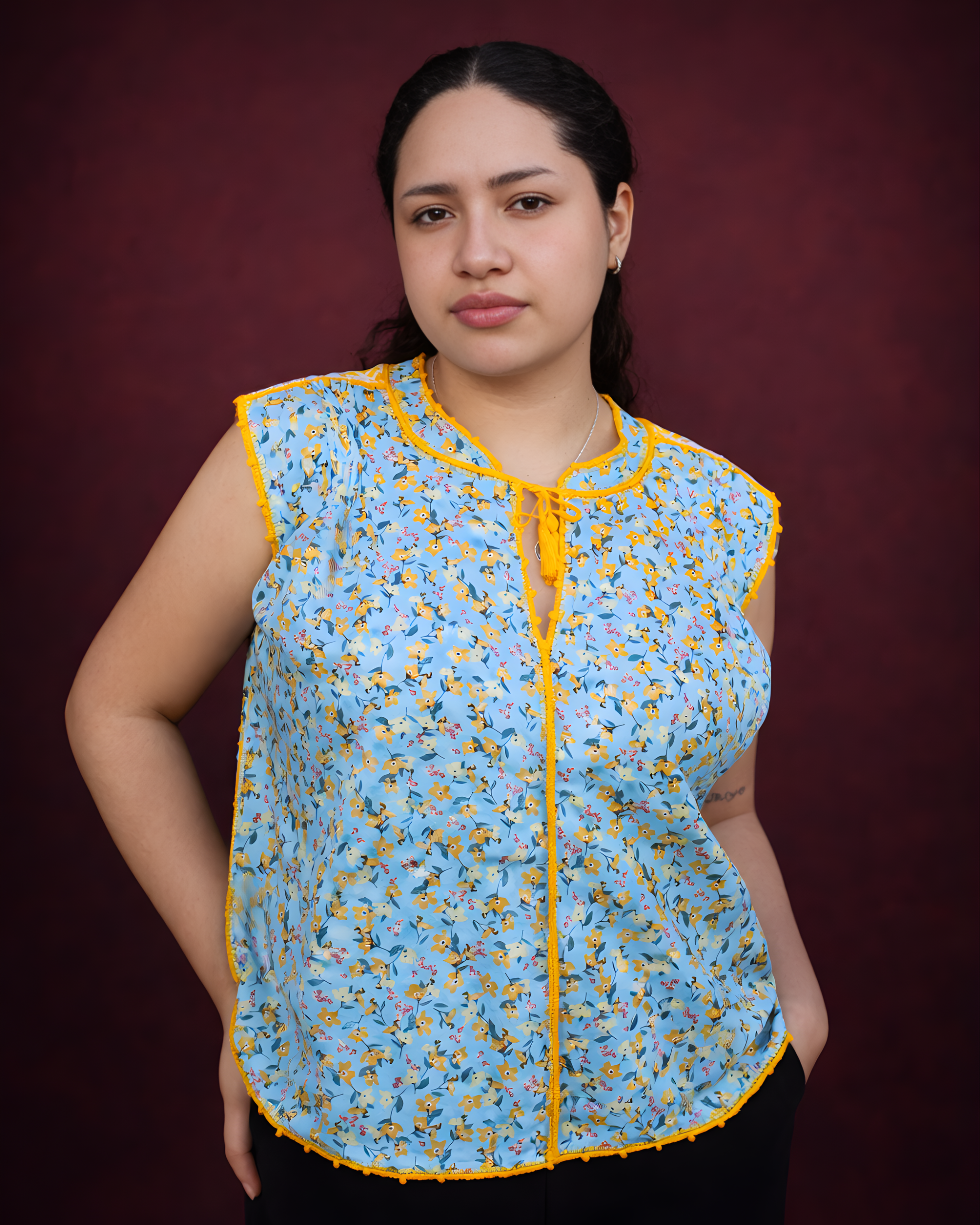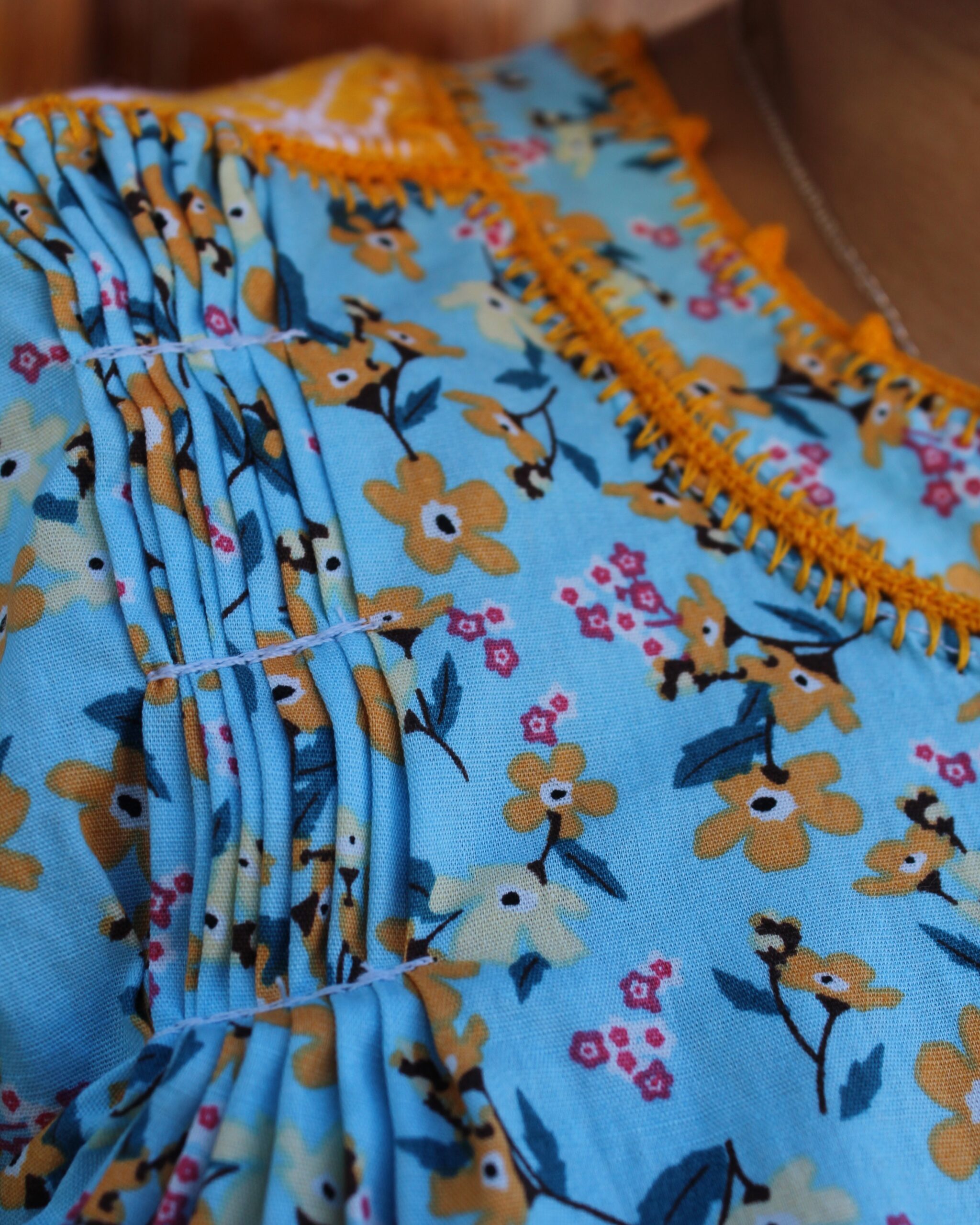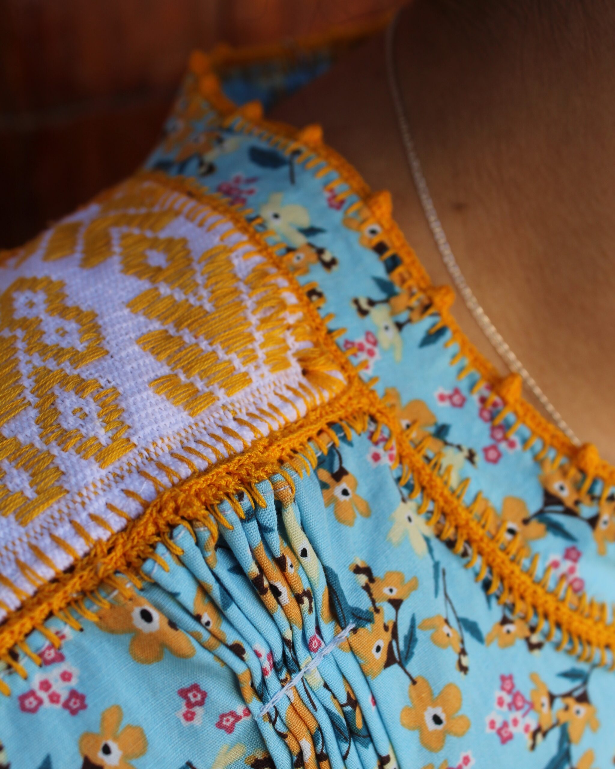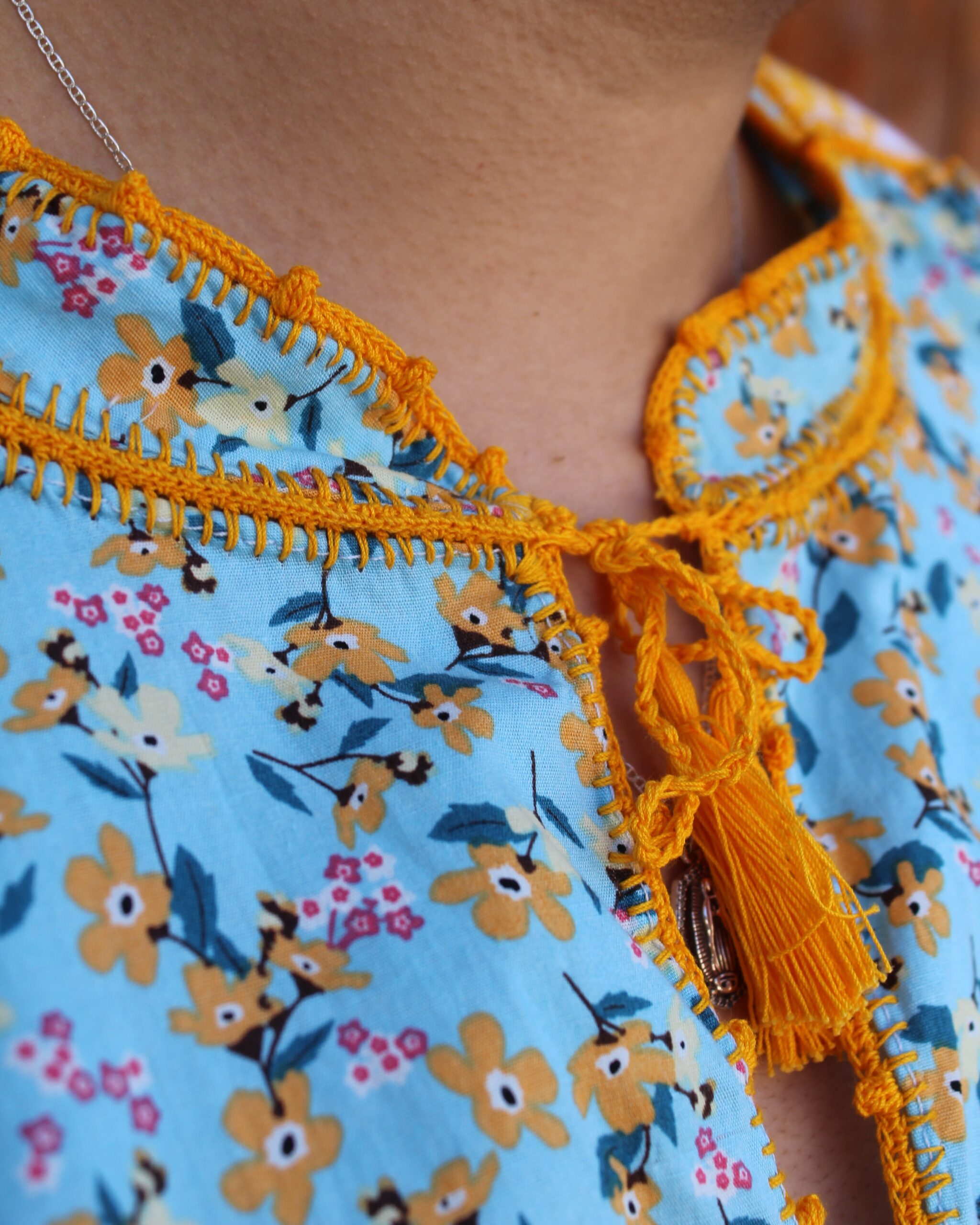 Tradición y frescura en una misma pieza. Única blusa sirena sin mangas hecha de algodón estampado floral en color azul con alforzas en la parte superior, y una aplicación de telar de cintura. Unida con tejido de ganchillo a mano en color amarillo.