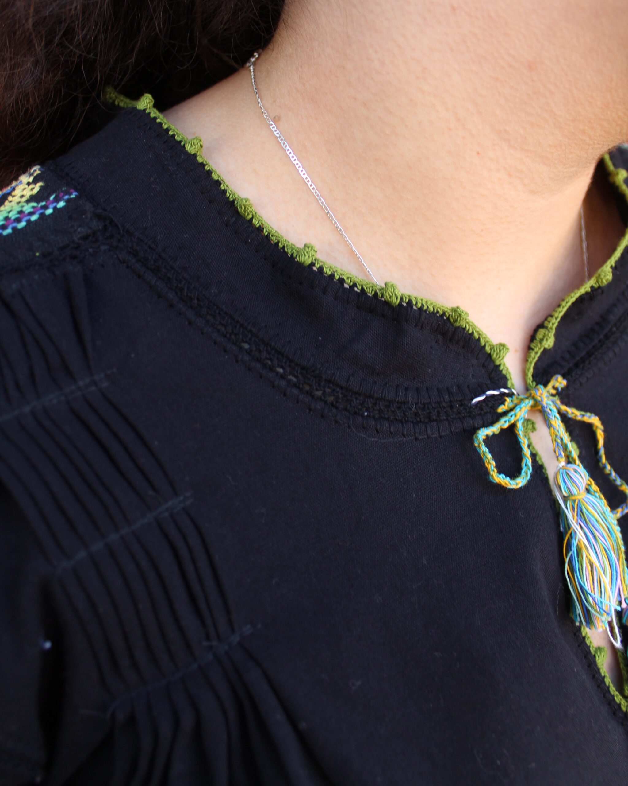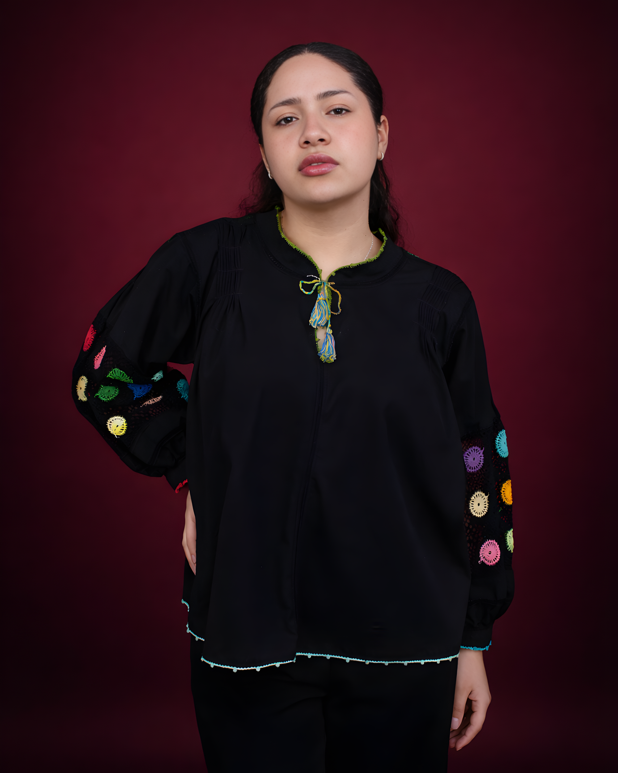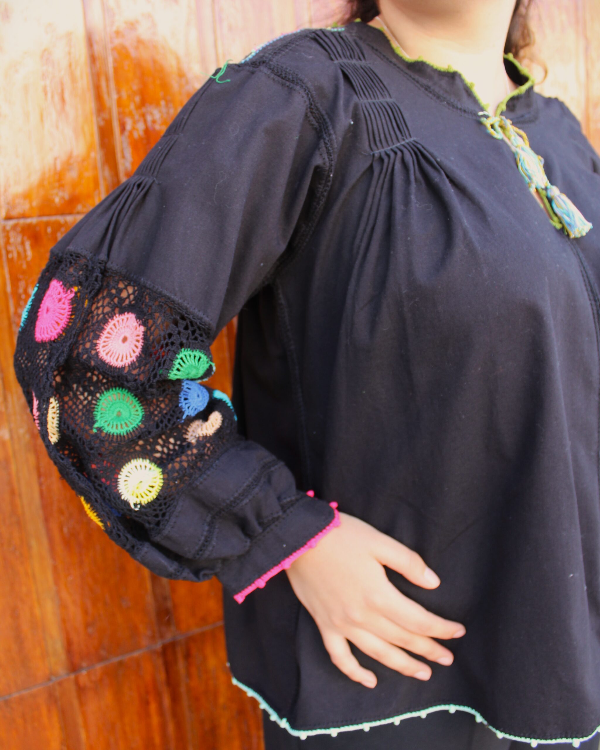 Bordados que embellecen en una misma pieza. Hermosa blusa sirena hecha de algodón en color negro con alforzas en la parte superior, y una aplicación de telar de cintura. Unida con tejido de ganchillo a mano y uno extra en la manga.