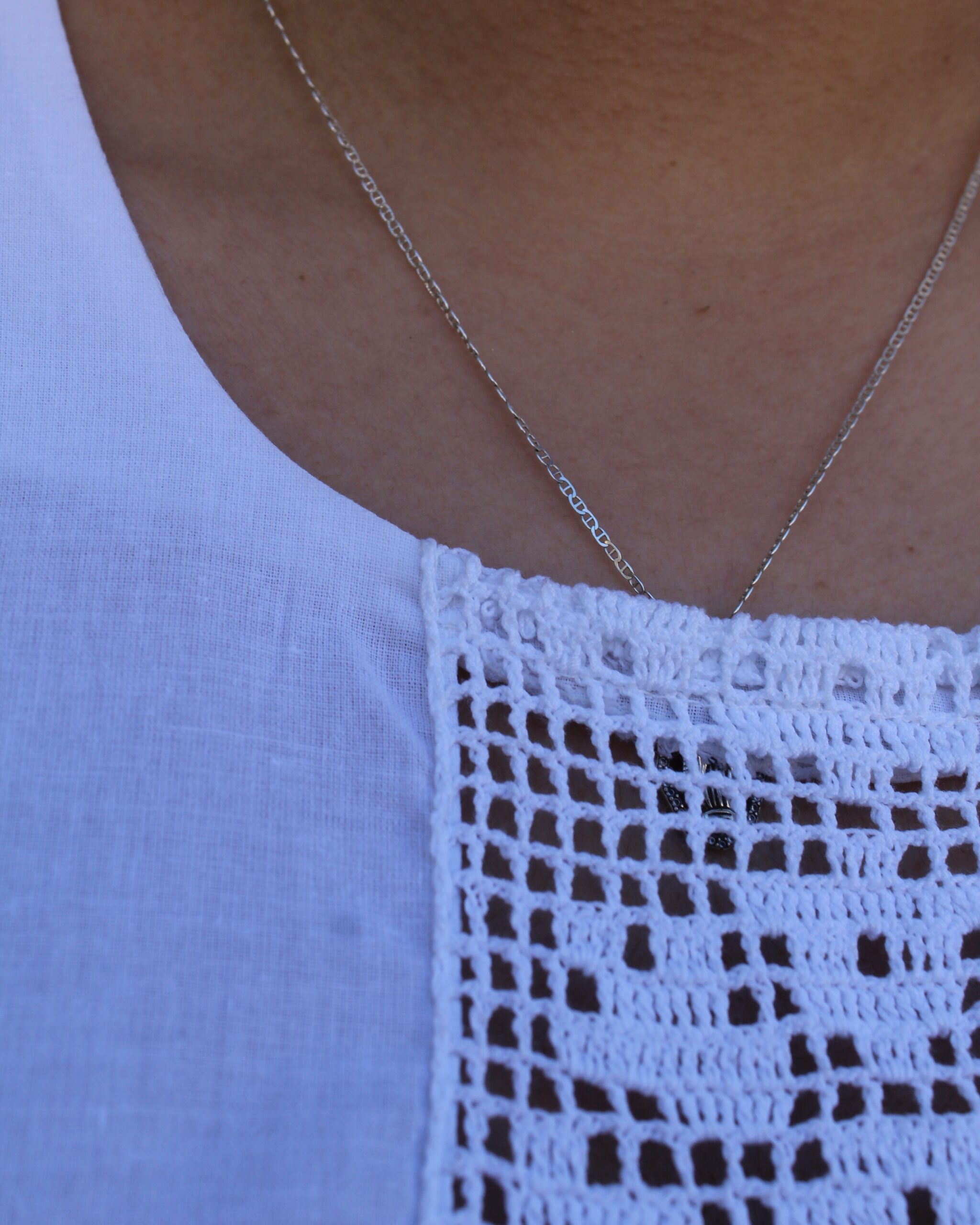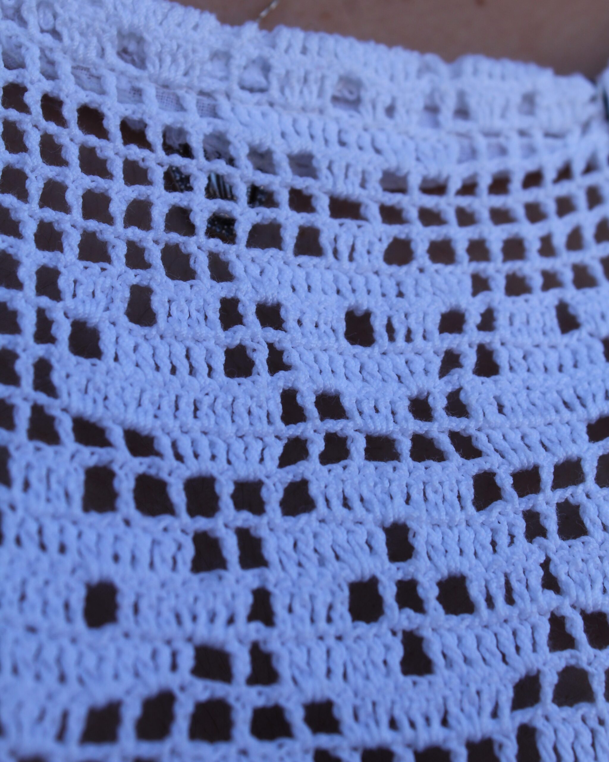 Elegante blusa hecha de algodón en color blanco sin mangas con tejido de ganchillo a mano en el mismo color en la parte central.