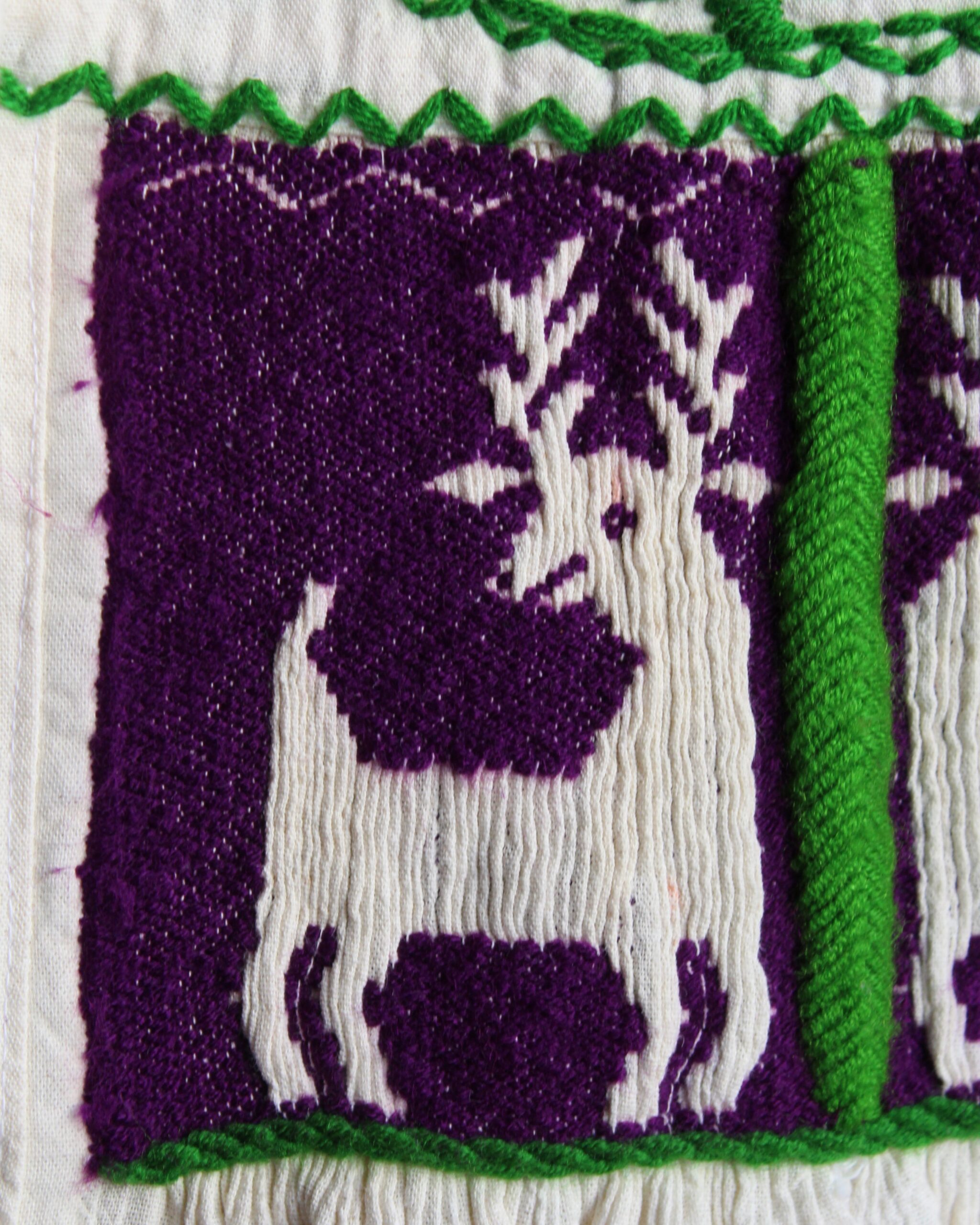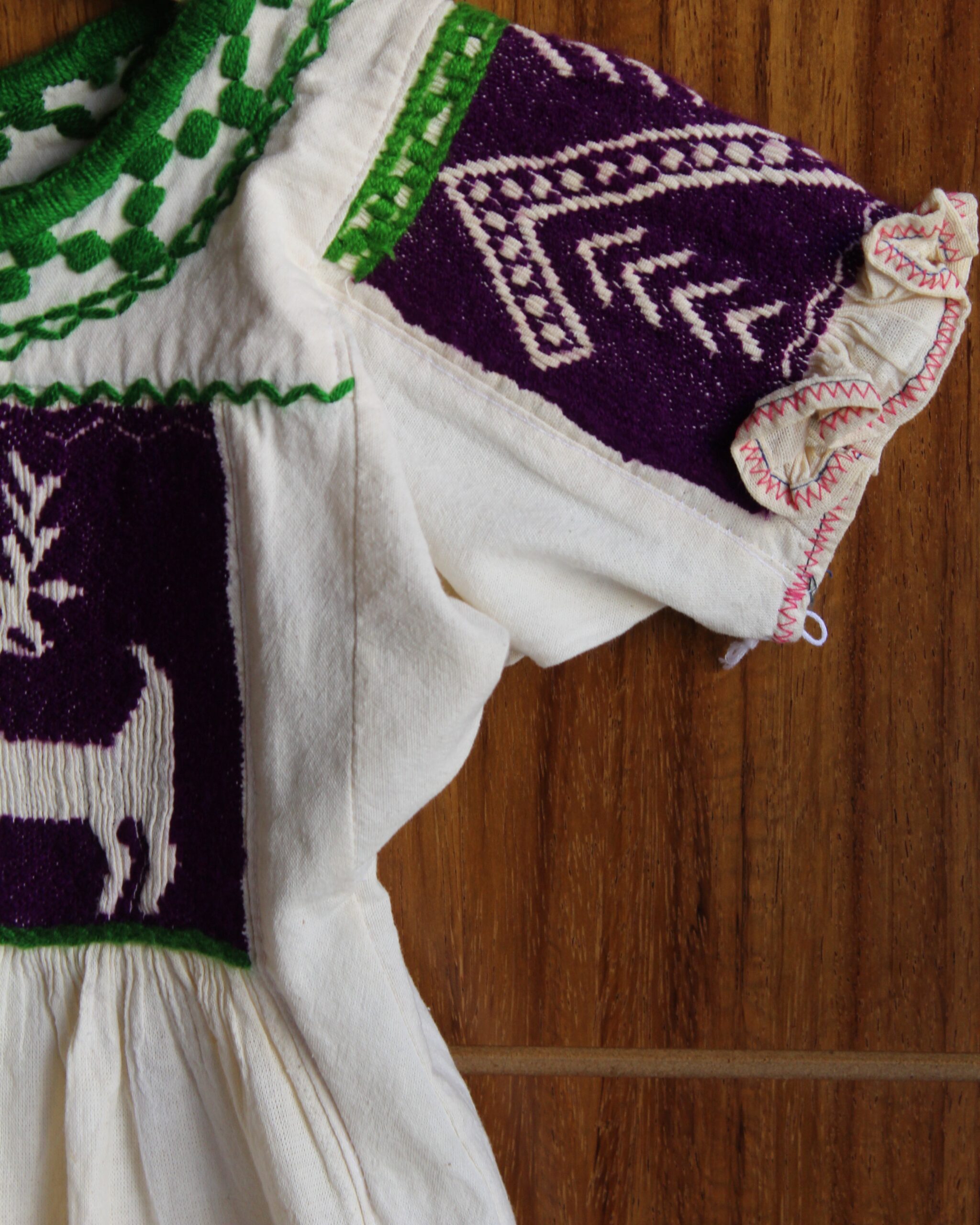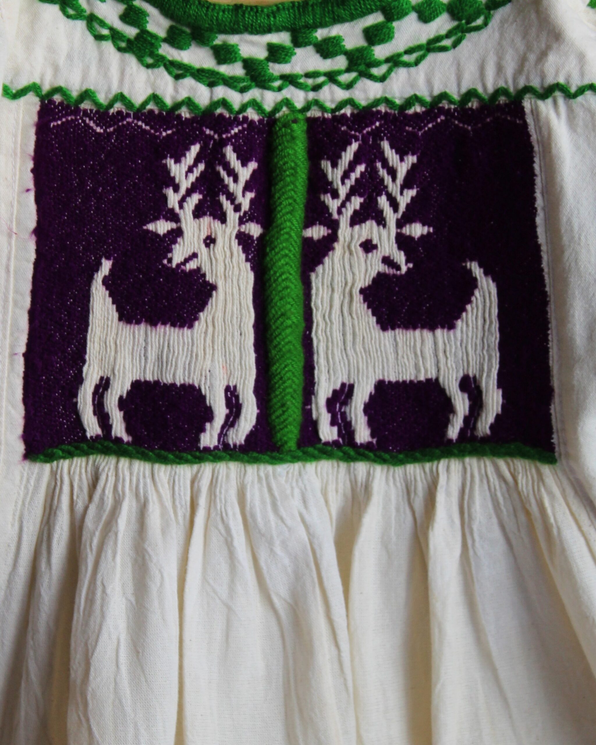 Blusa para niña color natural, con venado bordado en color lila, elaborado en técnica de pepenado fruncido, que destaca por sus finos detalles artesanales