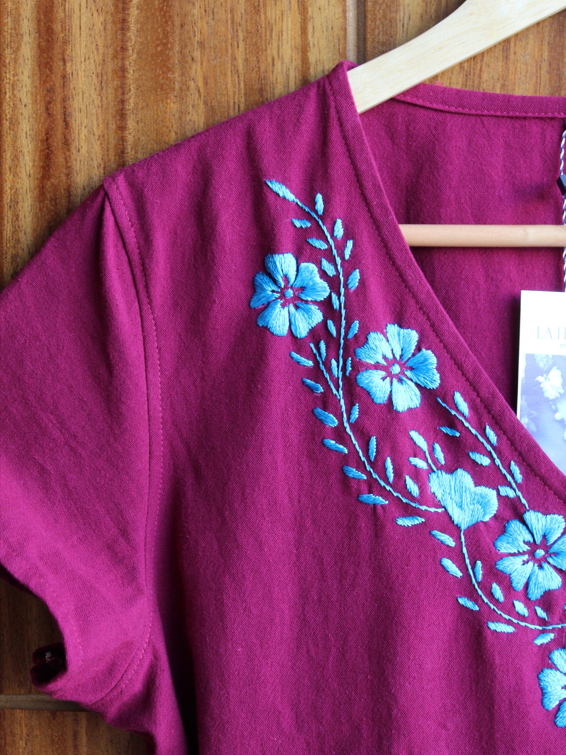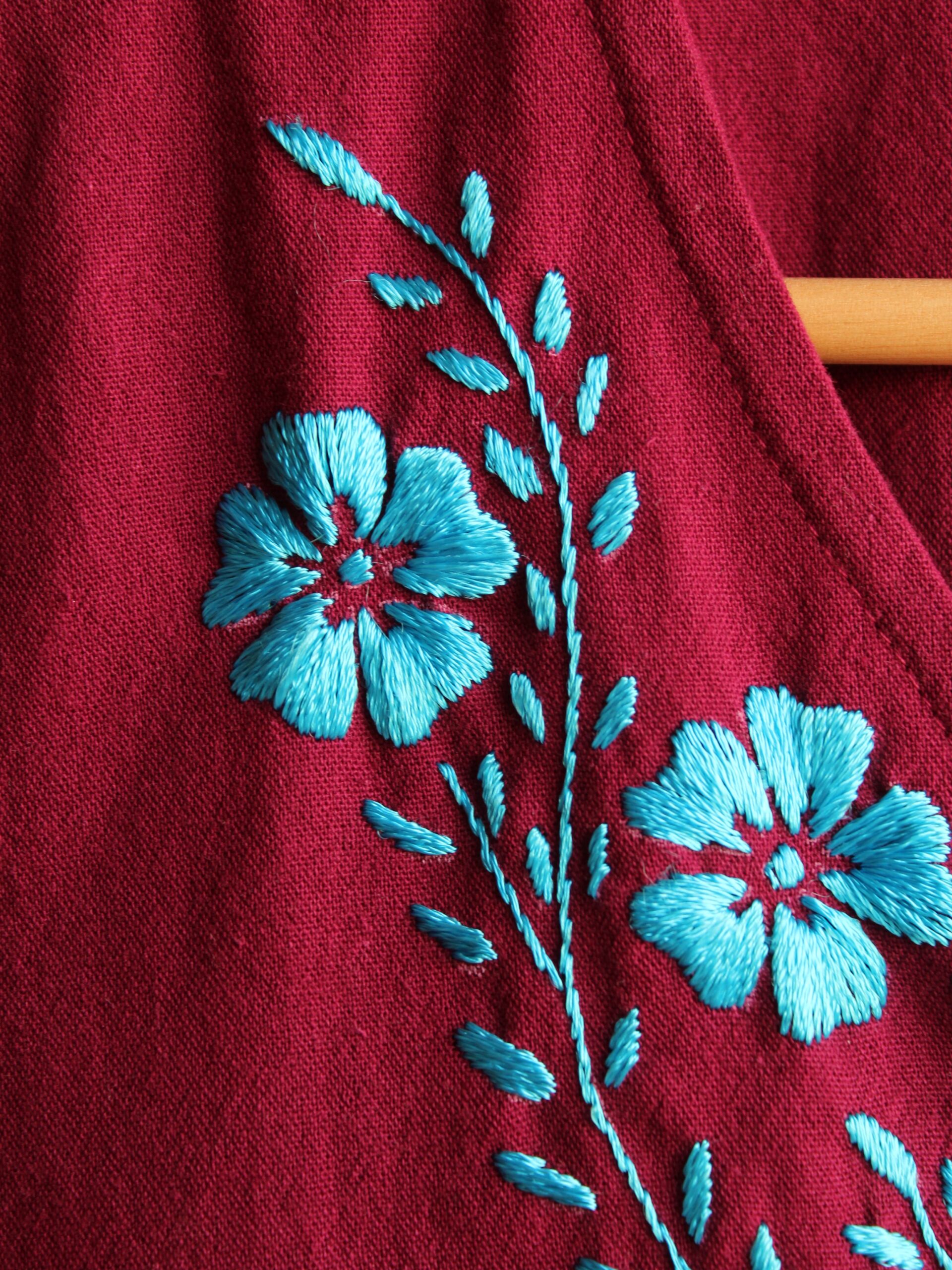 Combinando un color intenso con el contraste de un bordado perfecto hecho a mano en azul turquesa, esta blusa es una celebración de la artesanía textil, además tiene un diseño de escote en V muy favorecedor y un par de cintas en la parte de atrás que permiten un ajuste personalizado en la cintura.