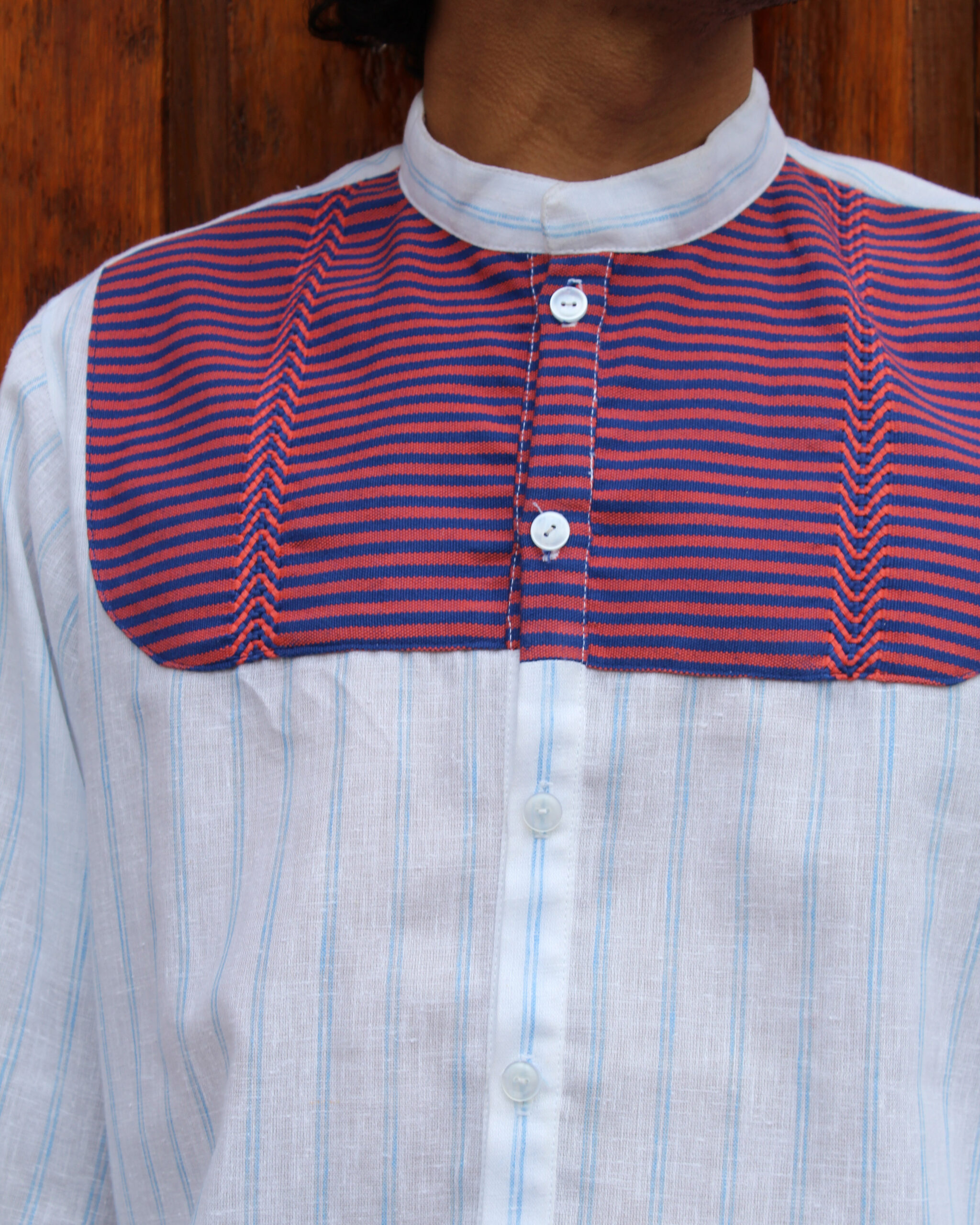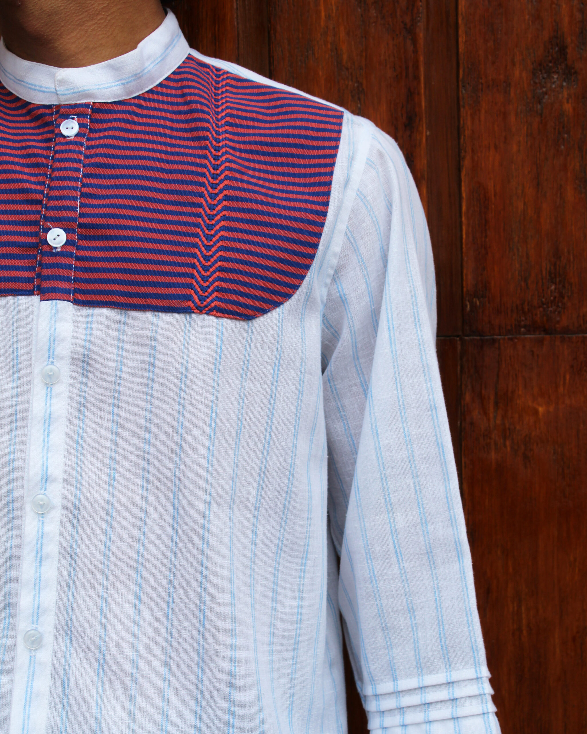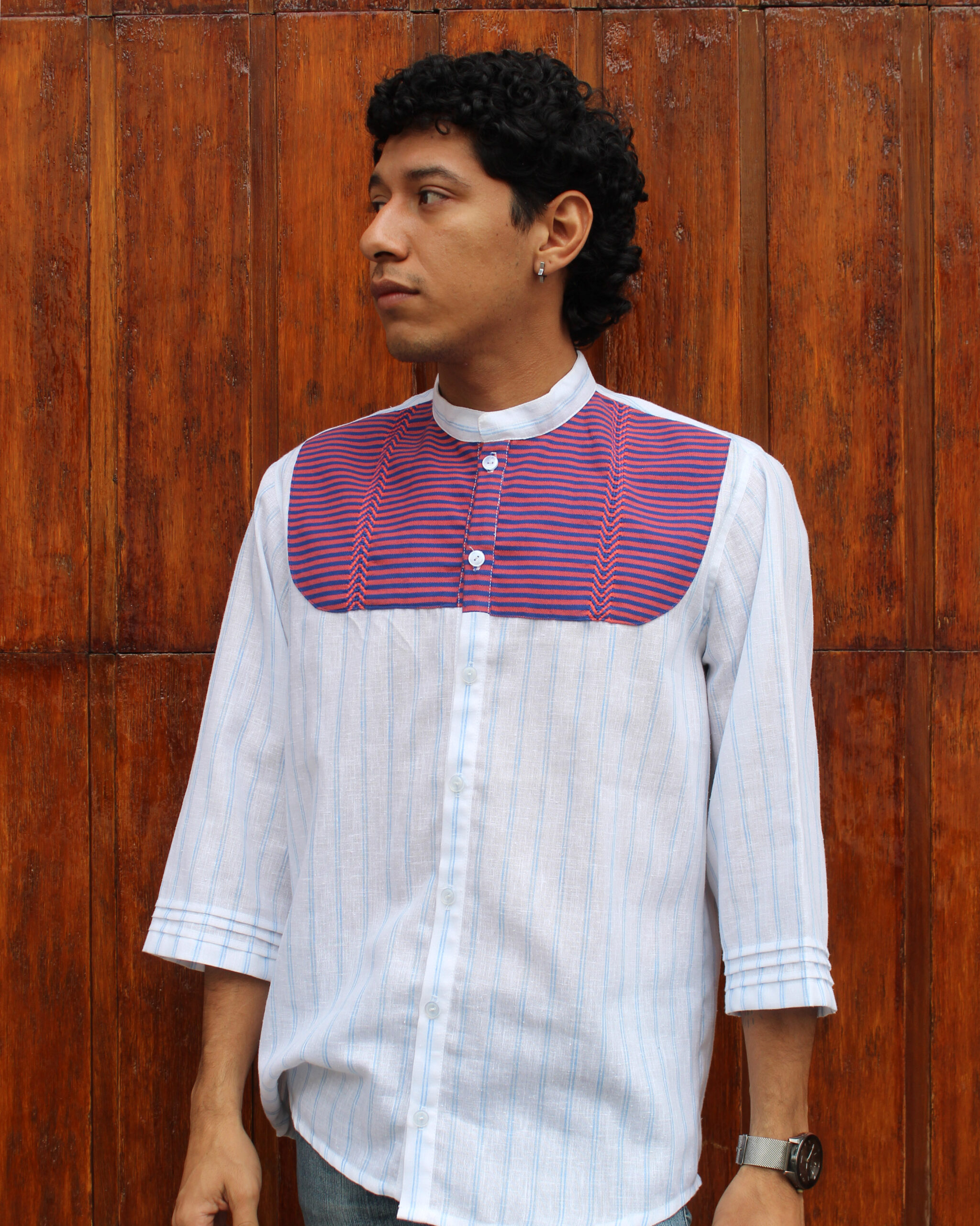 Camisa de lino con pechera en telar y brocado Petatillo con un toque artesanal que une elegancia, tradición y estilo único.