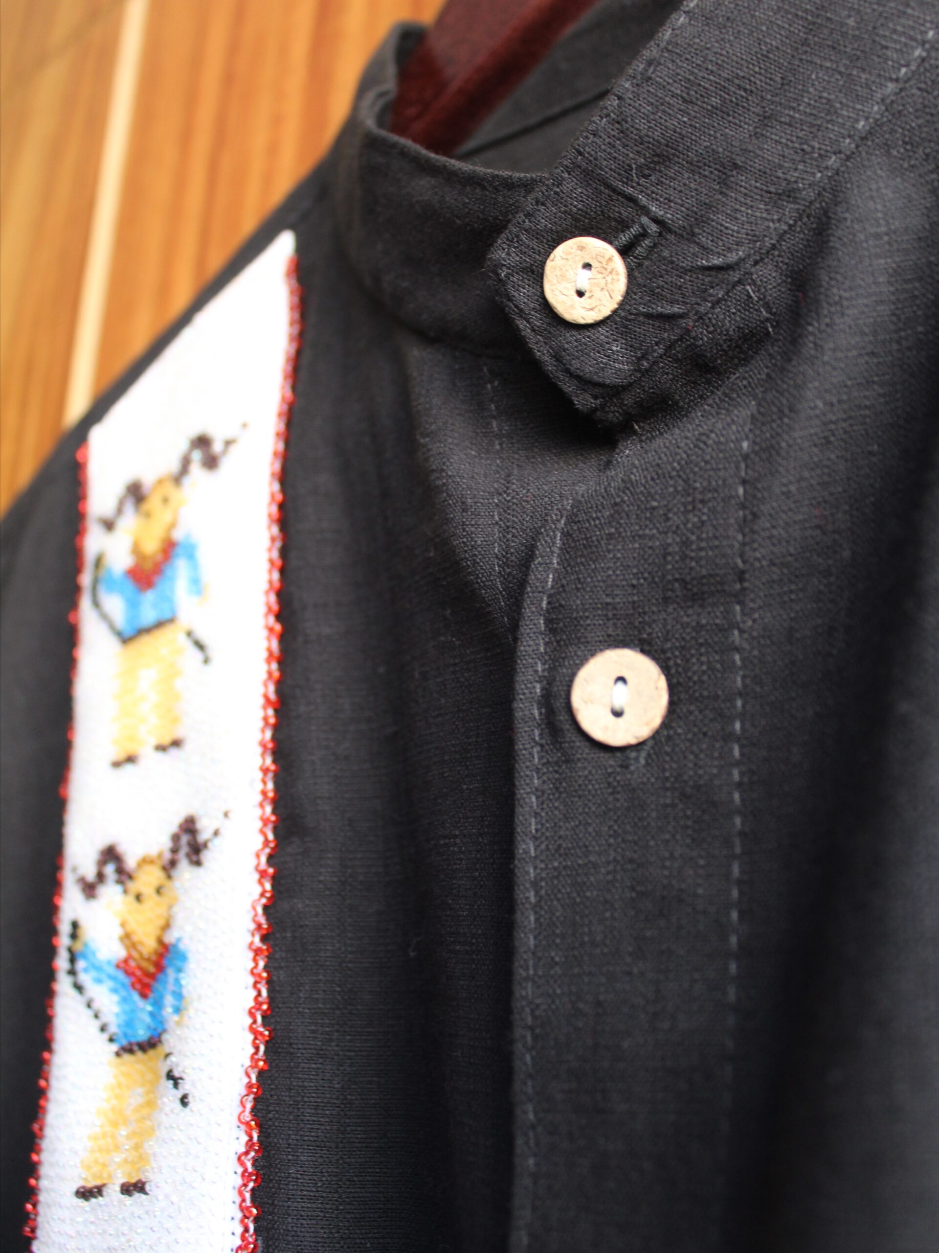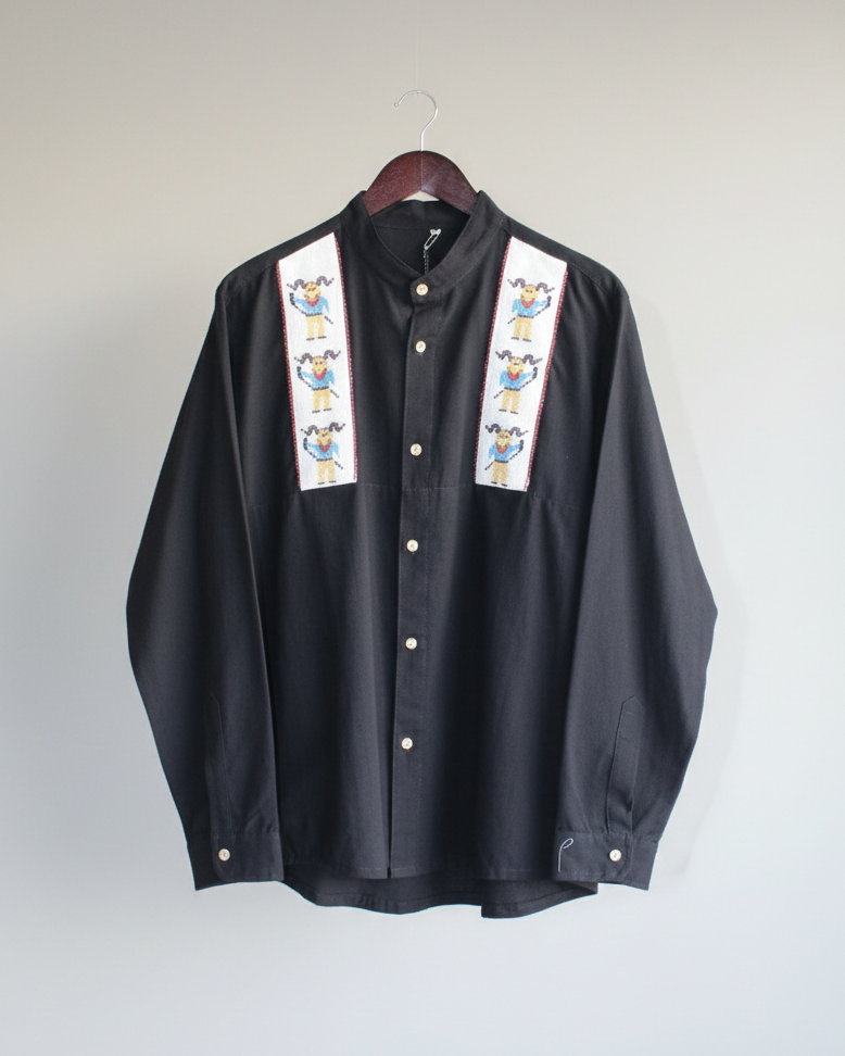 Una increíble camisa hecha de lino algodón en color negro bordada meticulosamente a mano con miles de pequeñas chaquiras, el diseño presenta figuras de diablitos tradicionales. Cada cuenta ha sido colocada individualmente, creando una textura tridimensional que te hará resaltar en cualquier lugar.