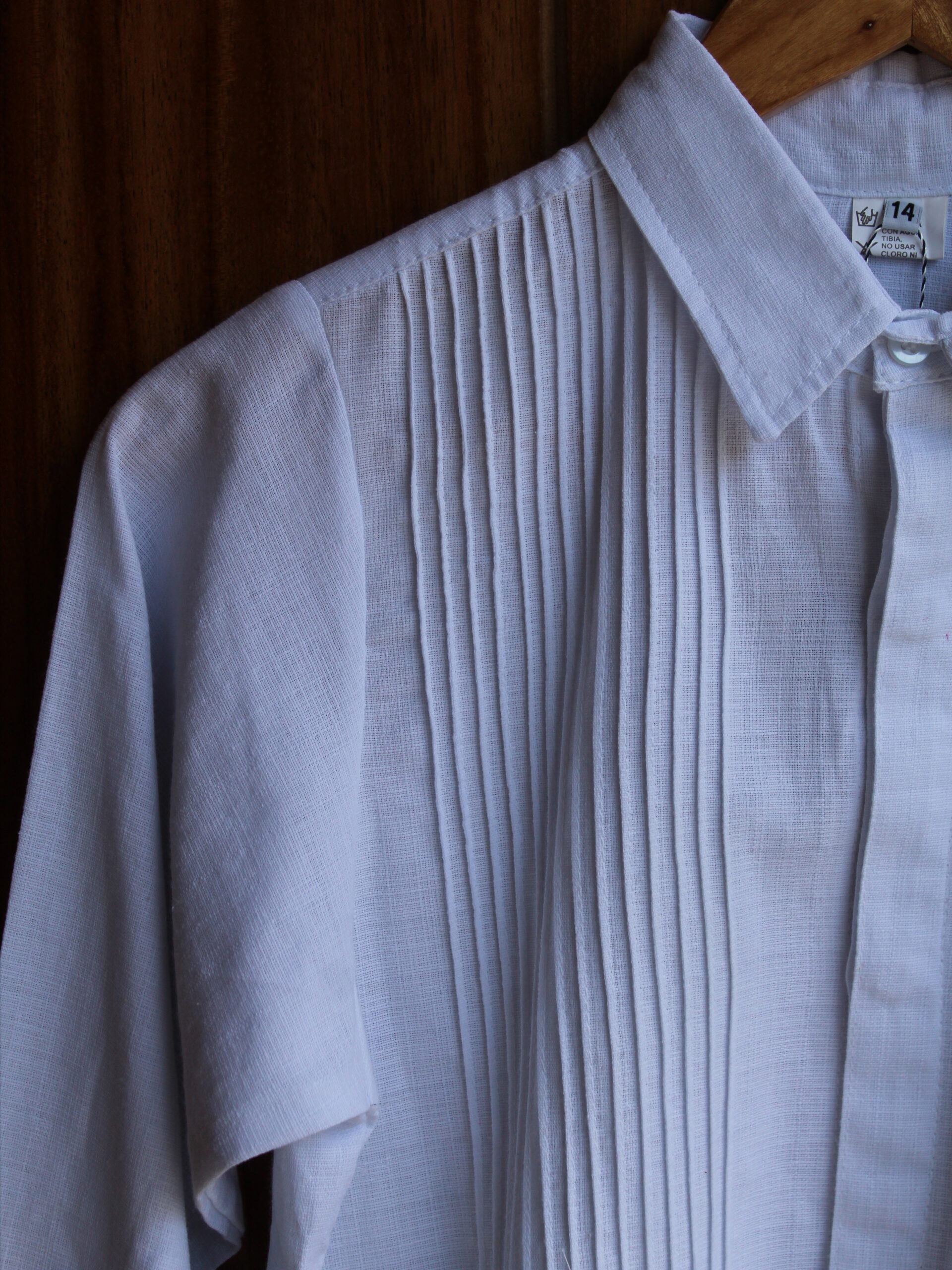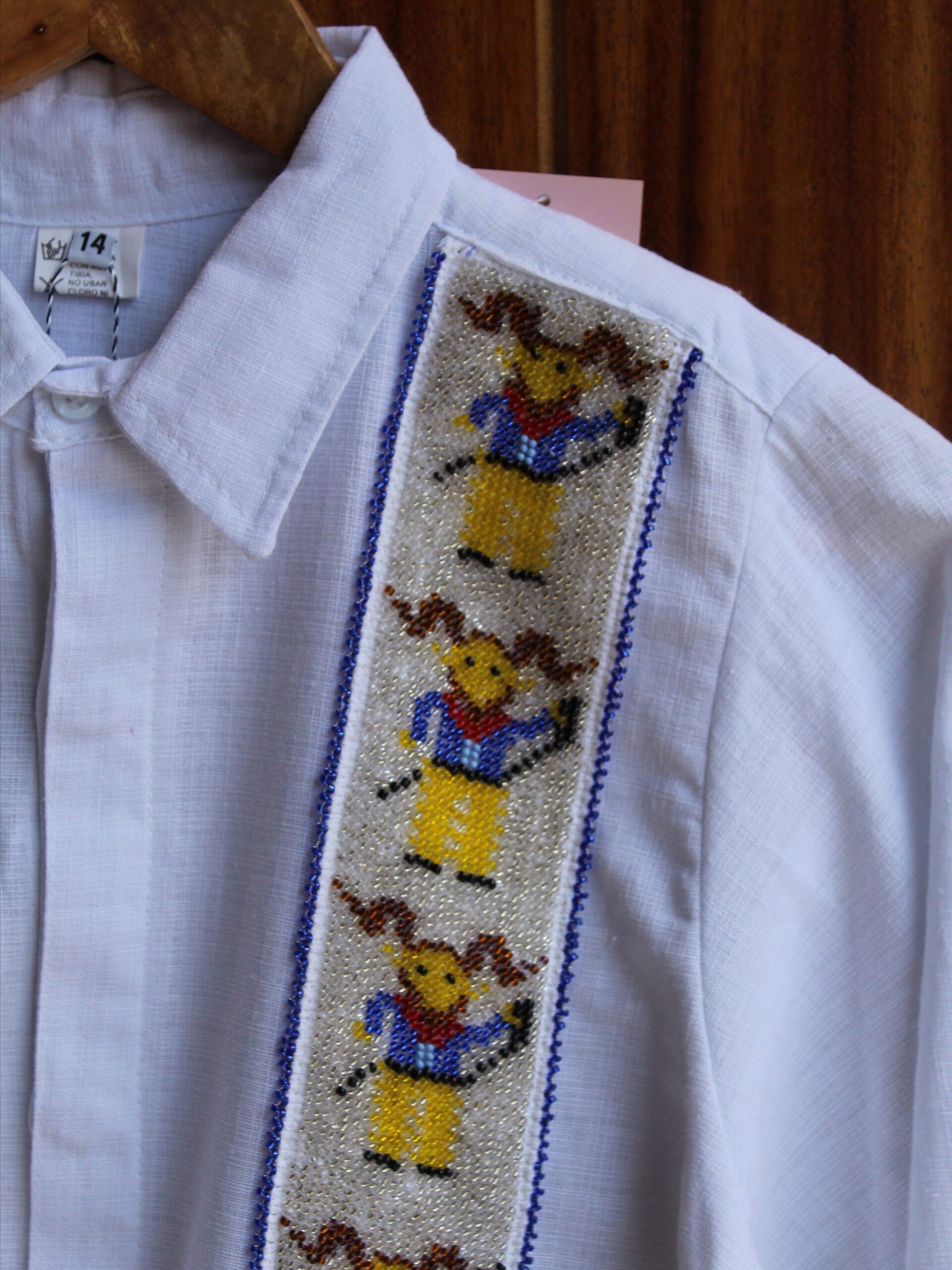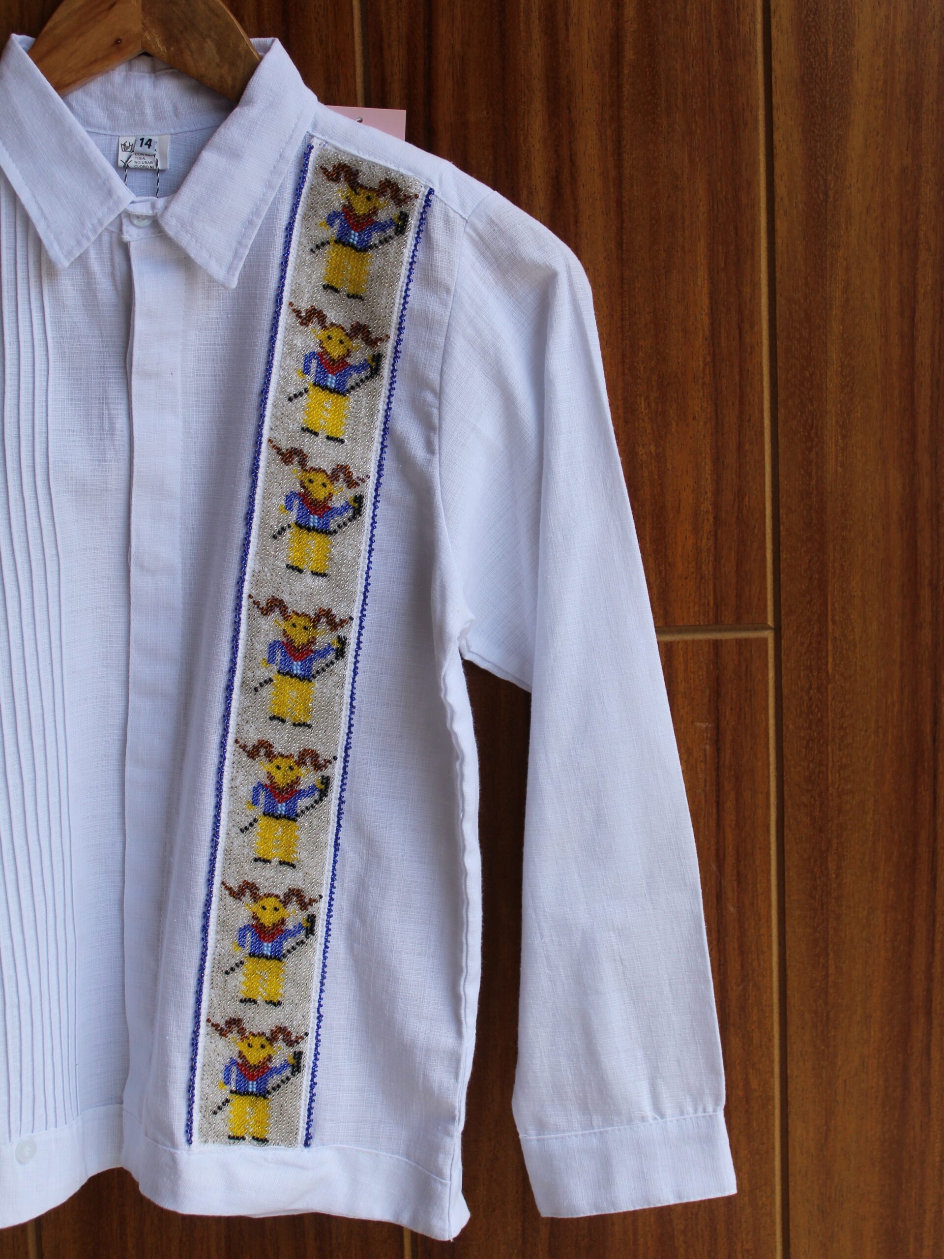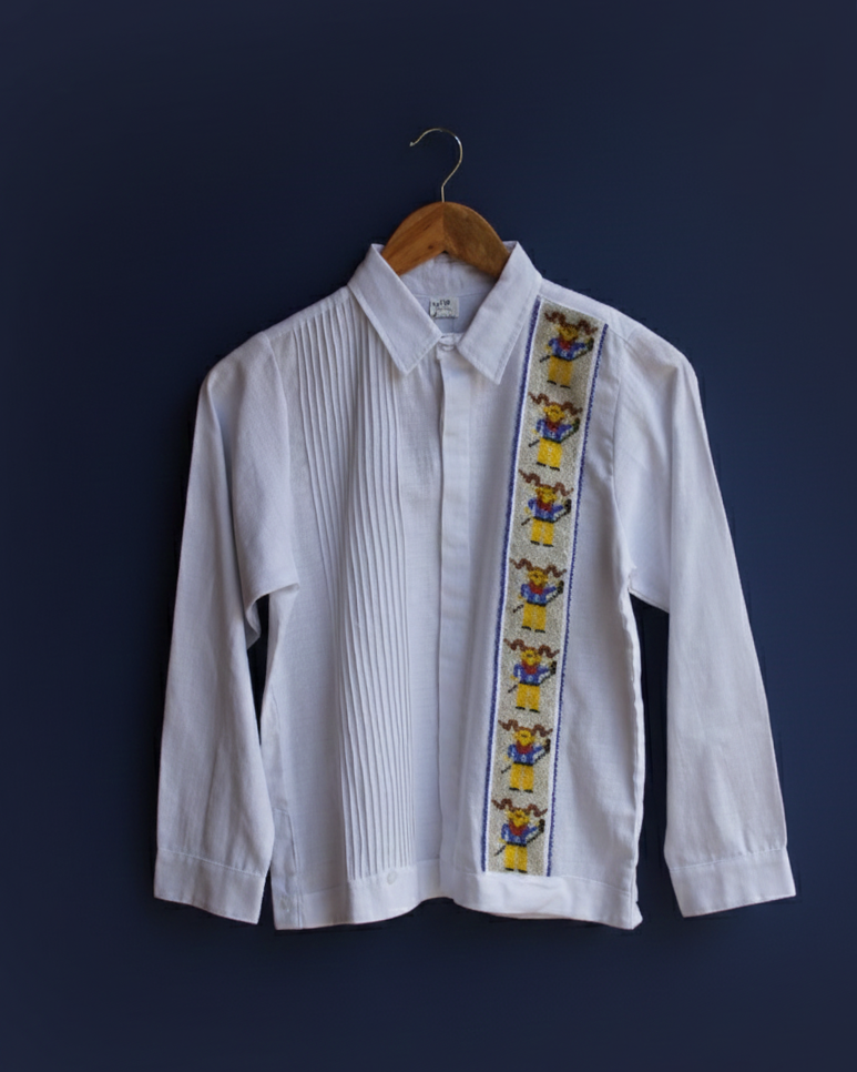 Viste a tu peque con esta bonita camisa tipo guayabera de lino/algodón en color blanca, con manga larga, lo que la hace única es su espectacular y meticuloso bordado de chaquira hecho a mano, que da vida a una fila de diablitos.