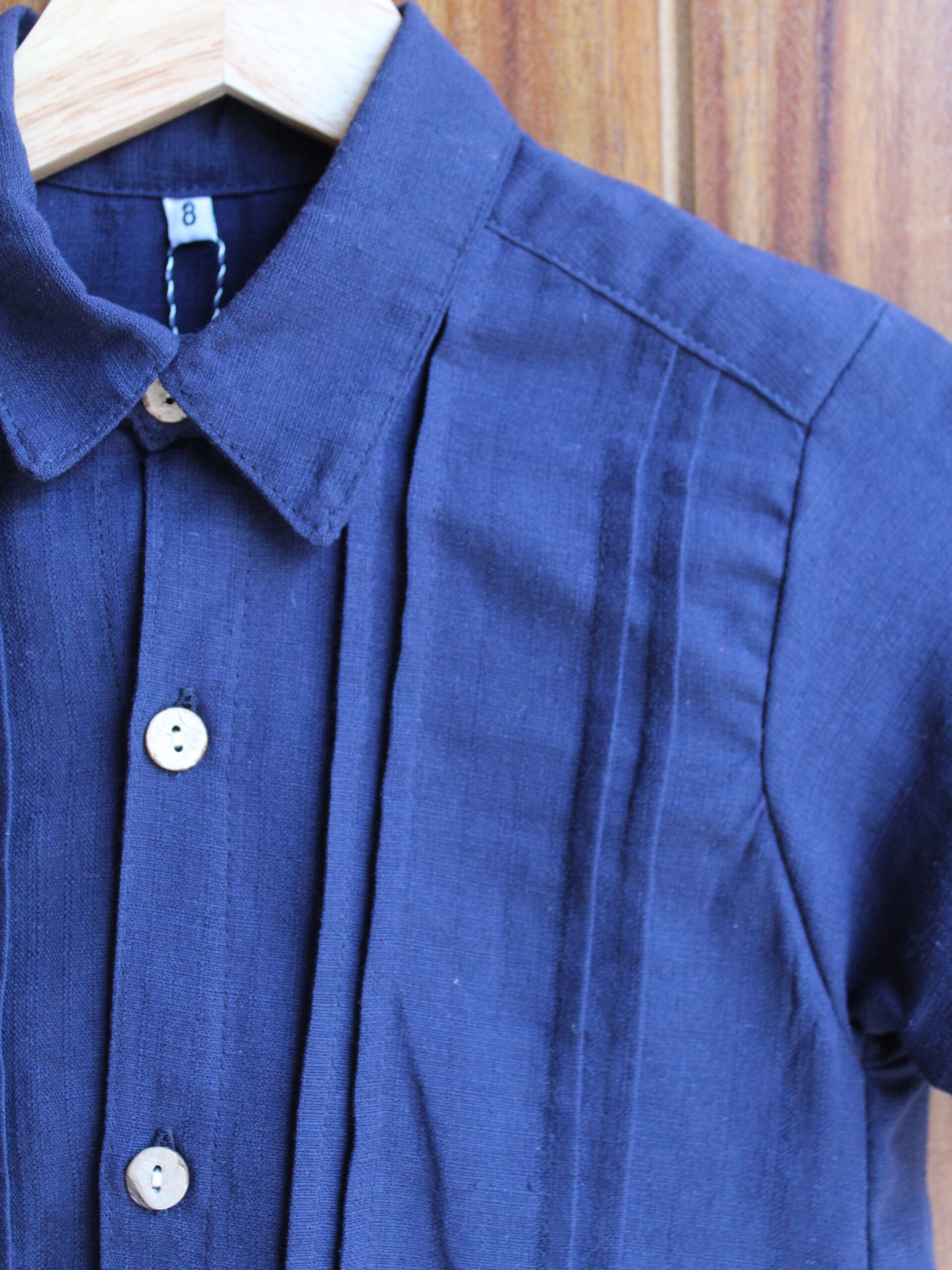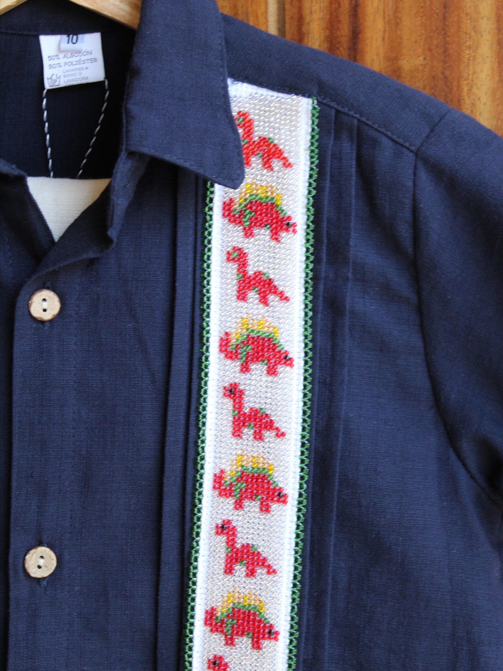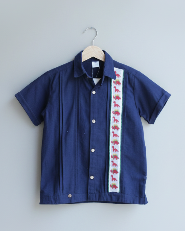 Viste a tu peque con esta bonita camisa tipo guayabera de lino/algodón en color azul marino, con manga corta, lo que la hace única es su espectacular y meticuloso bordado de chaquira hecho a mano, que da vida a una fila de divertidos dinosaurios que le encantarán a los más pequeños de la casa.