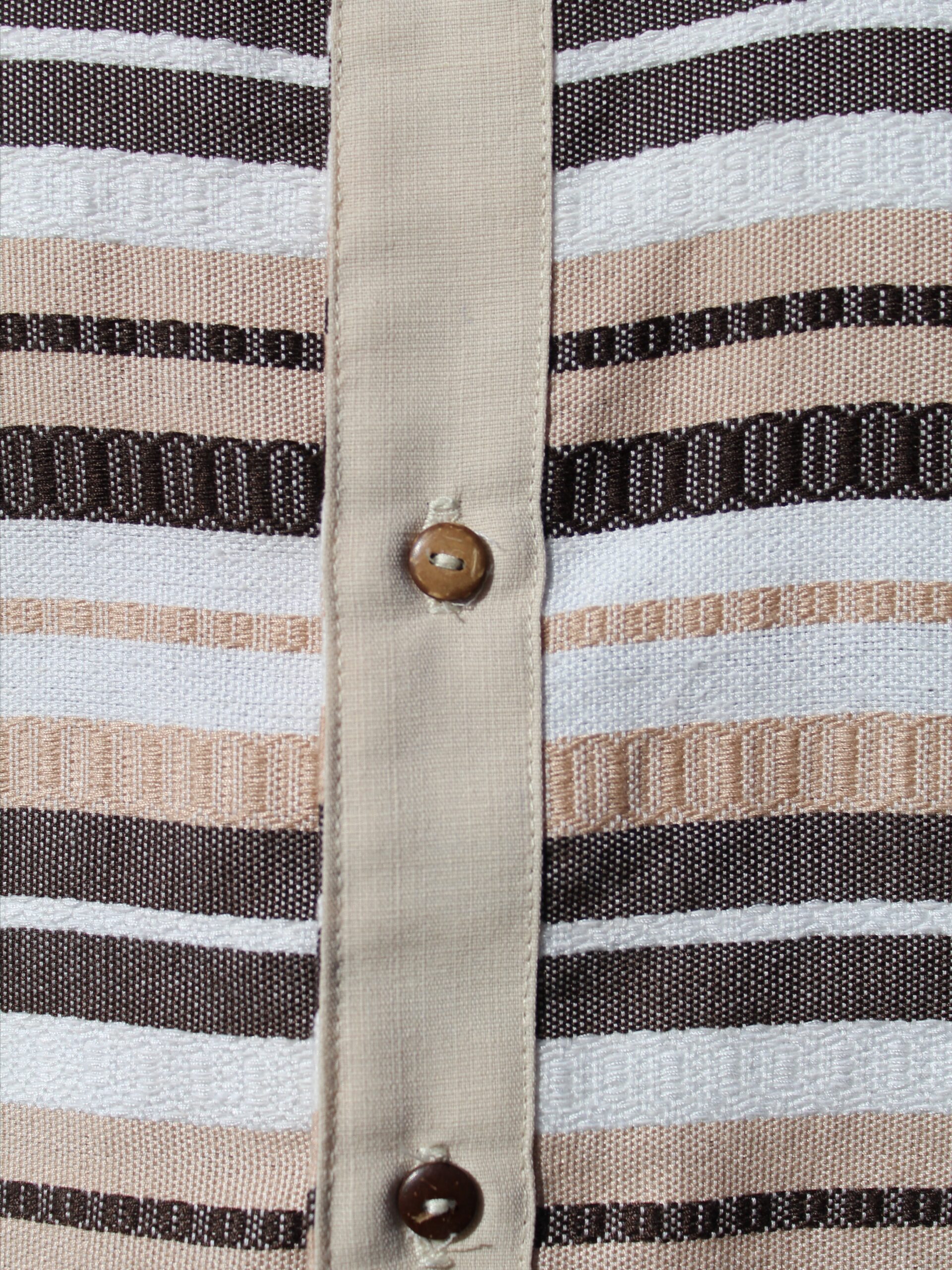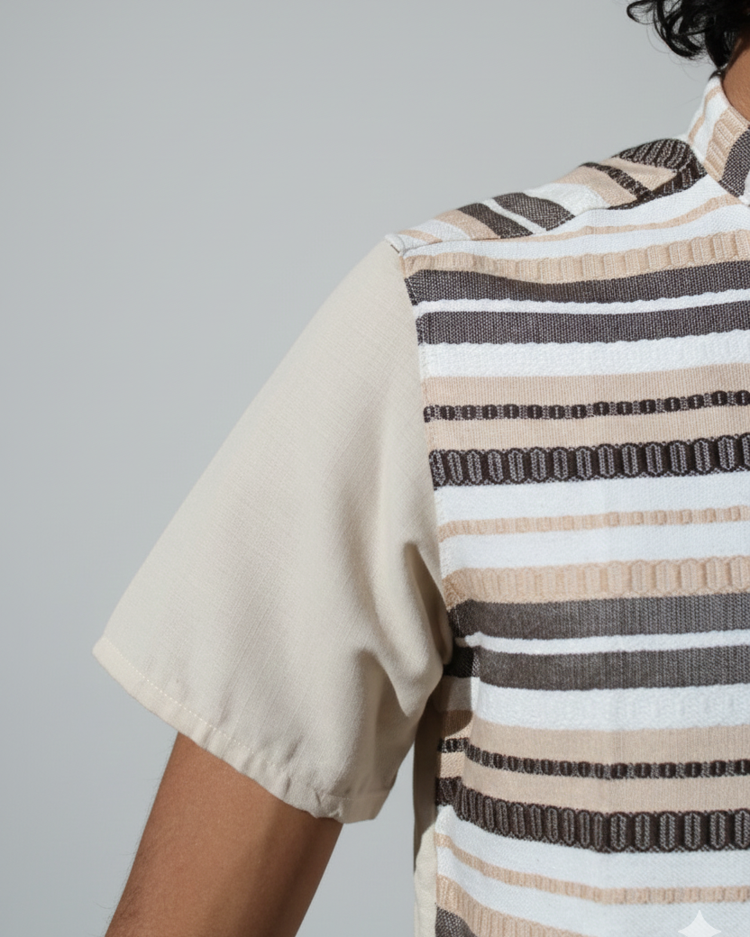 Eleva tu outfit con esta bonita camisa elaborado de lino algodón color Kaki, con manga corta y diseño de líneas hecho artesanalmente en telar de pedal en diferentes tonos que crean la combinación perfecta y un cuello tipo mao que brinda elegancia. Su confección artesanal te garantiza calidad, frescura y un look que no pasa desapercibido.