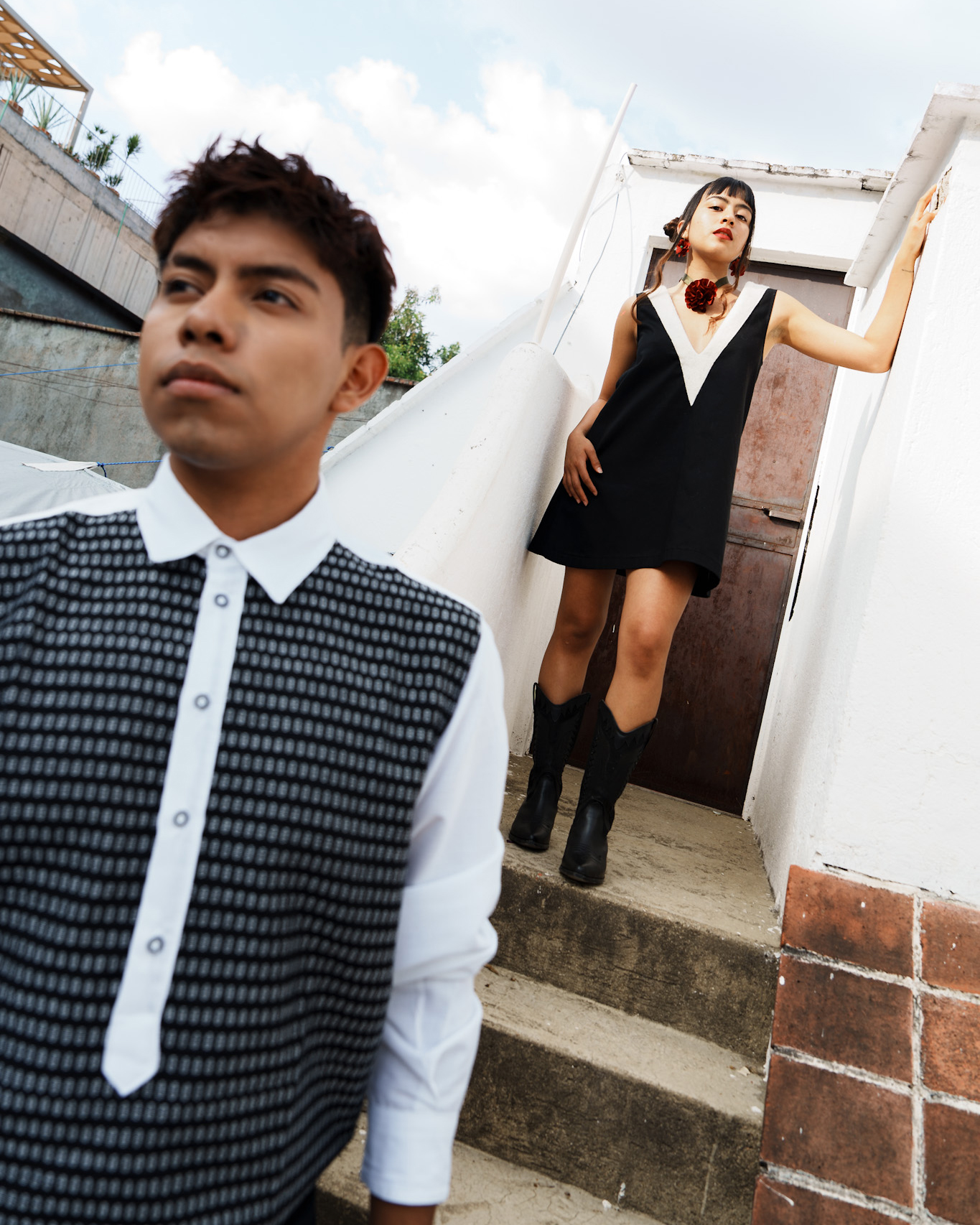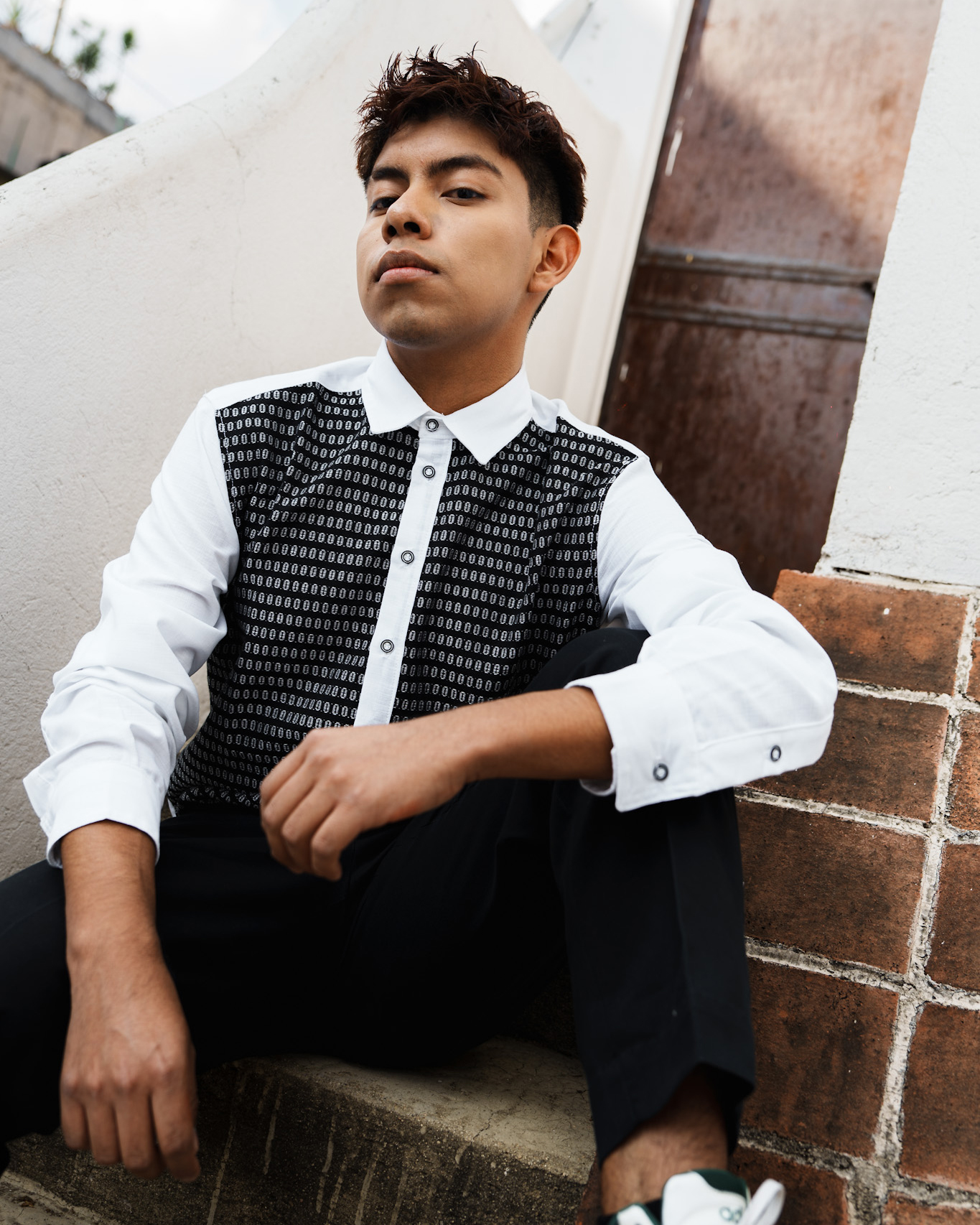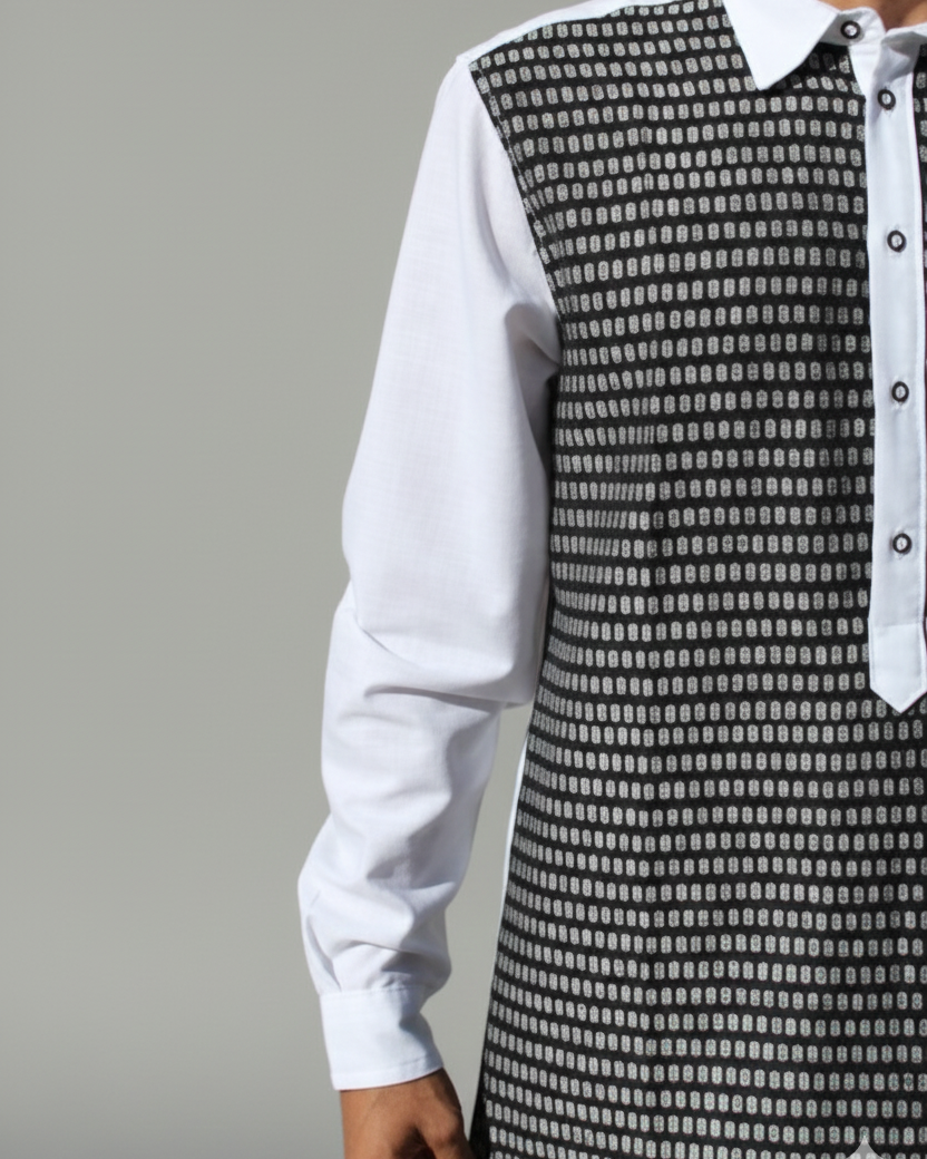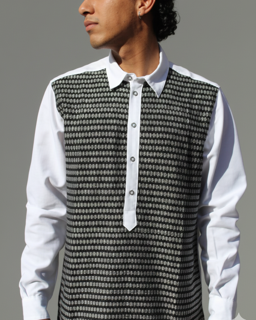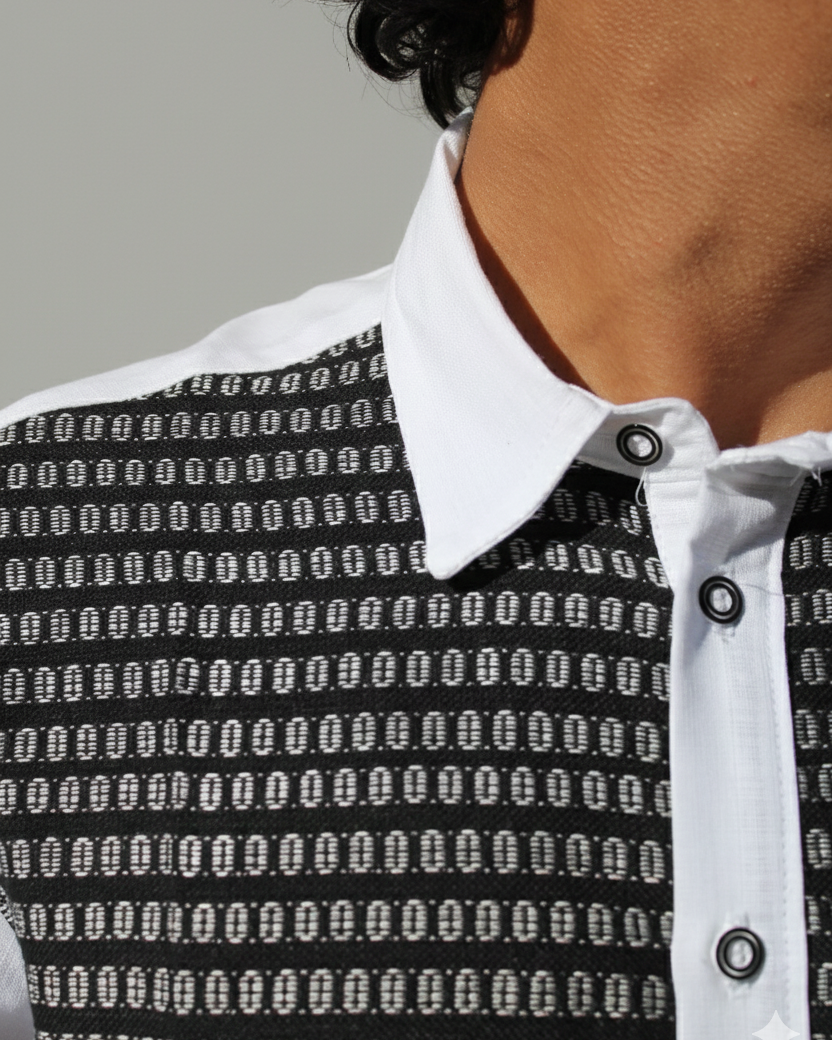 Luce está camisa color blanca de manga larga elaborado con lino algodón, cuello tipo mao y con un bonito diseño de patrones hecho artesanalmente en telar de pedal en en color negro.