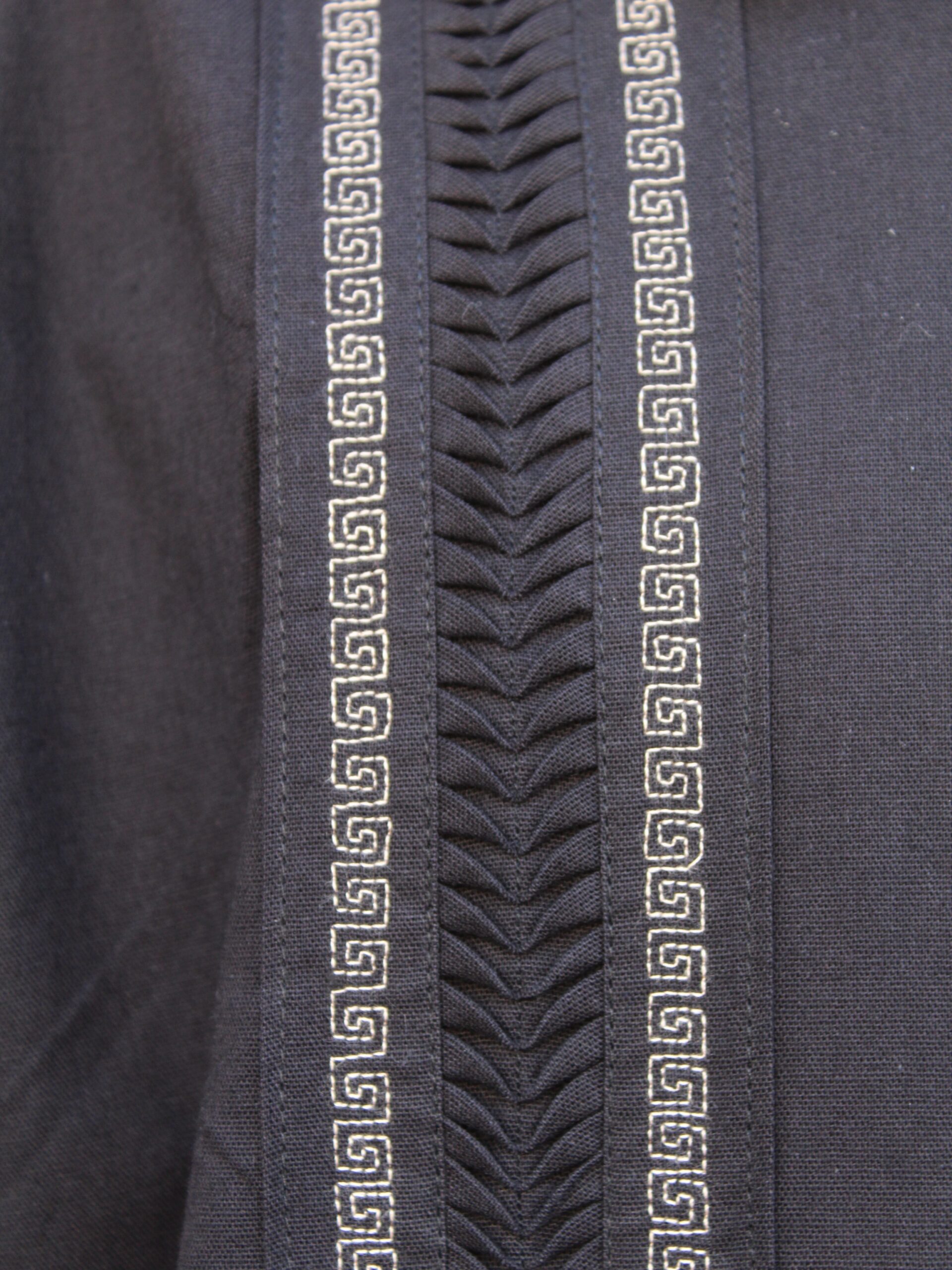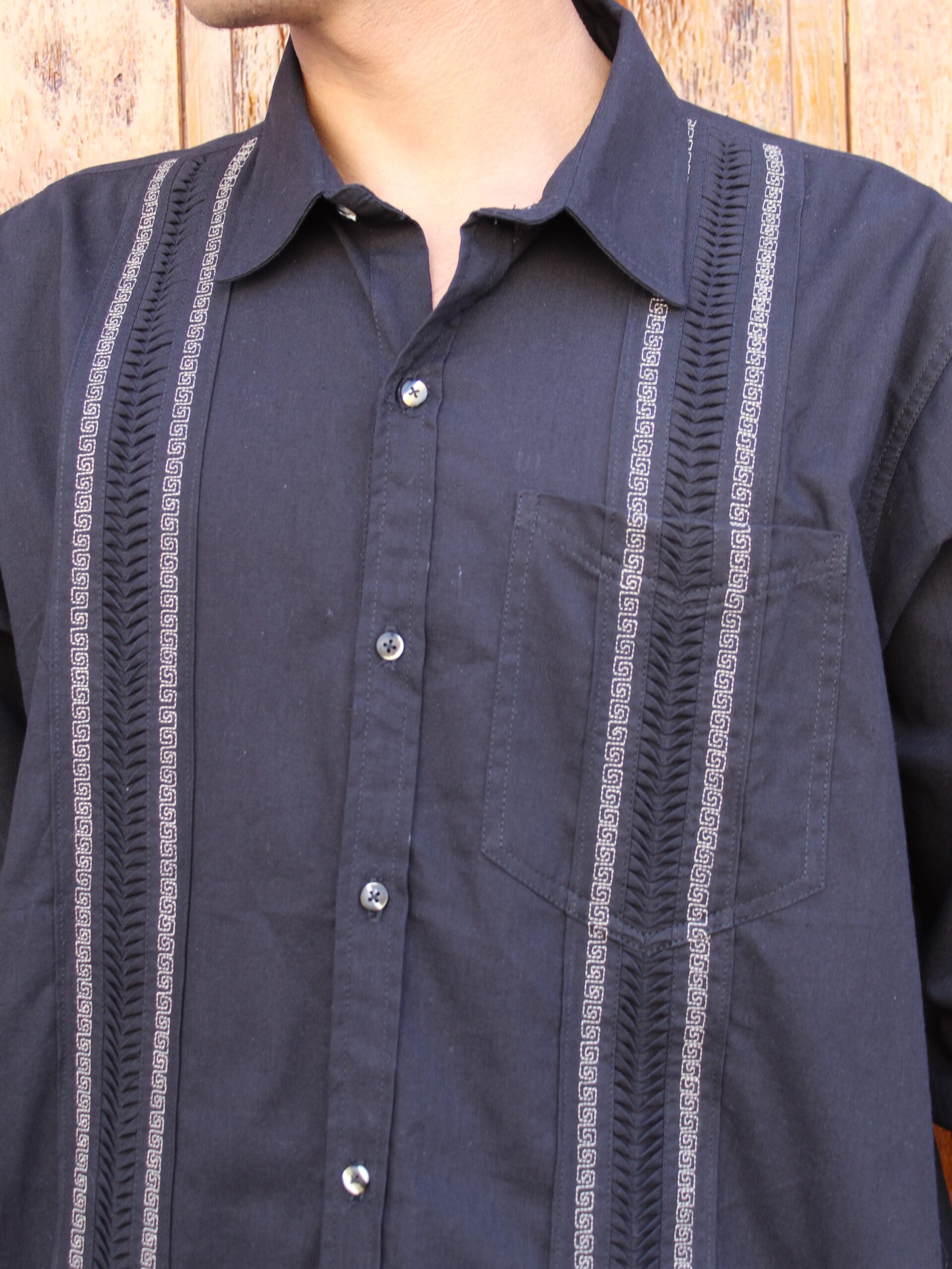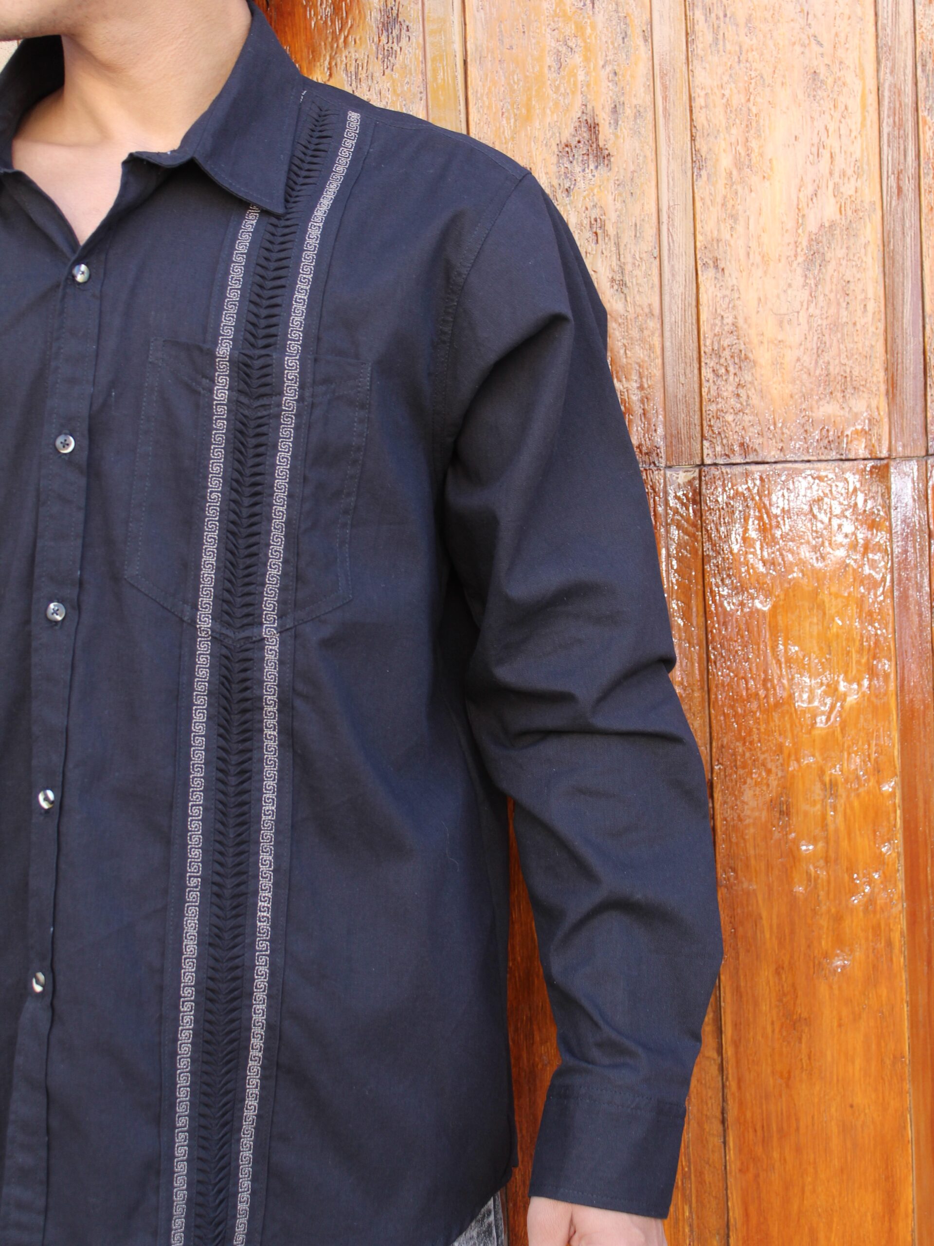 Atrévete a lucir está increíble camisa de manga larga hecha de manta en color negra con un diseño que destaca por sus alforzas frontales meticulosamente trabajadas, realzadas con un bordado en hilo blanco que crea un contraste vibrante y sofisticado. Esta pieza es única y perfecta para cualquier ocasión