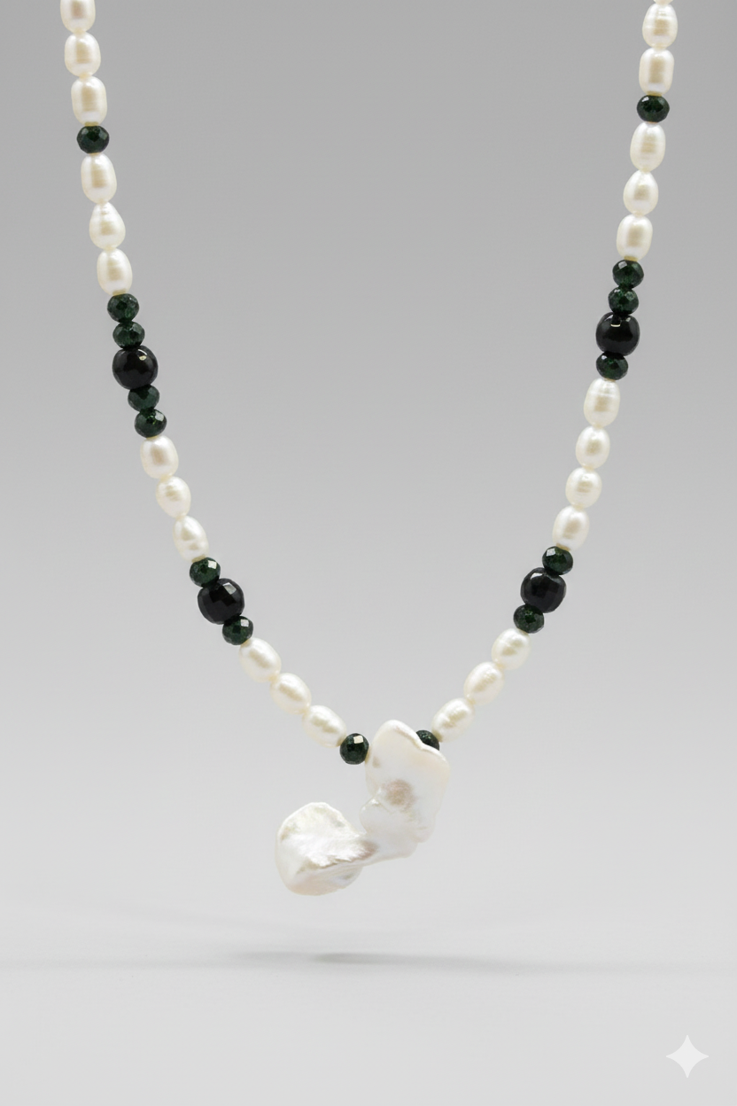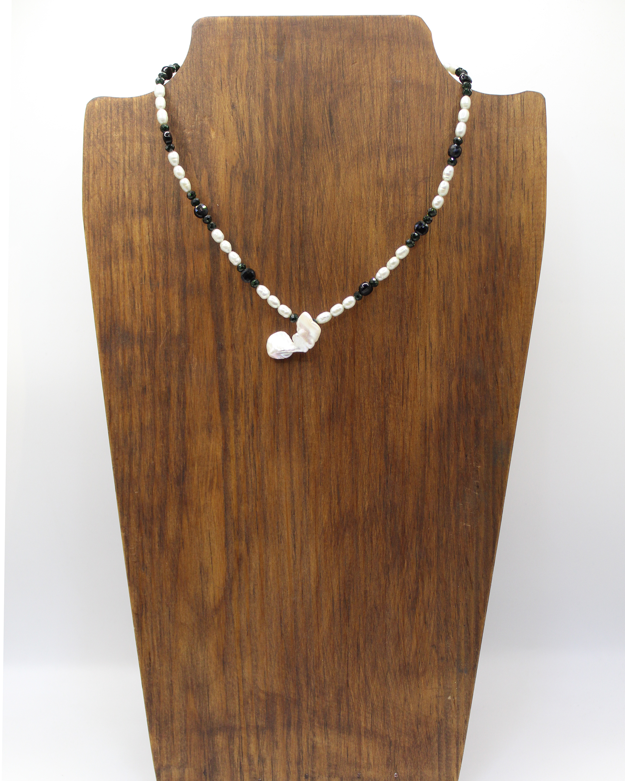 Dale el toque perfecto a tu look con este collar hecho con perlas cultivadas, obsidiana y con una perla amorfa en el centro.