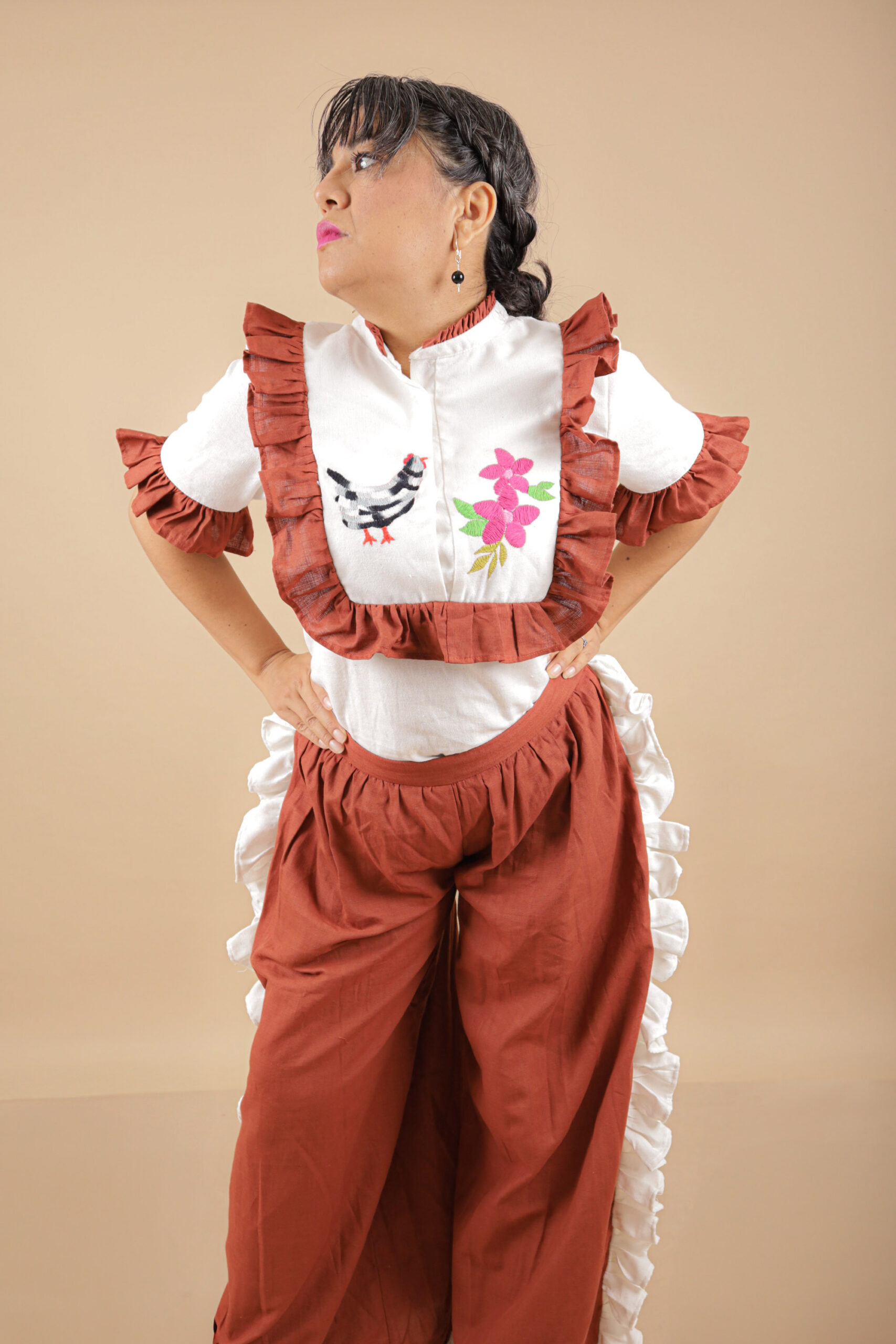 Conjunto compuesto por una blusa hecha de lino con olanes en color chedron, bordado en la pechera central de una gallina y flores, cuello mao y mangas con olanes y un pantalón recto plisado hecho de lino color chedron y olanes blancos que complementan el contorno y la parte baja del mismo.