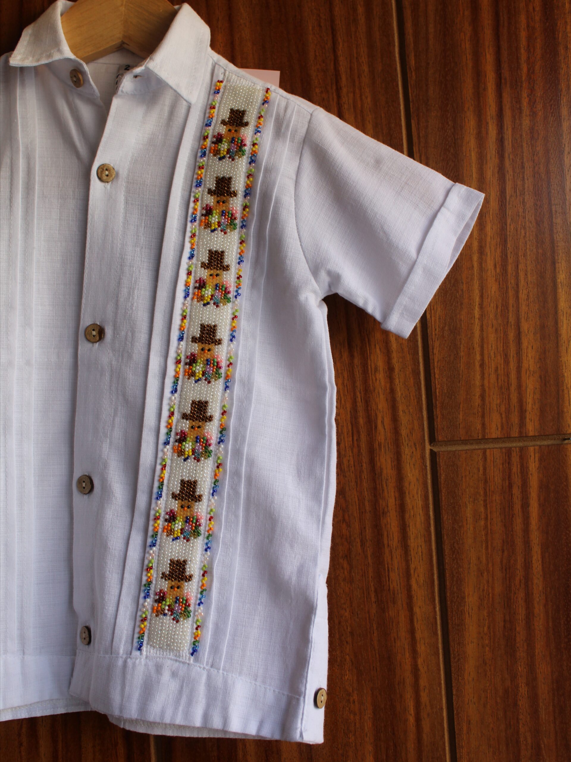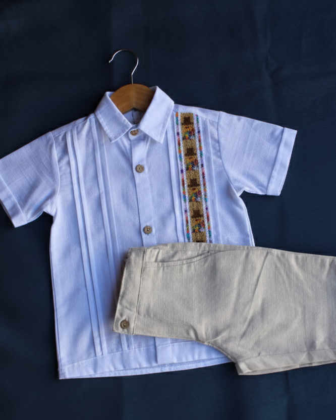 Viste con tradición a tu peque con este conjunto compuesto por una bonita camisa tipo guayabera de lino/algodón en color blanco con manga corta lo que la hace única es es su espectacular y meticuloso bordado de chaquira hecho a mano, que da vida a una fila de tiliches y lo complementa un short color arena ideal para que los más pequeños también vistan a la moda.