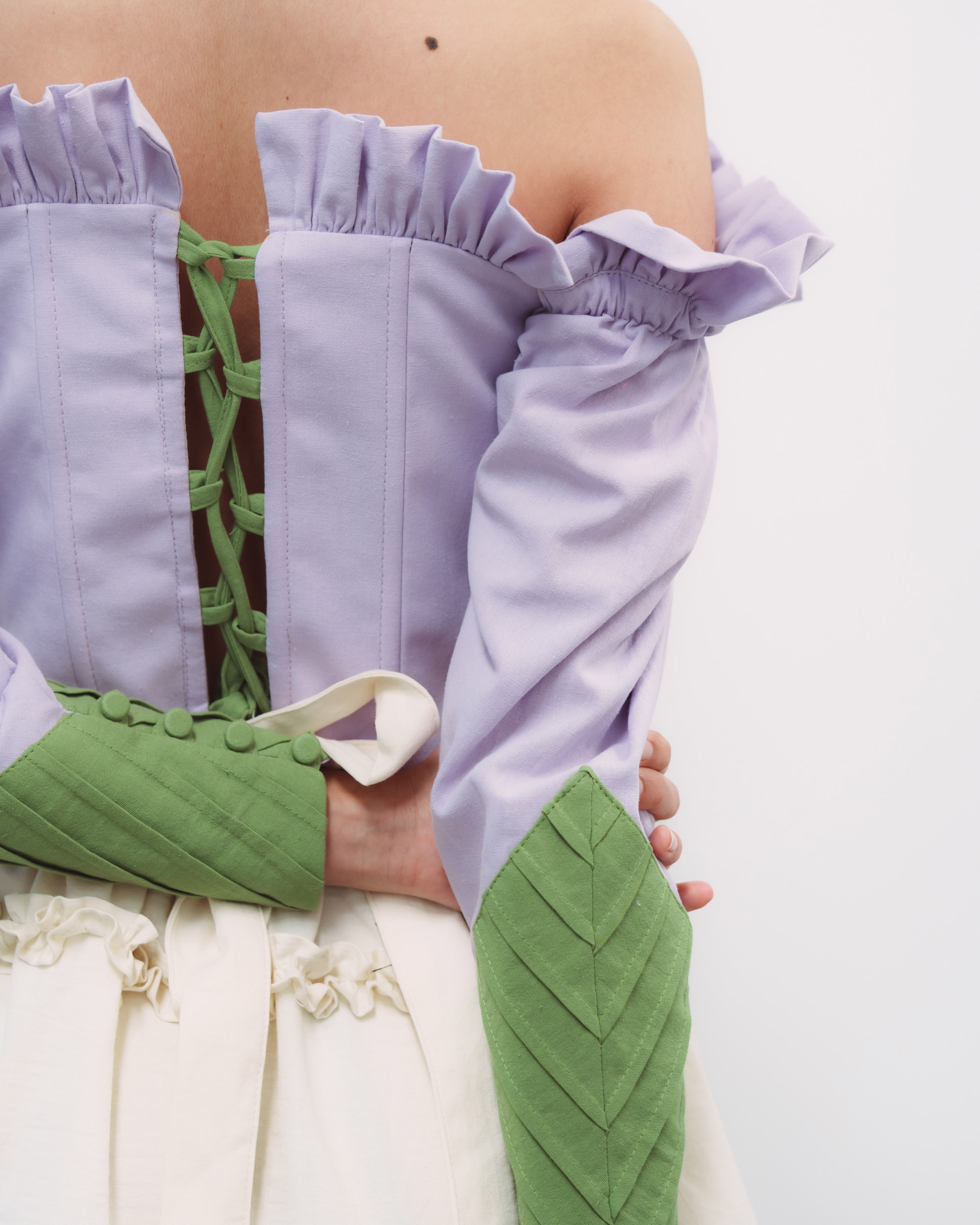 Corset hecho de manta de algodón color lila, con olanes en el busto, y nuestras alforzas distintivas en las mangas en color verde que simulan una hoja. Inspirado en la flor boca de dragón (o perro).