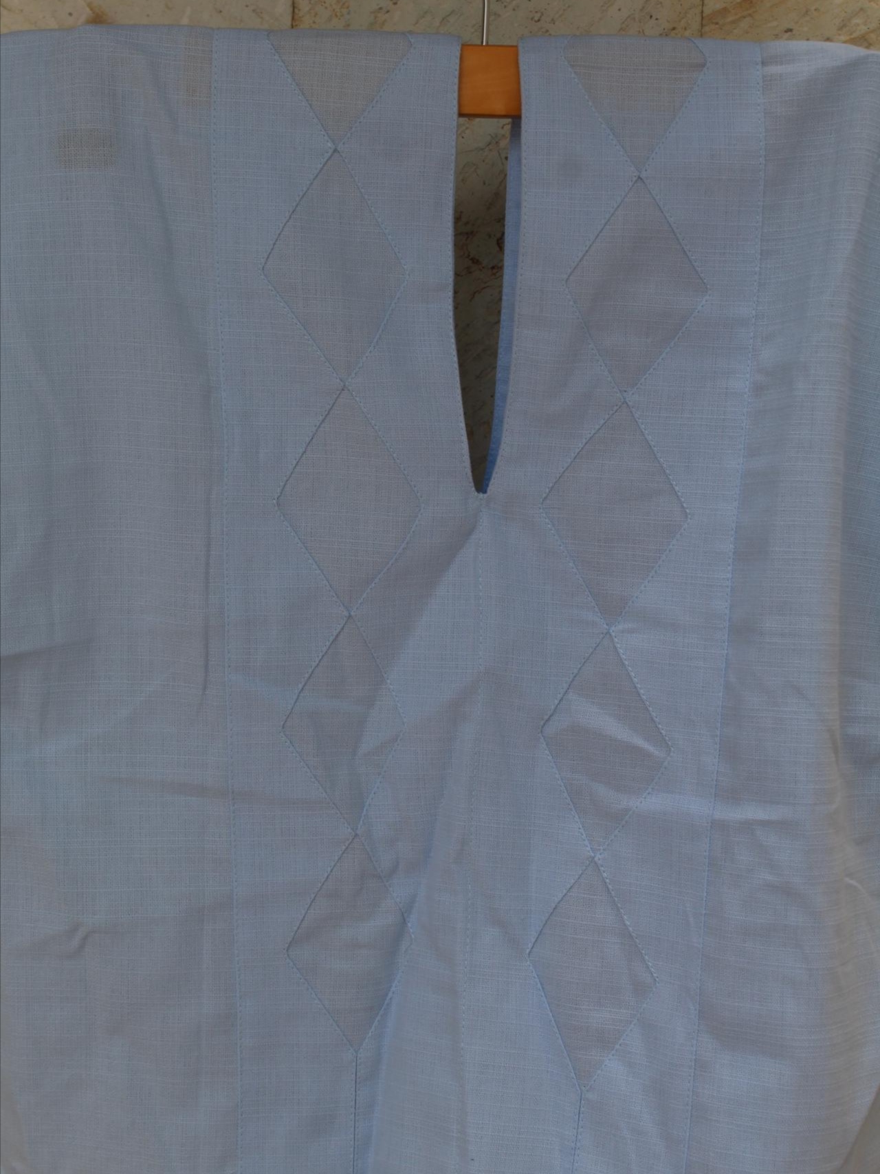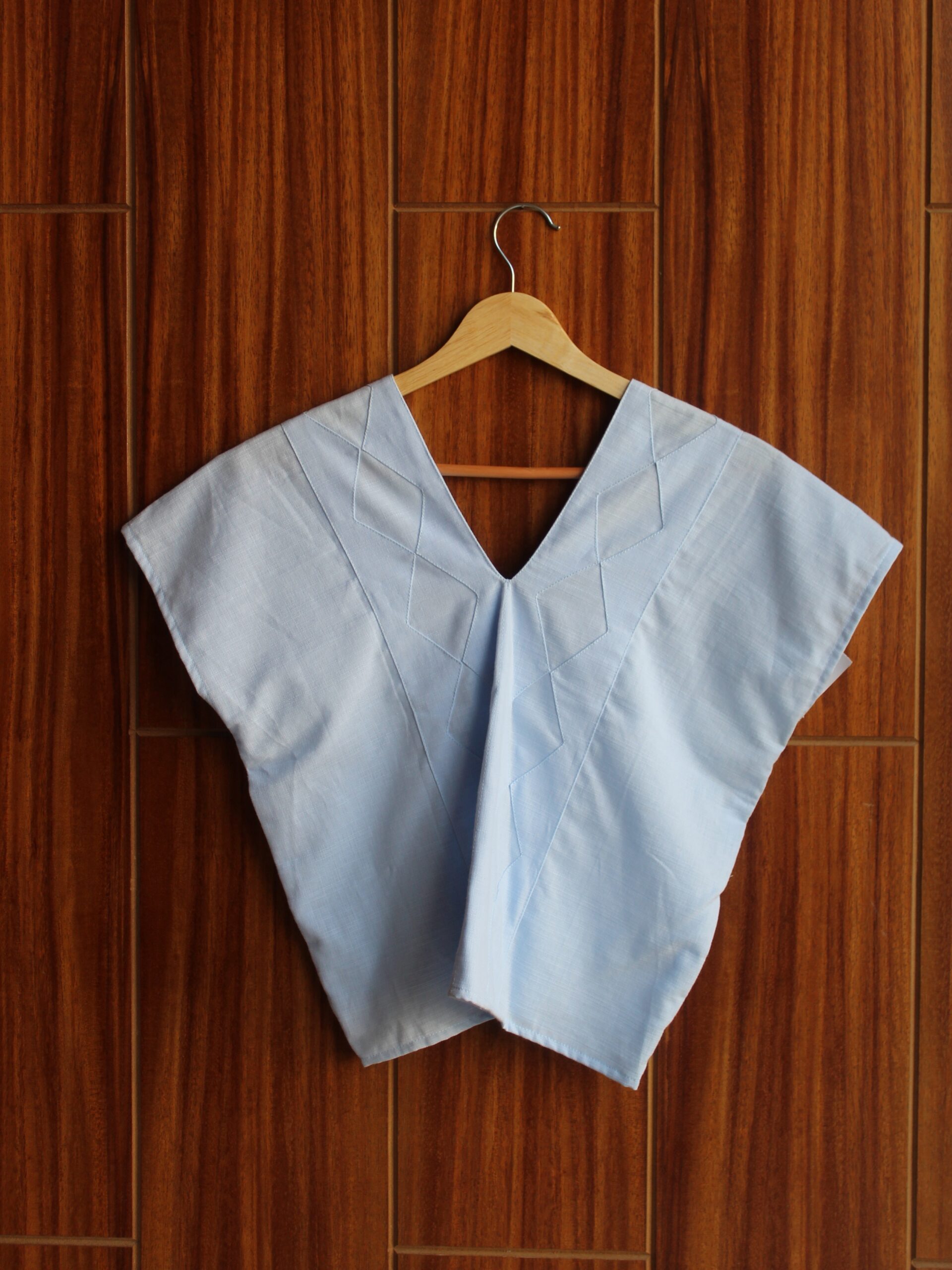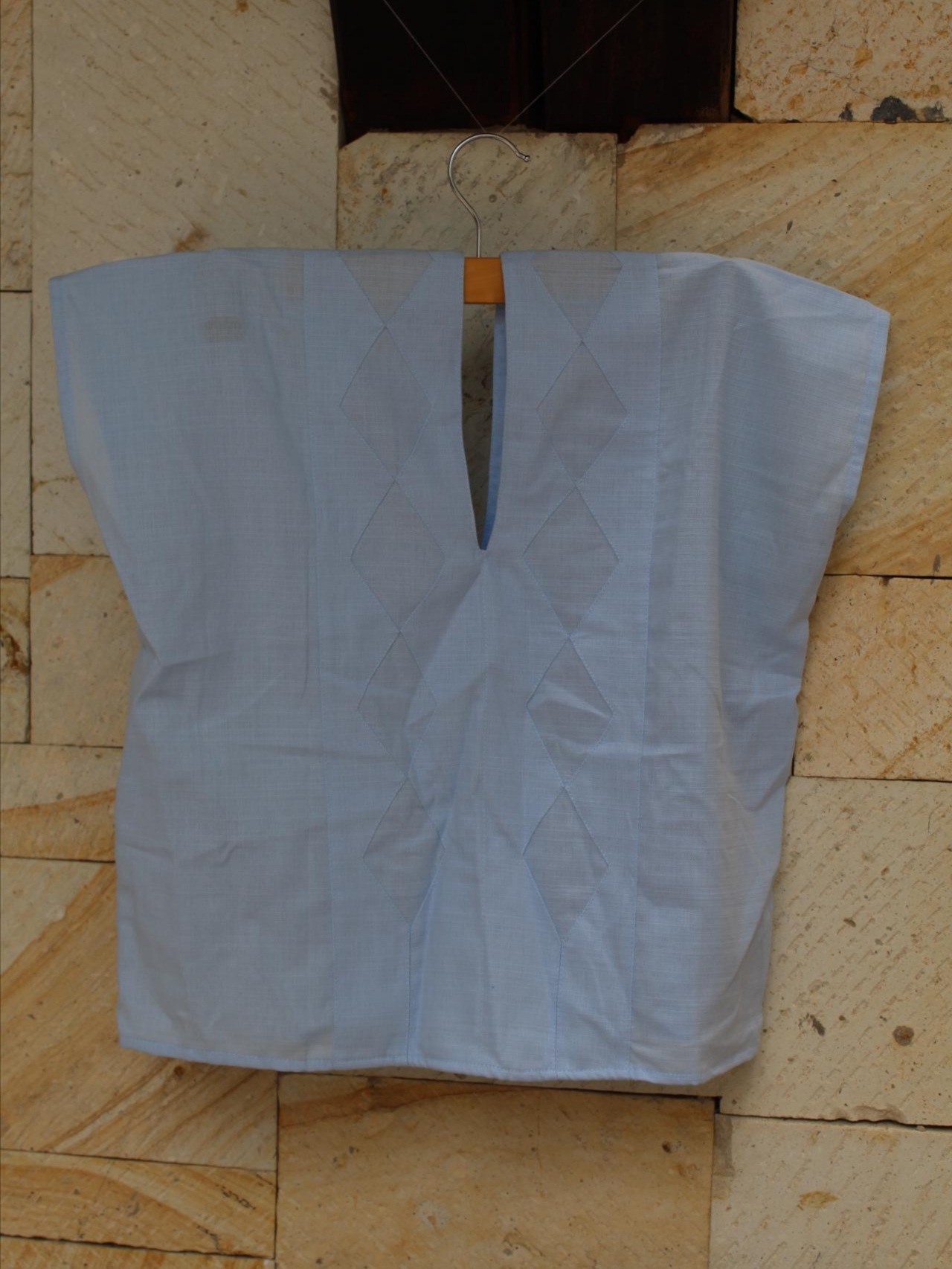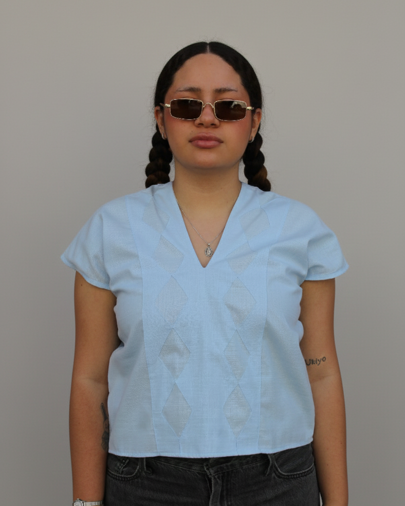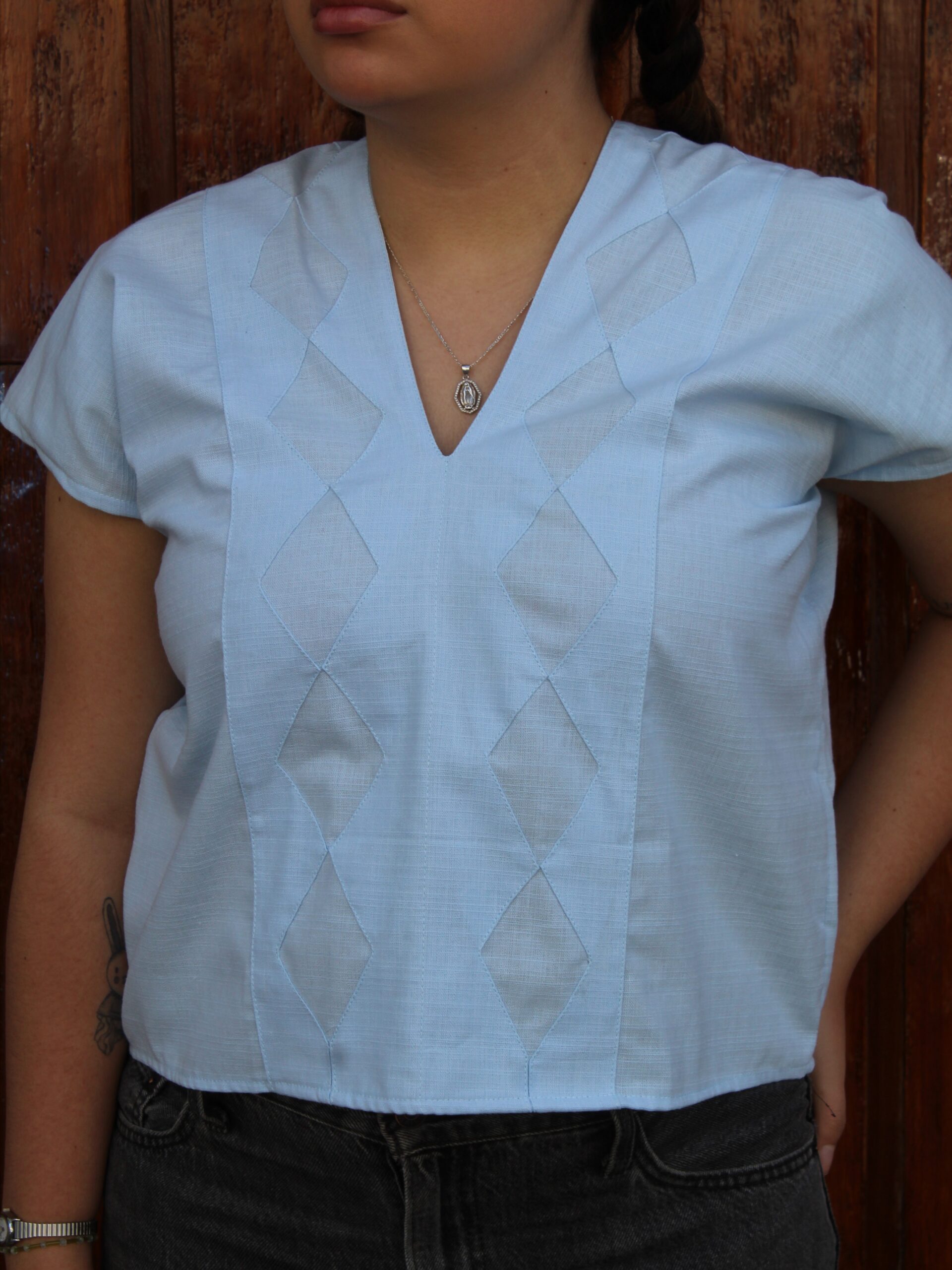Hermoso Crop-Top sin mangas hecho de lino con diseño de rombos en color azul pastel adquiérelo y portalo como más te guste.