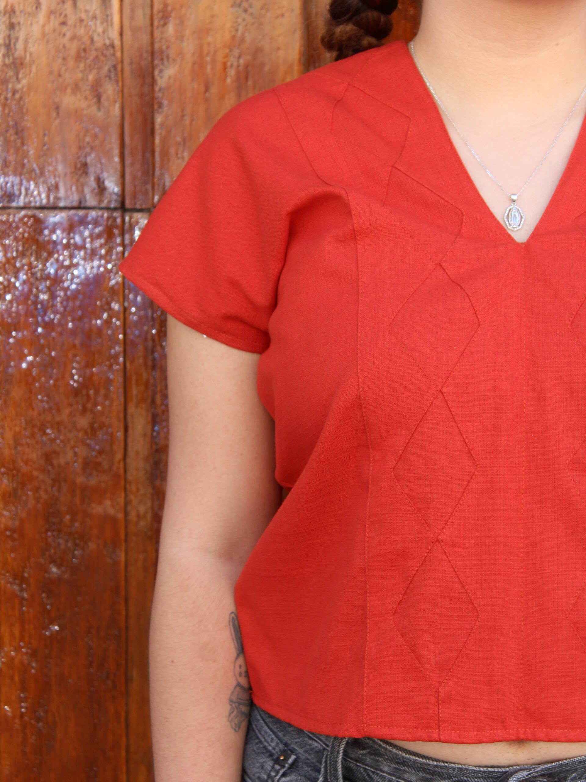 Este crop top combina la frescura del lino con un diseño de rombos que aporta un toque moderno y elegante. Su textura ligera y transpirable lo hace perfecto para días cálidos, mientras que el patrón geométrico añade personalidad y estilo sin esfuerzo. Con un corte favorecedor y versátil, es la prenda ideal para elevar cualquier look, desde un outfit casual hasta uno más sofisticado.