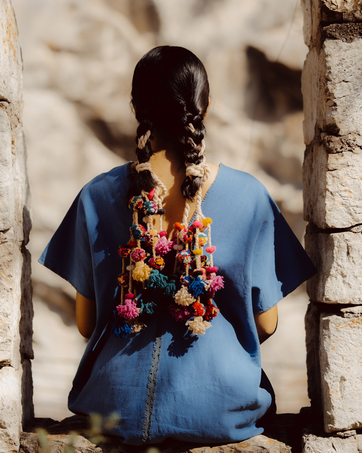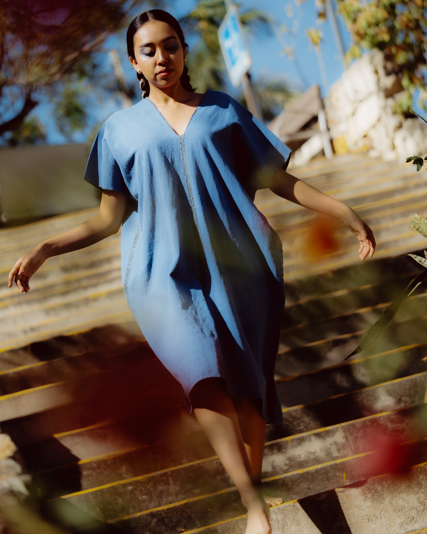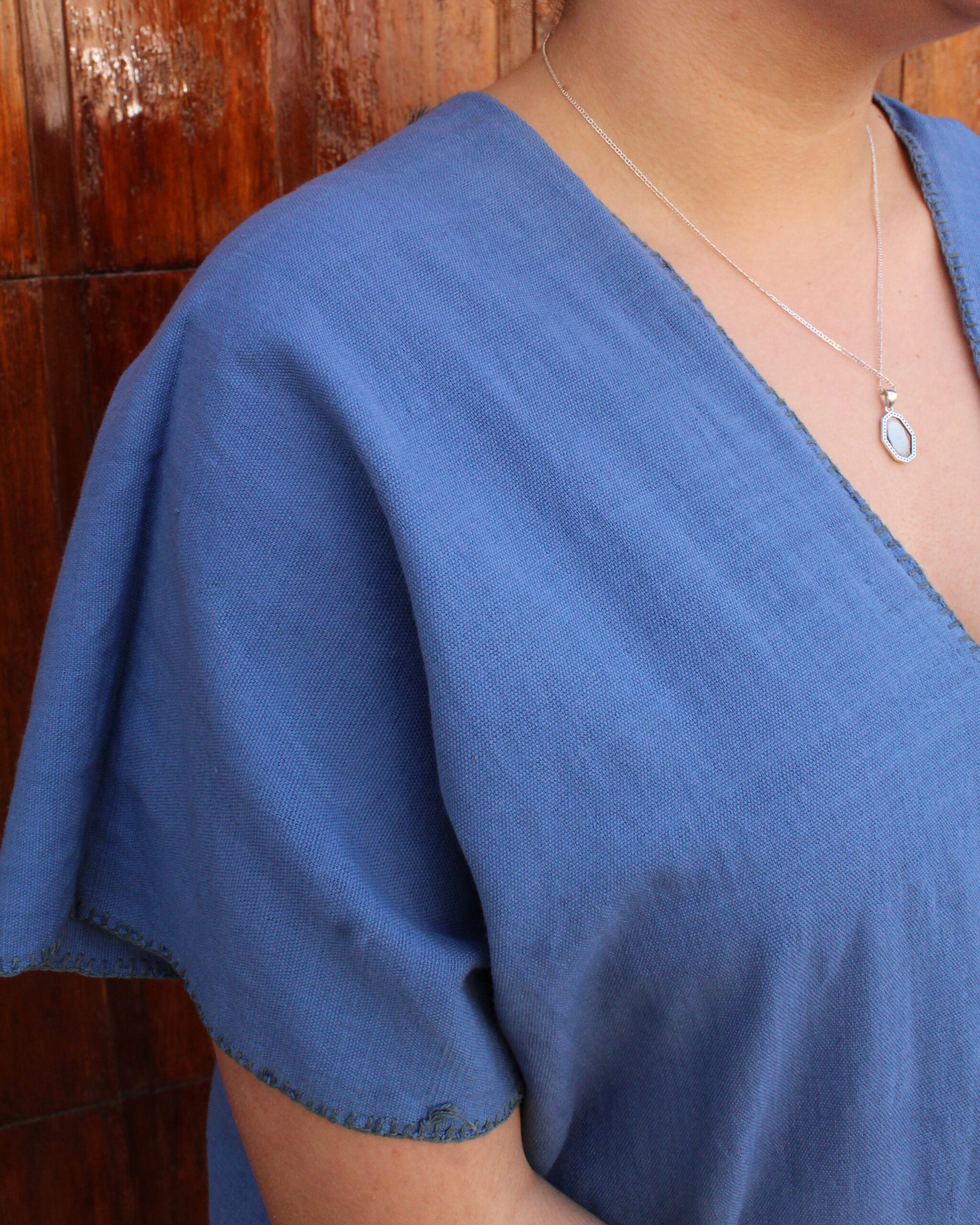 Ensable artesanal en tono azul, elaborado en dos lienzos y trabajado con tinte natural y anilina, logrando colores profundos y llenos de carácter. Una prenda única.