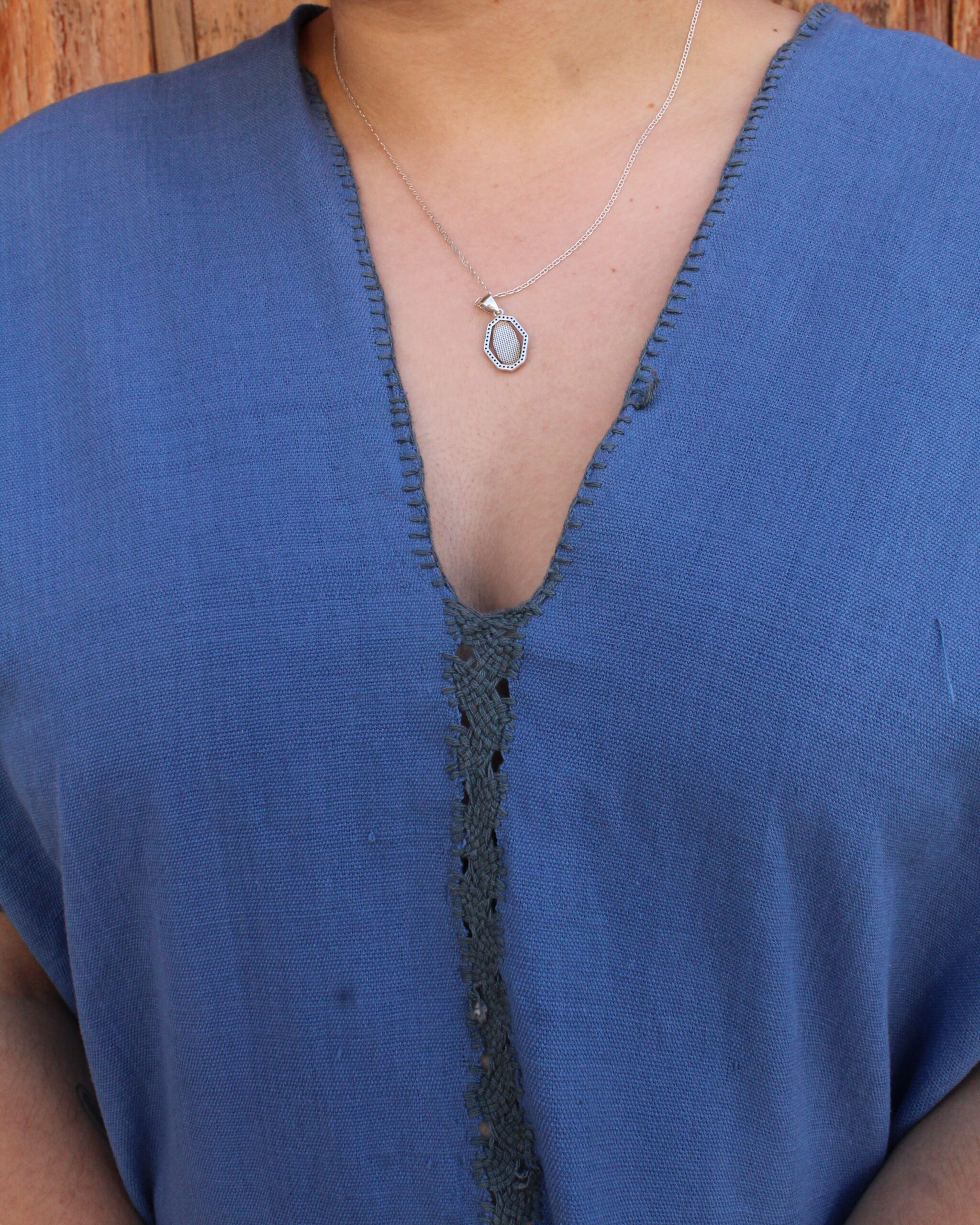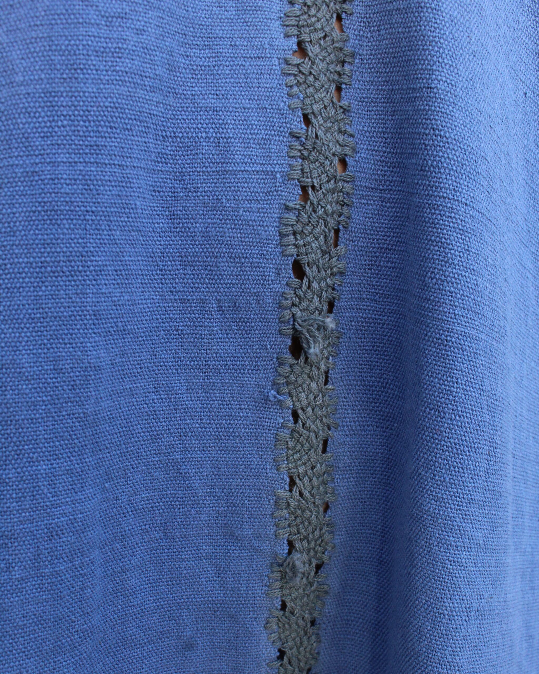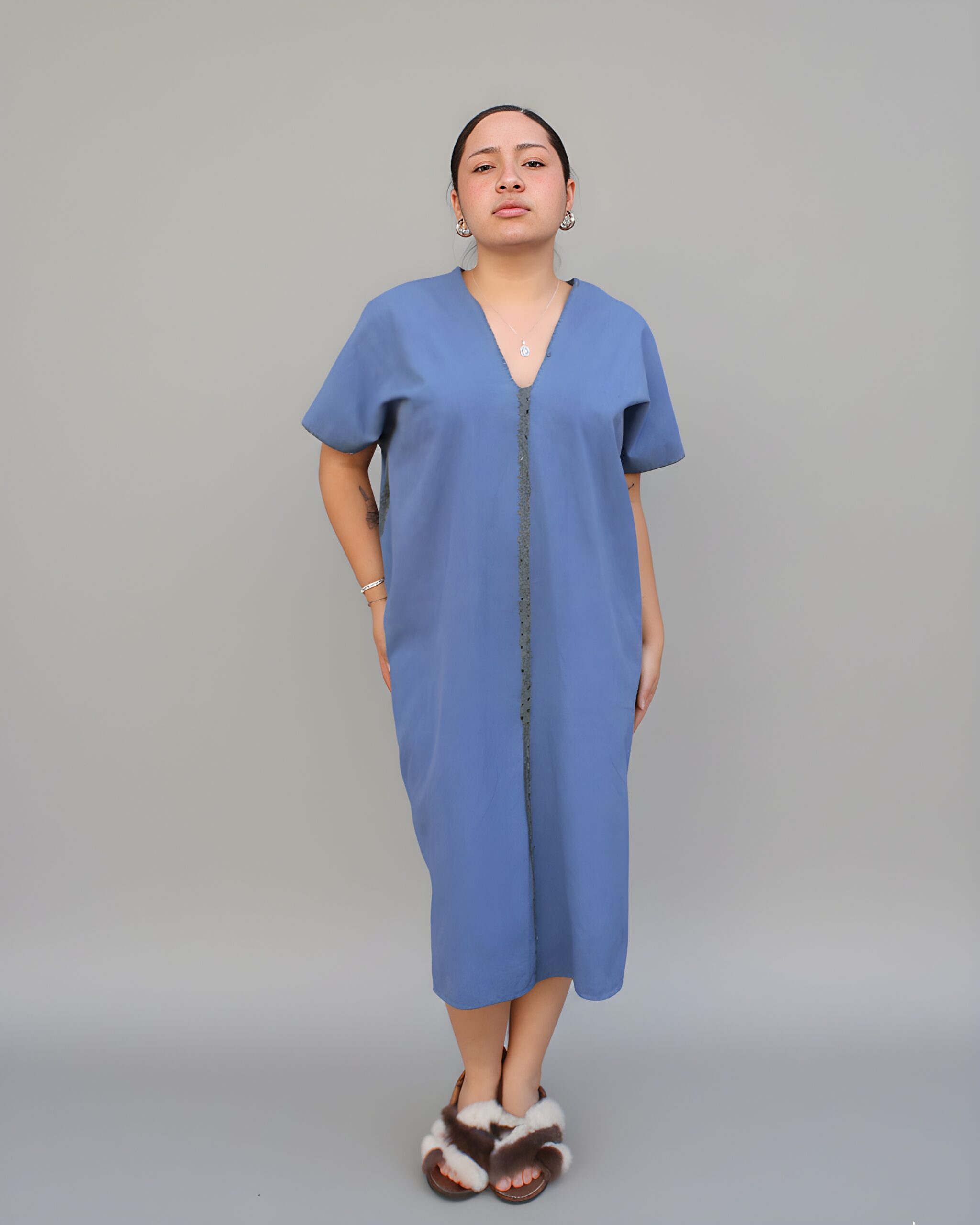 Ensable artesanal en tono azul, elaborado en dos lienzos y trabajado con tinte natural y anilina, logrando colores profundos y llenos de carácter. Una prenda única.