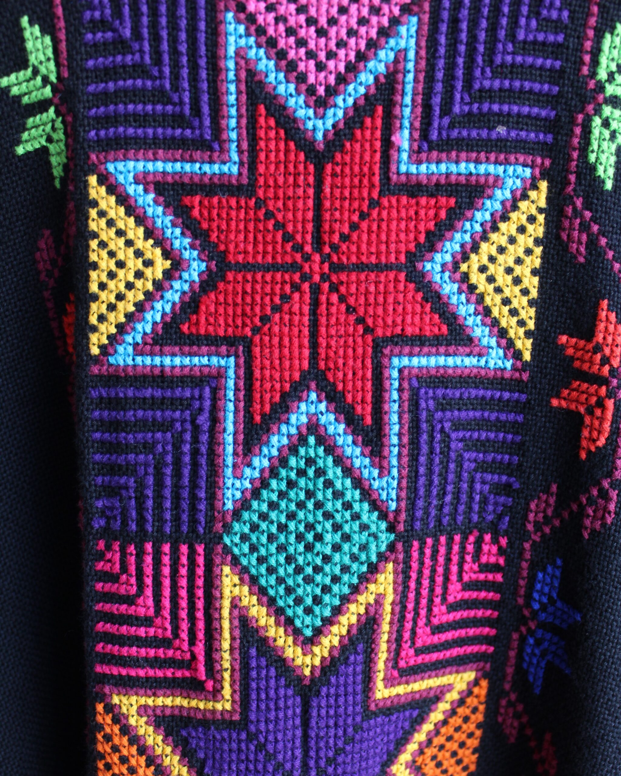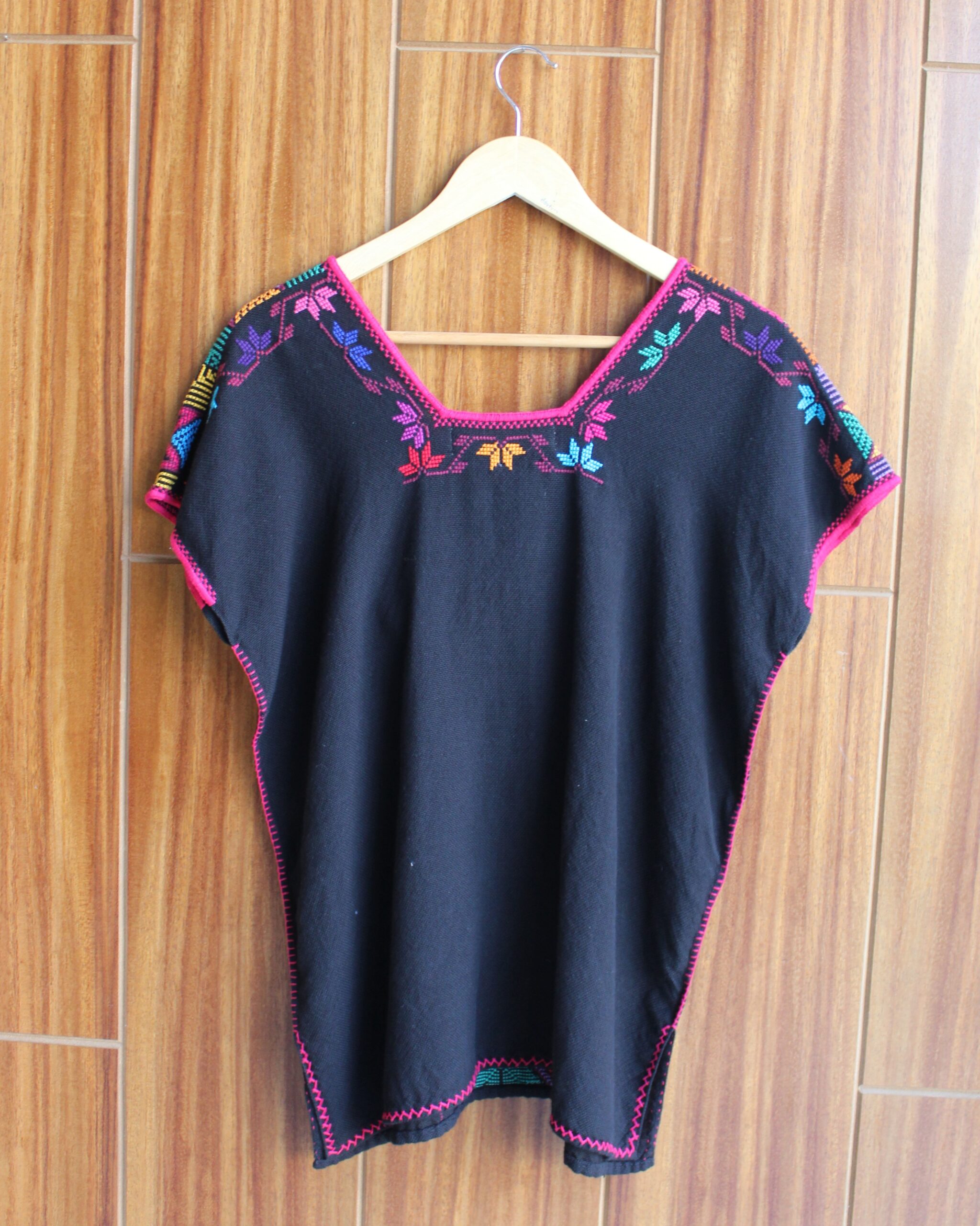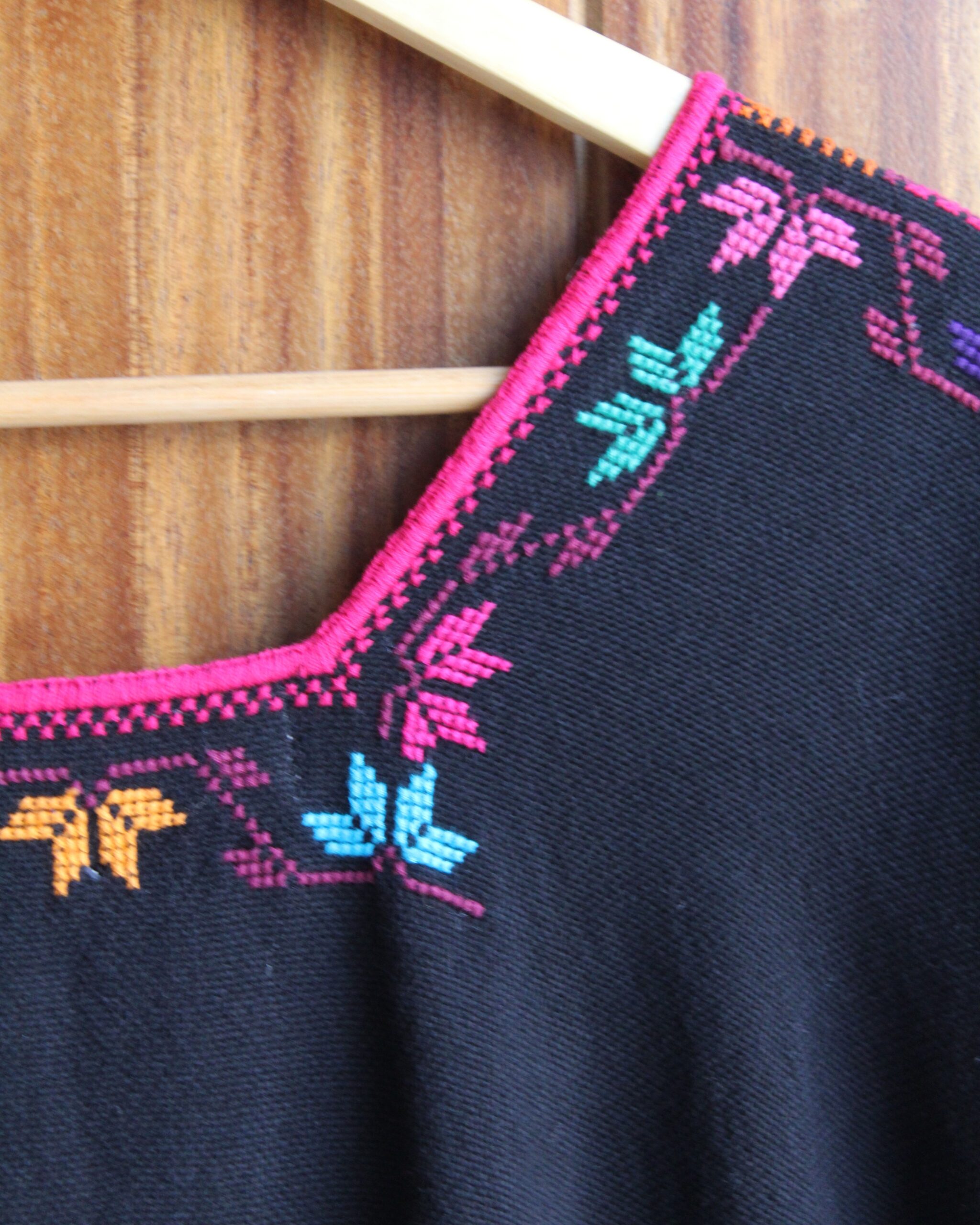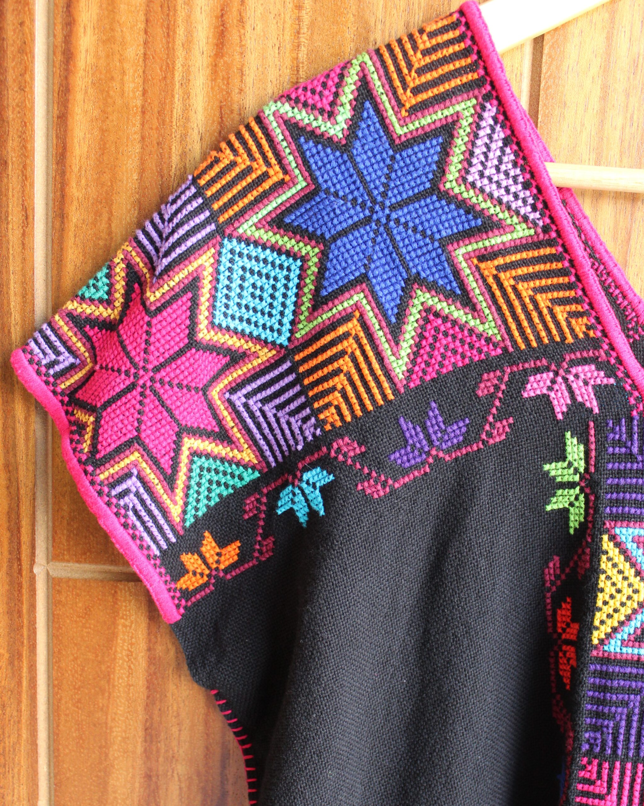 Imponente huanengo hecha en telar de pedal en color negro con bordado de punto de cruz en multicolores.