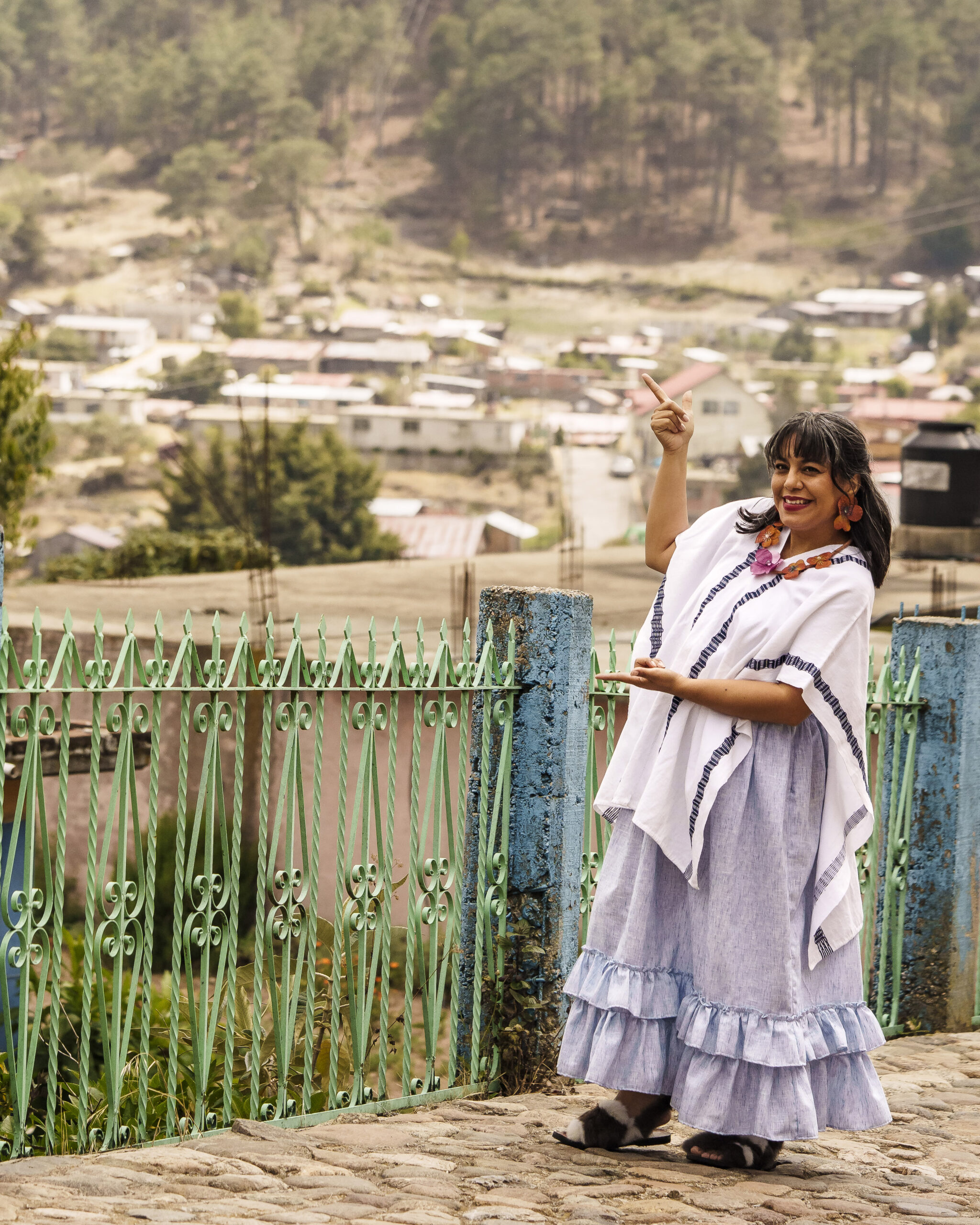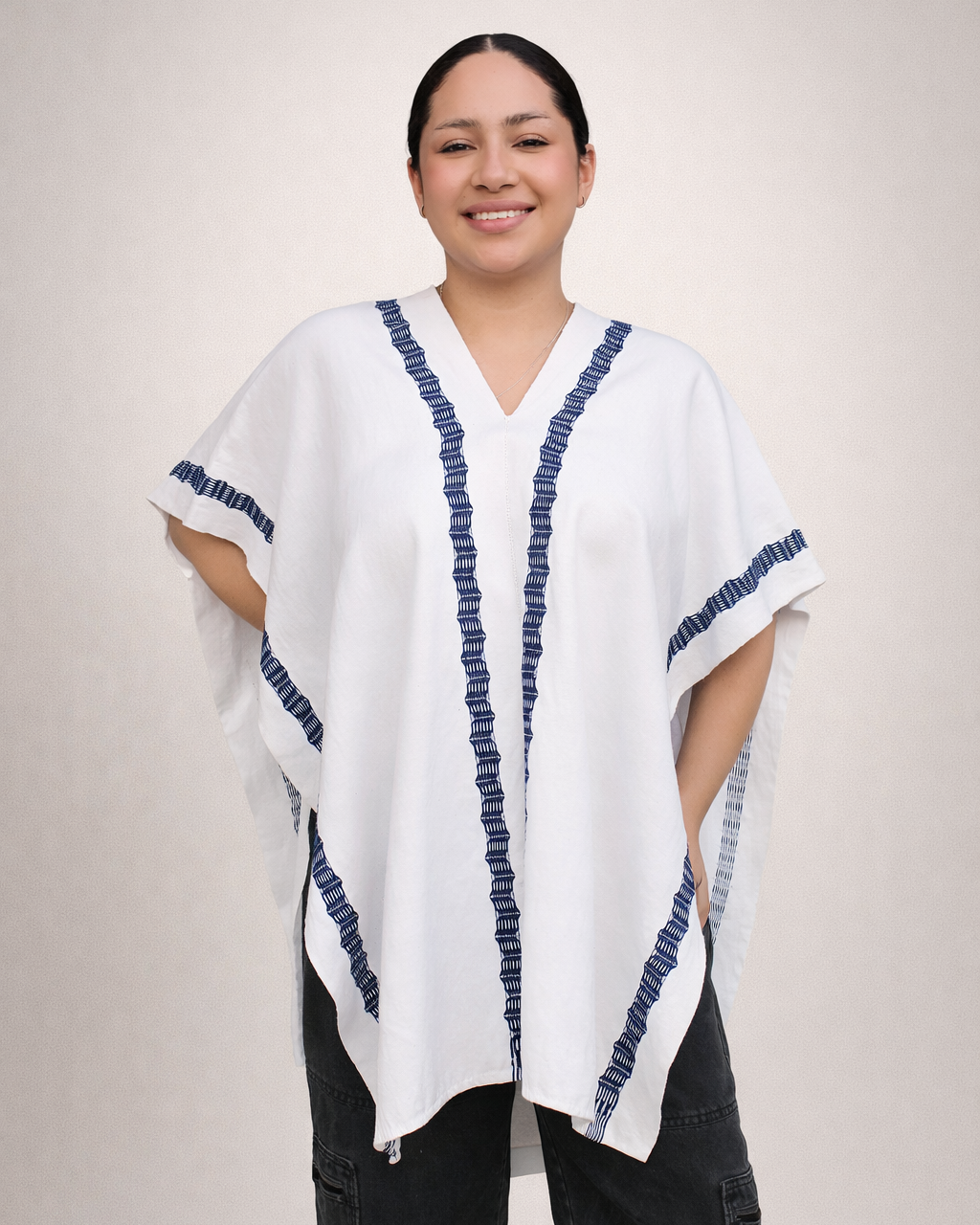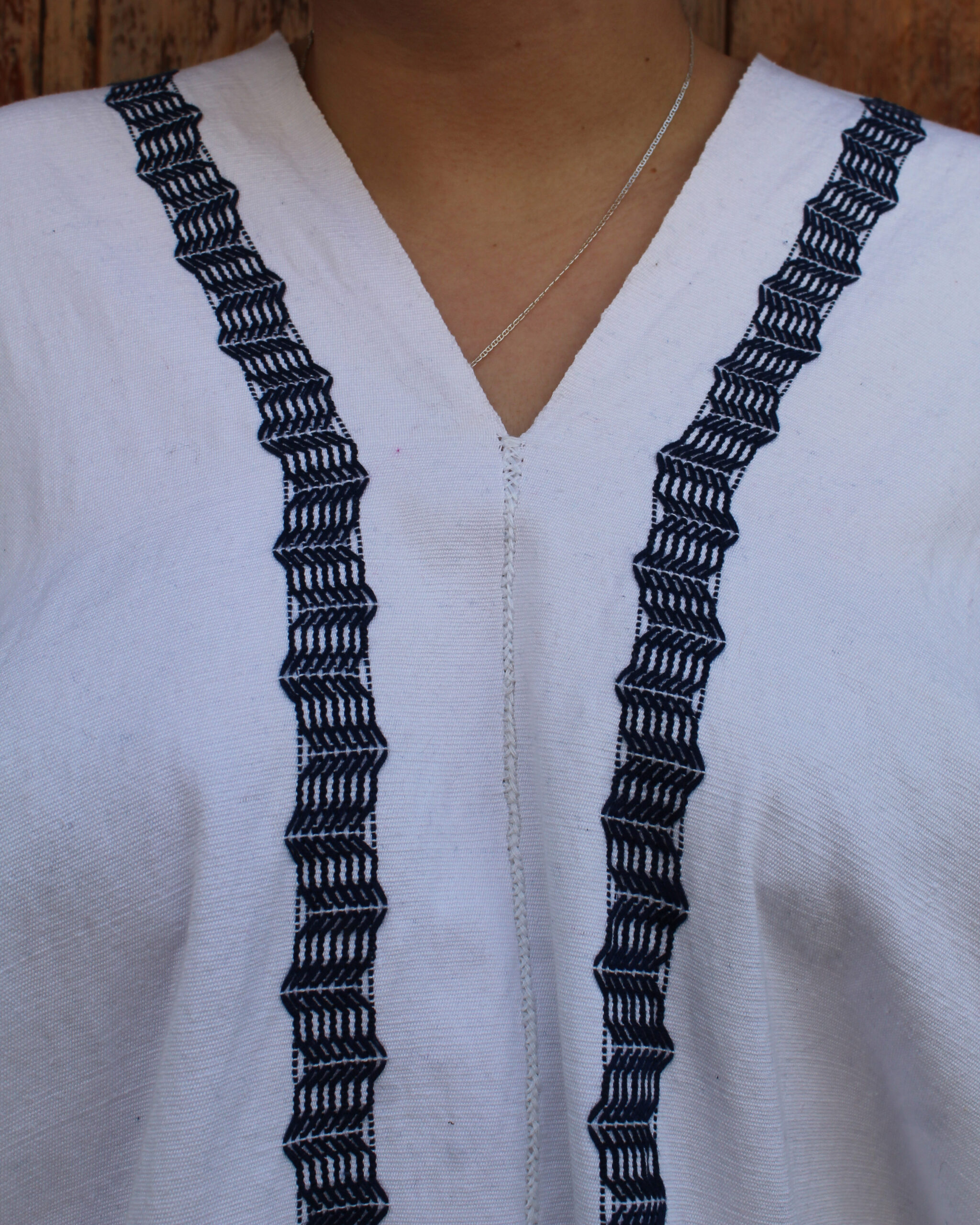 Luce este hermoso y tradicional huipil de dos lienzos, abierto, con bordado zigzag azul con un estilo actual y versátil.