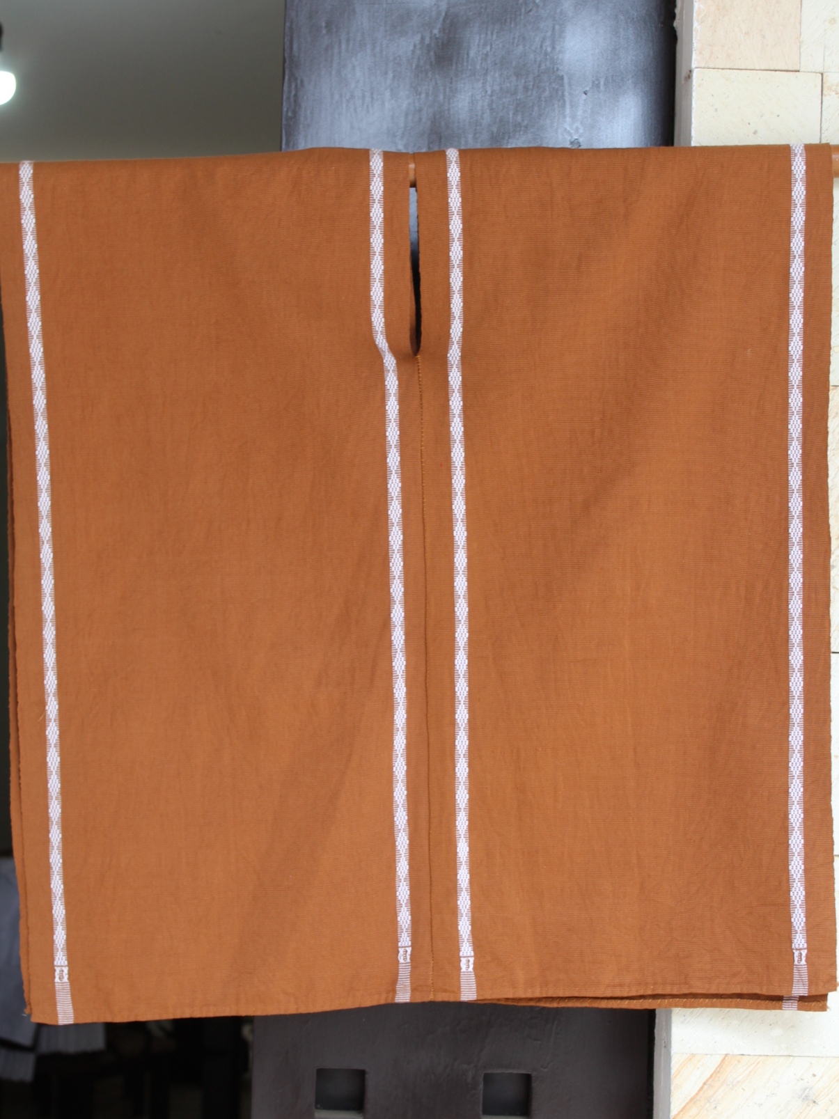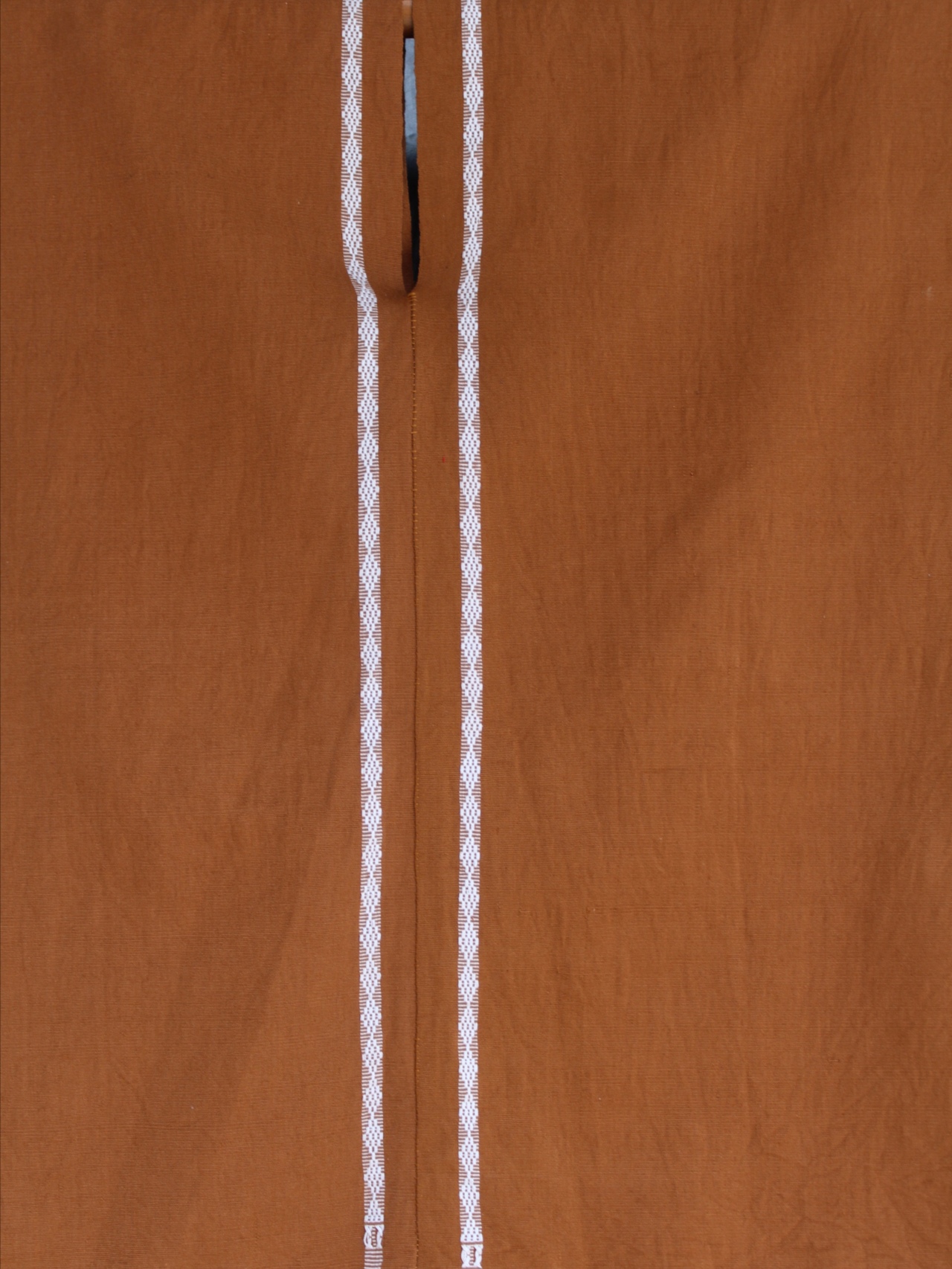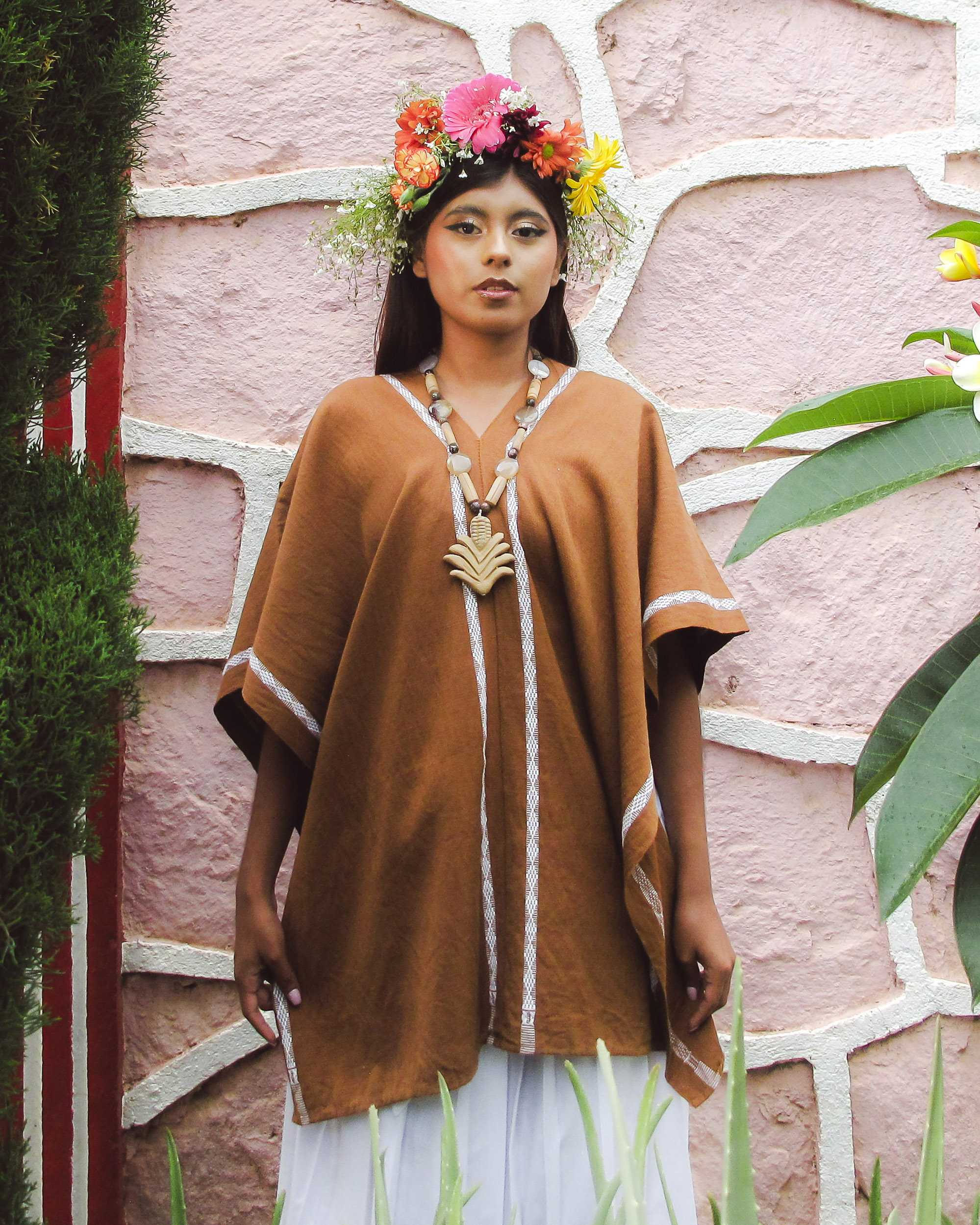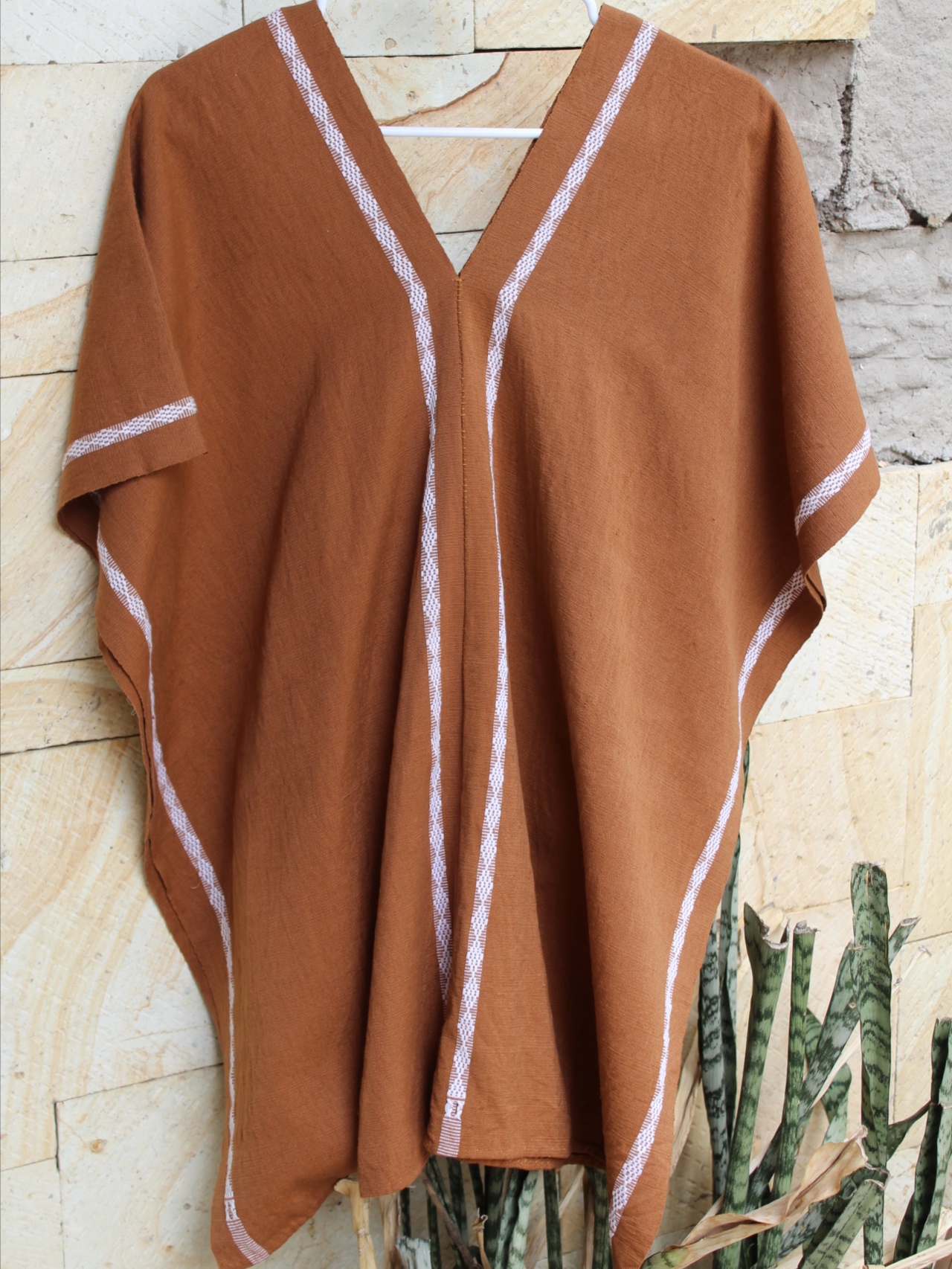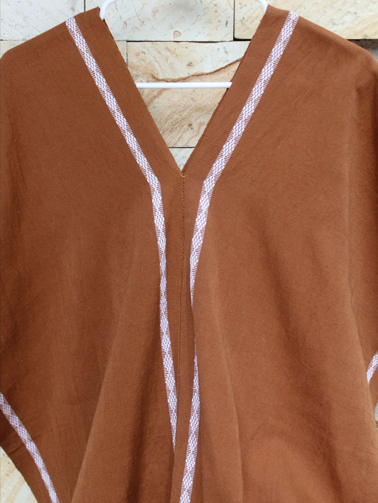 Huipil abierto de dos lienzos en tono café, con detalles blancos que aportan contraste y un estilo auténtico y actual.