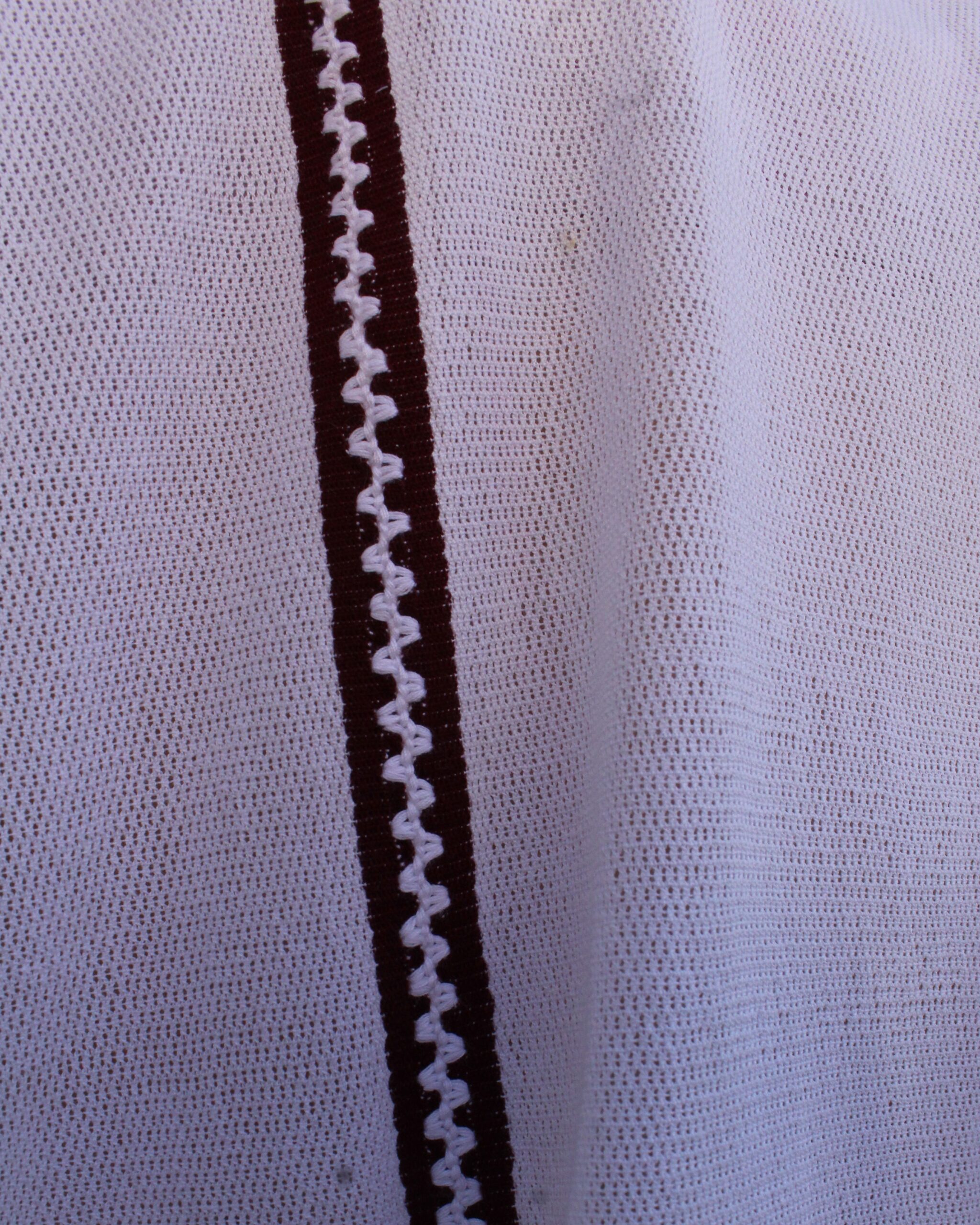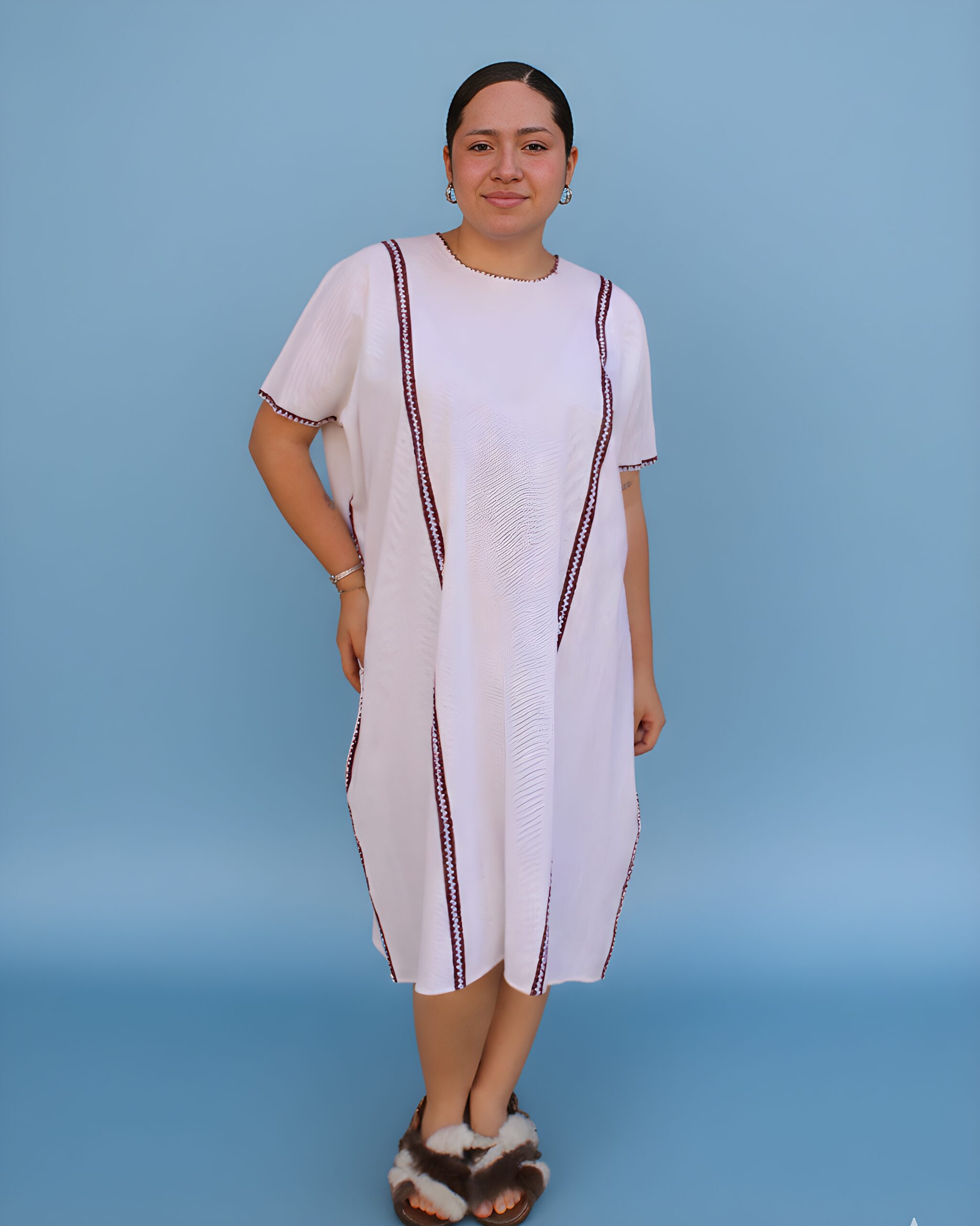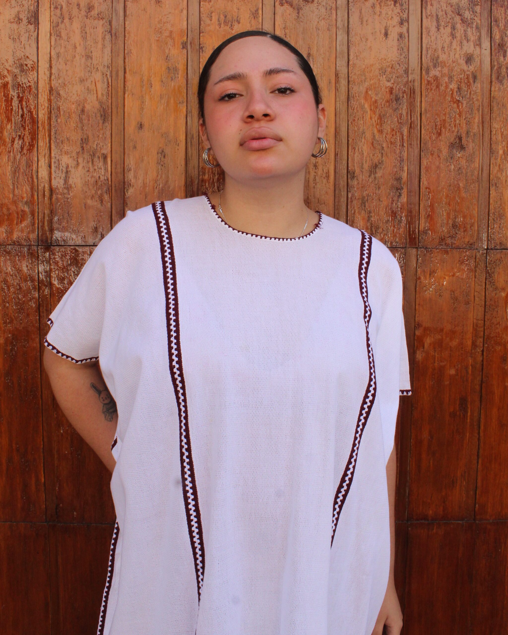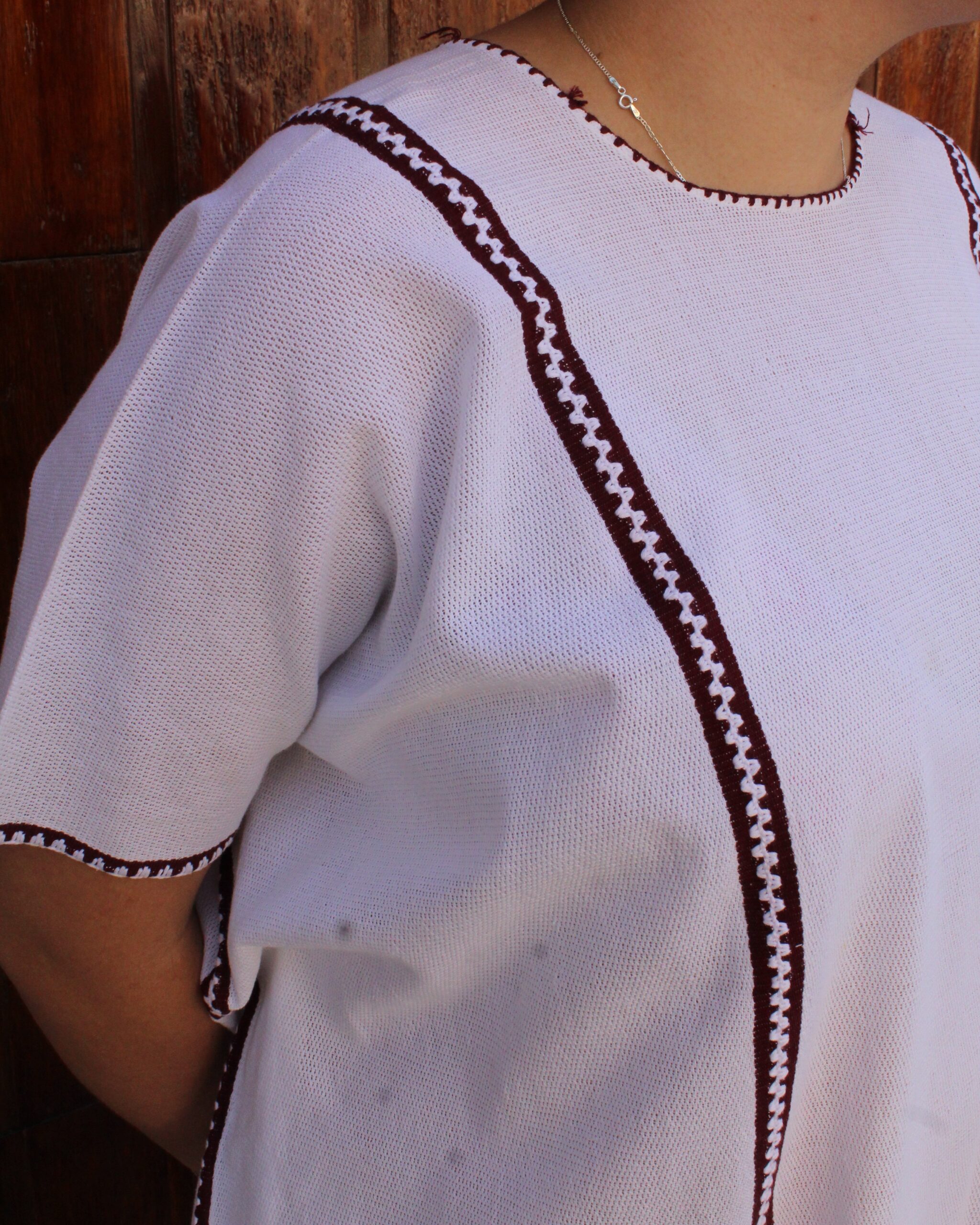 Huipil confeccionado en gasa tipo caparazón de armadillo, en tono blanco, realzado con una orilla color vino que aporta contraste y elegancia. Una prenda ligera y delicada con un toque artesanal único.
