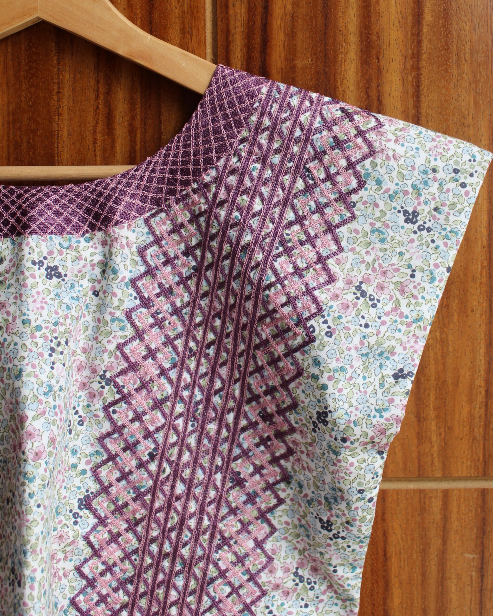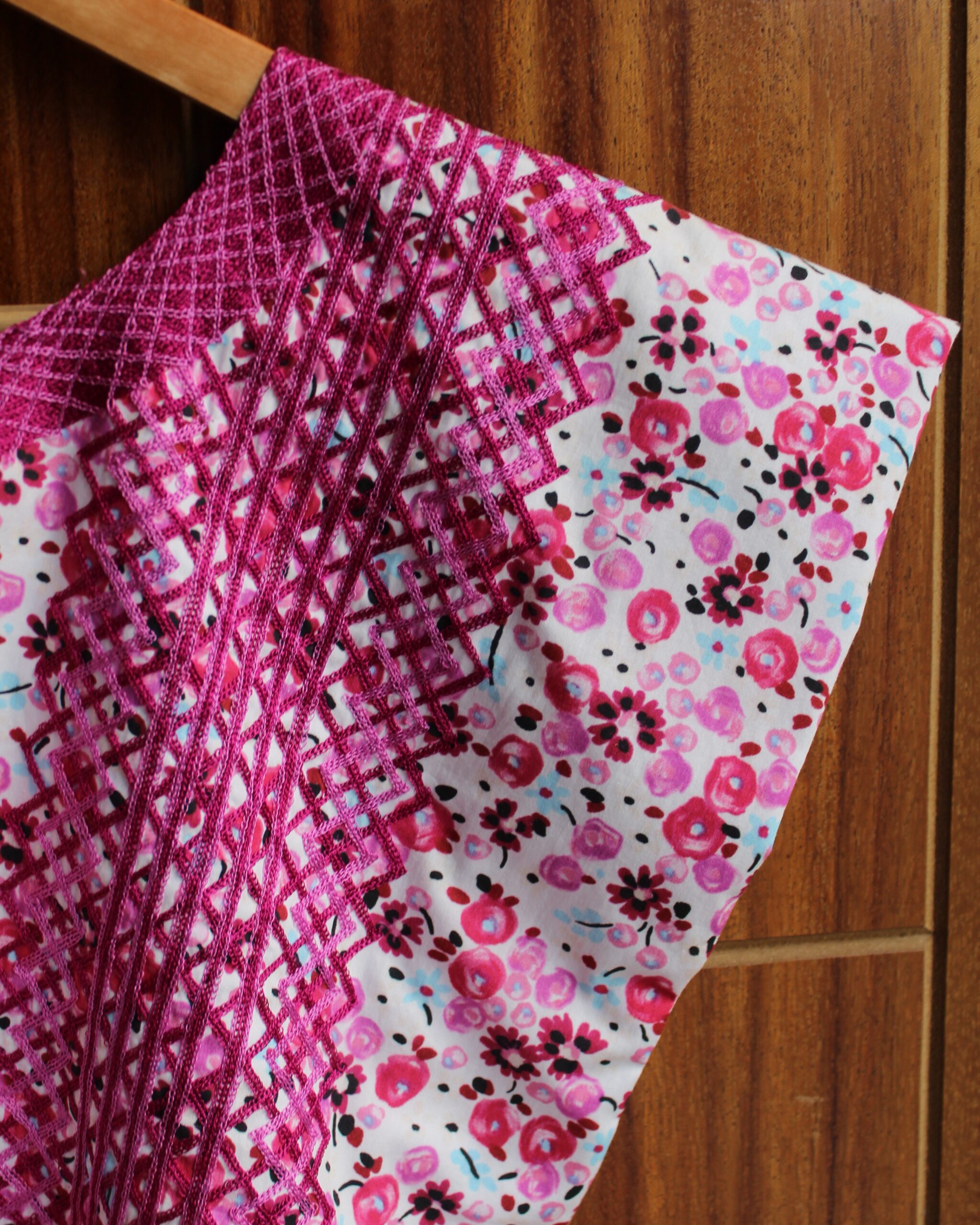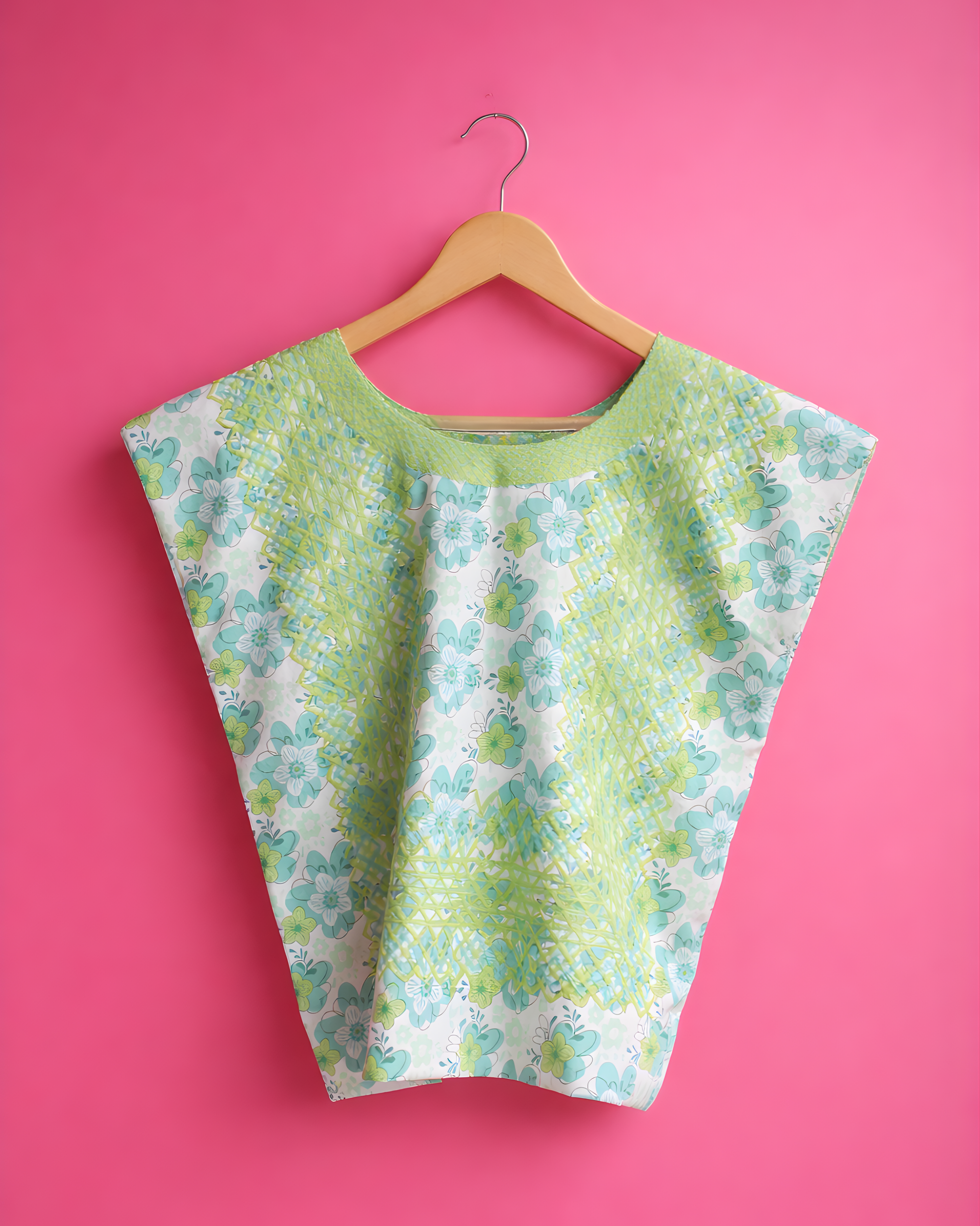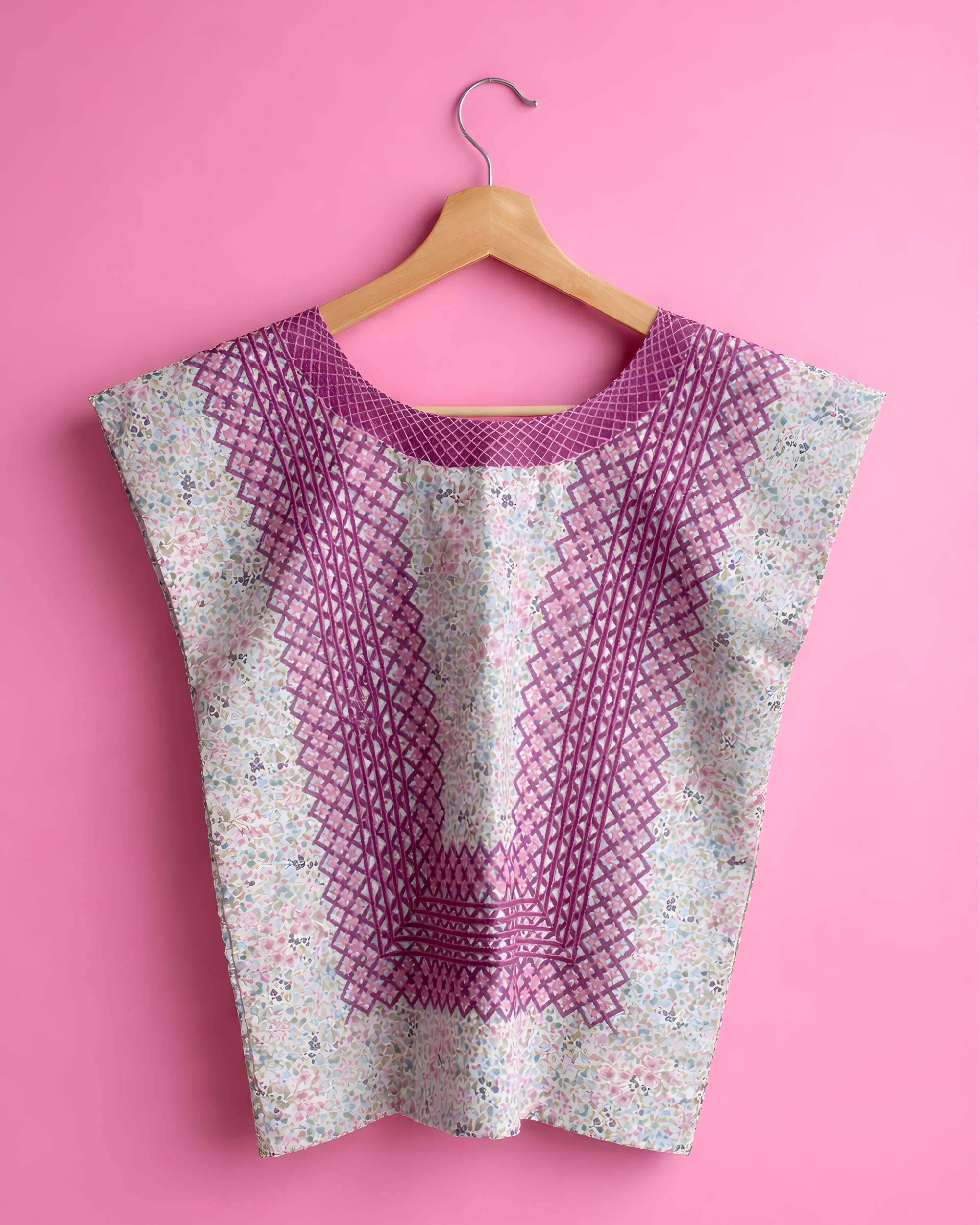 Huipil de cadenilla mixe, bordado en máquina de pedal, disponible en diferentes diseños que destacan por su color y detalle artesanal.