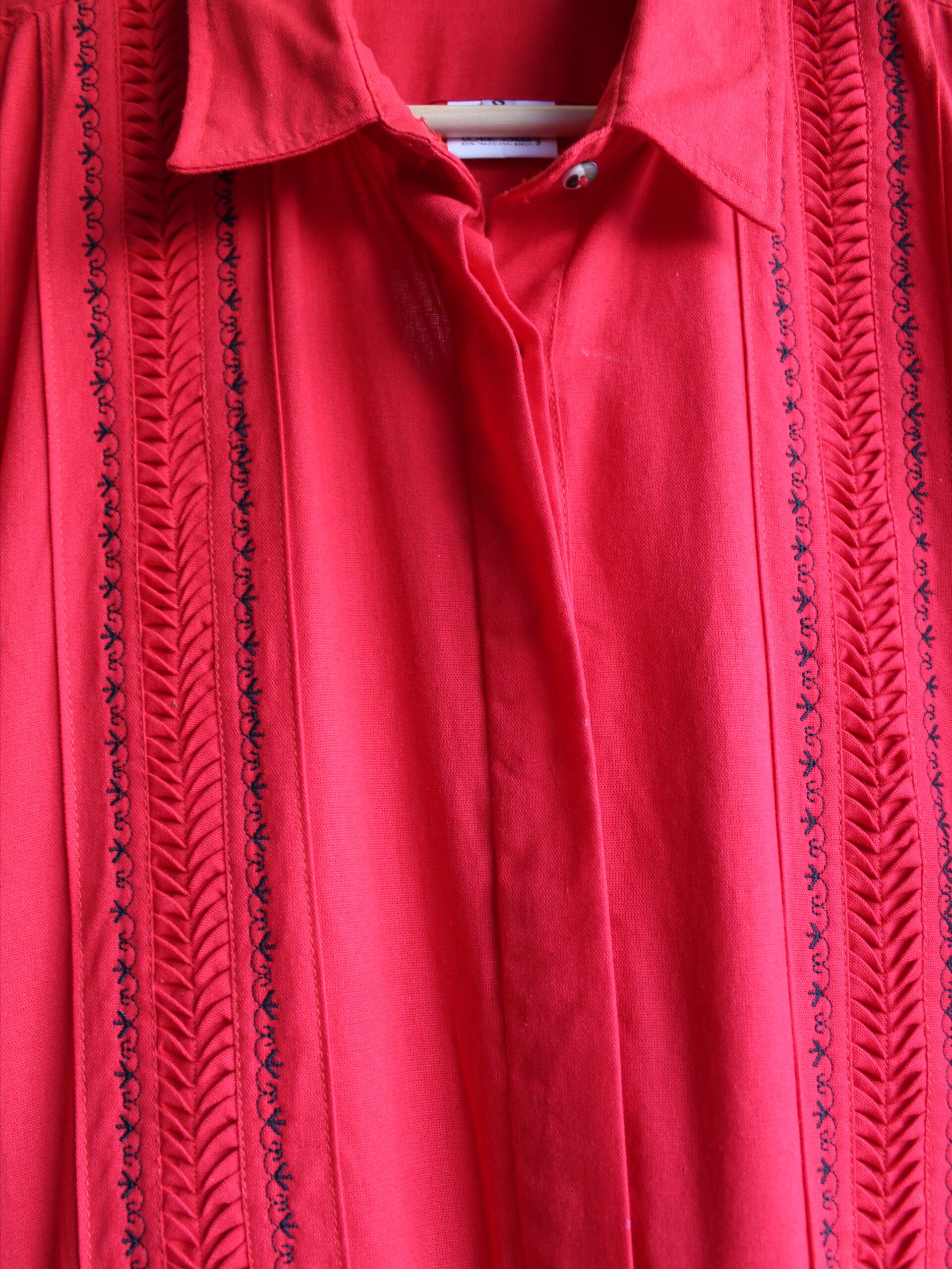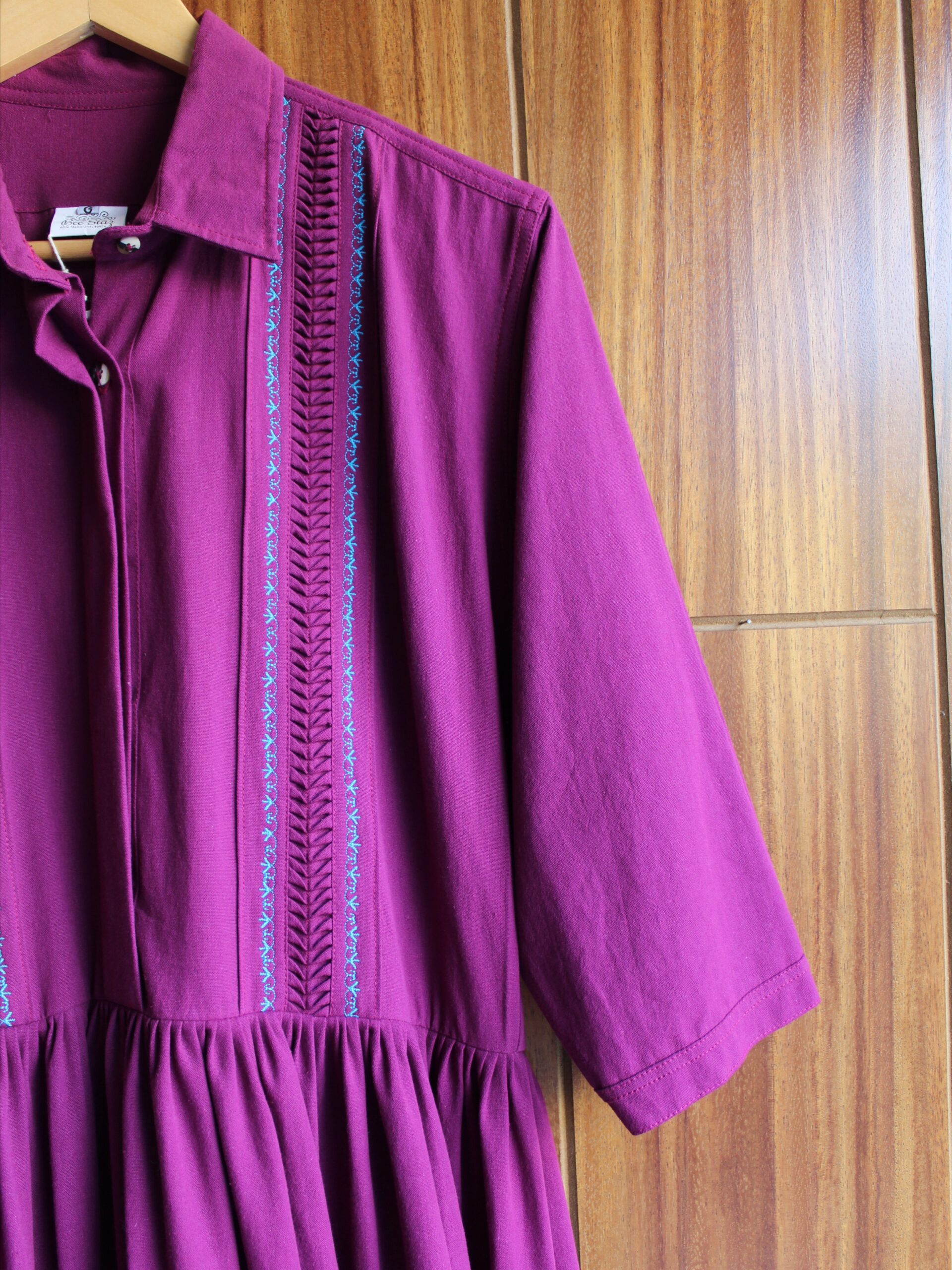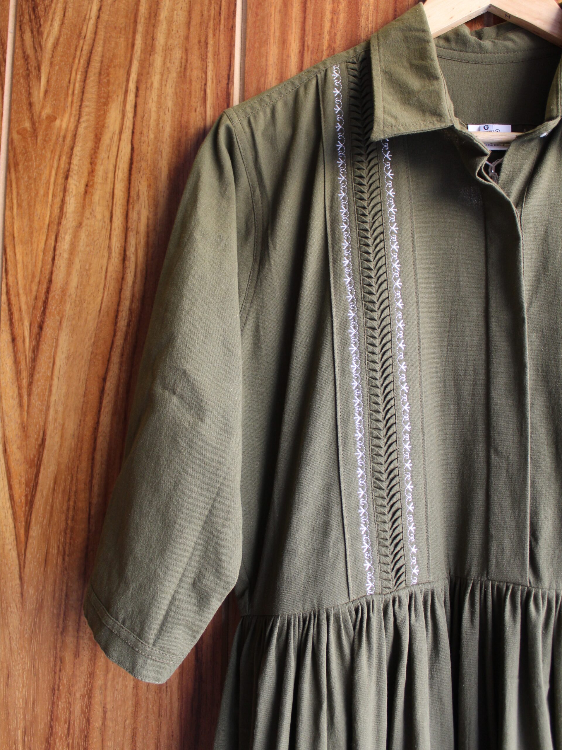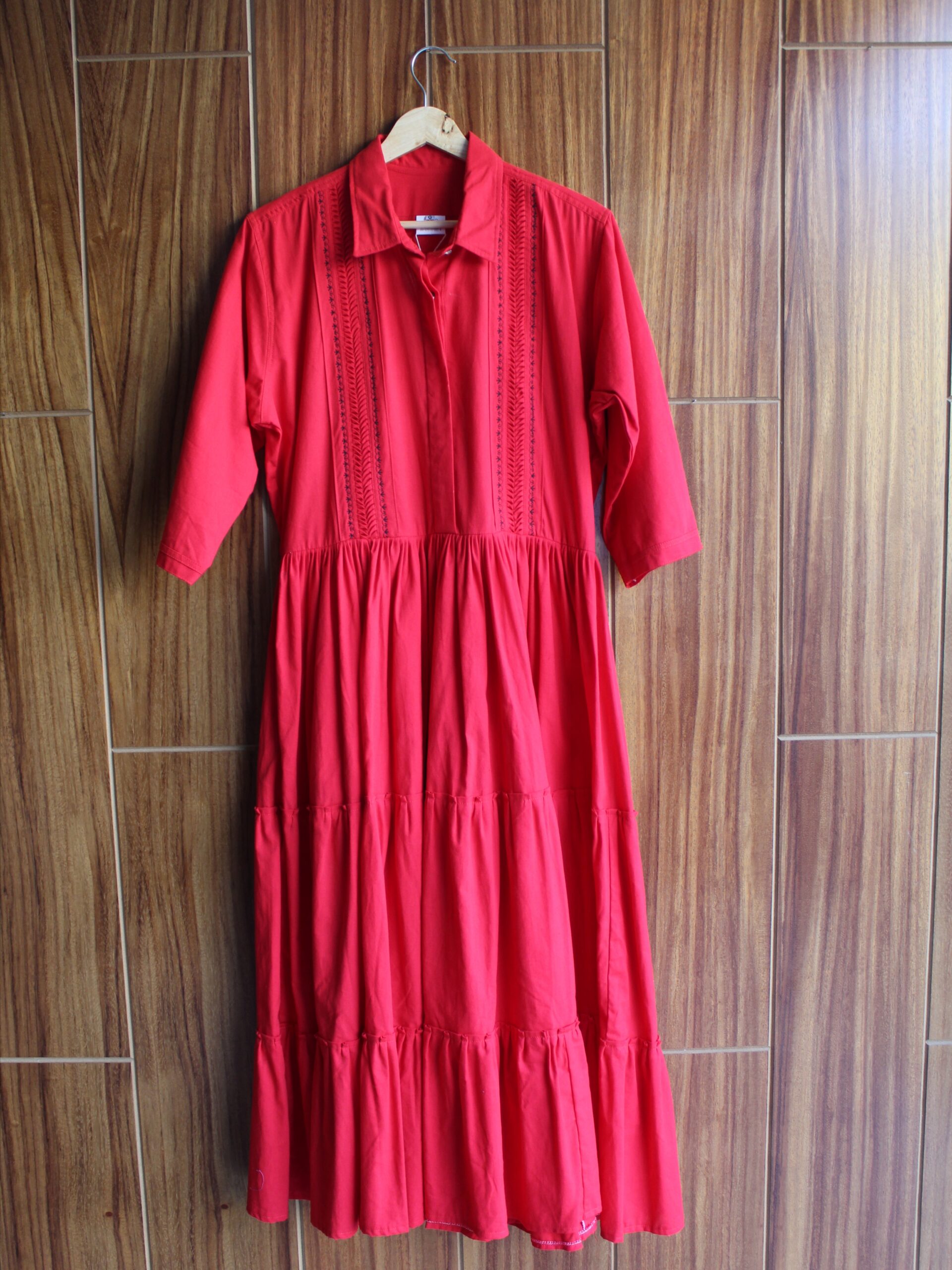 Luce este increíble vestido el cual esta compuesto por una falda amplia, unas mangas tres cuartos y cuello camisero que logran crear una pieza versátil. En la parte alta cuenta con detalles de alforzas y bordado a máquina de pedal.